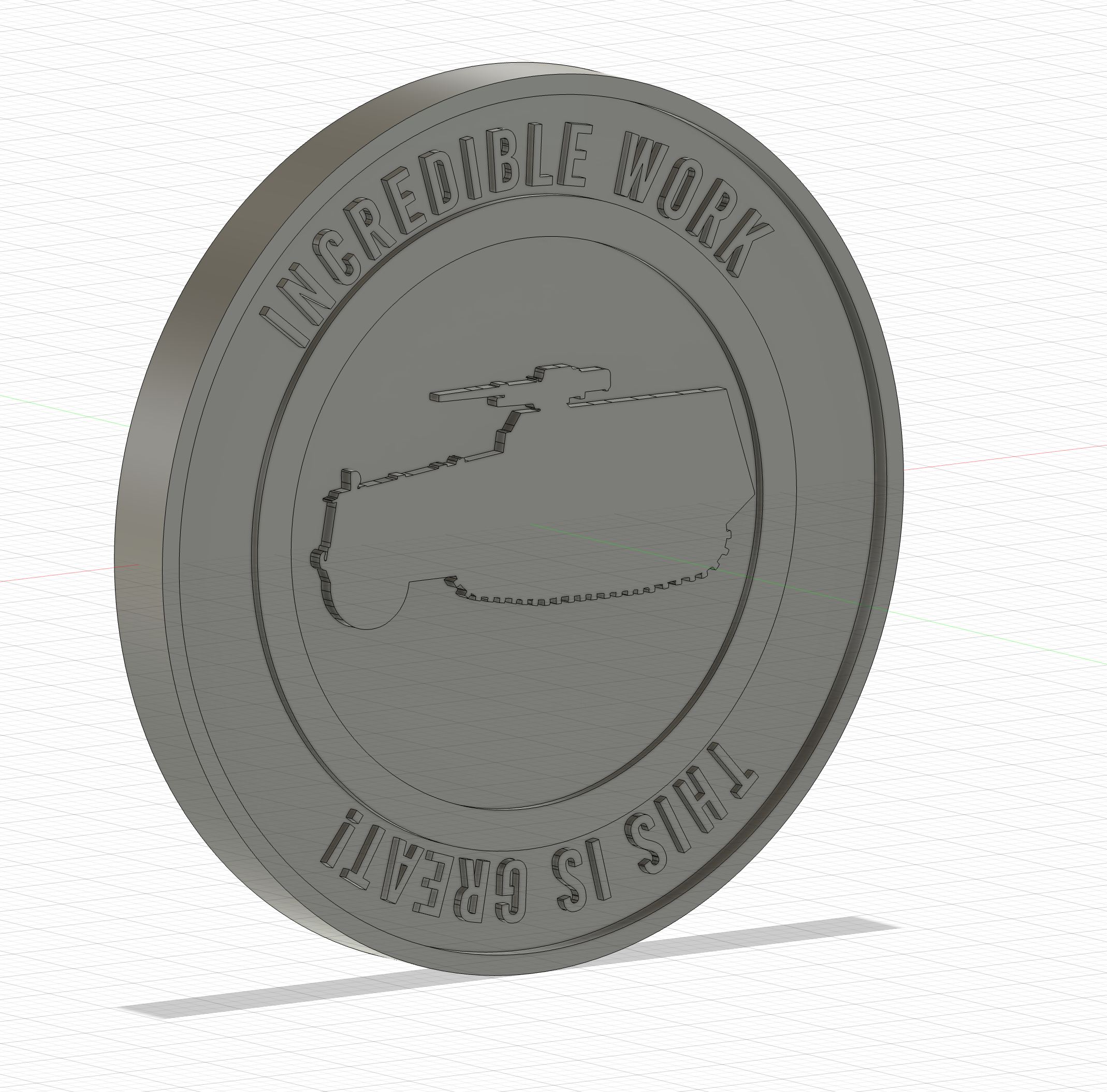 Between that conversation with Matt at Nats23 and last week, I’d learned how to use Fusion 360. It dawned on me that I could just make my own coins. So in about 1.5 hours, I banged out a mk.1 coin and printed 5 (the most that would fit on my printer’s build plate). I didn’t paint them in any way, just took them in raw resin gray. (The last thing I did before I left the house to drive to the show was cure them… that’s how close I cut it)