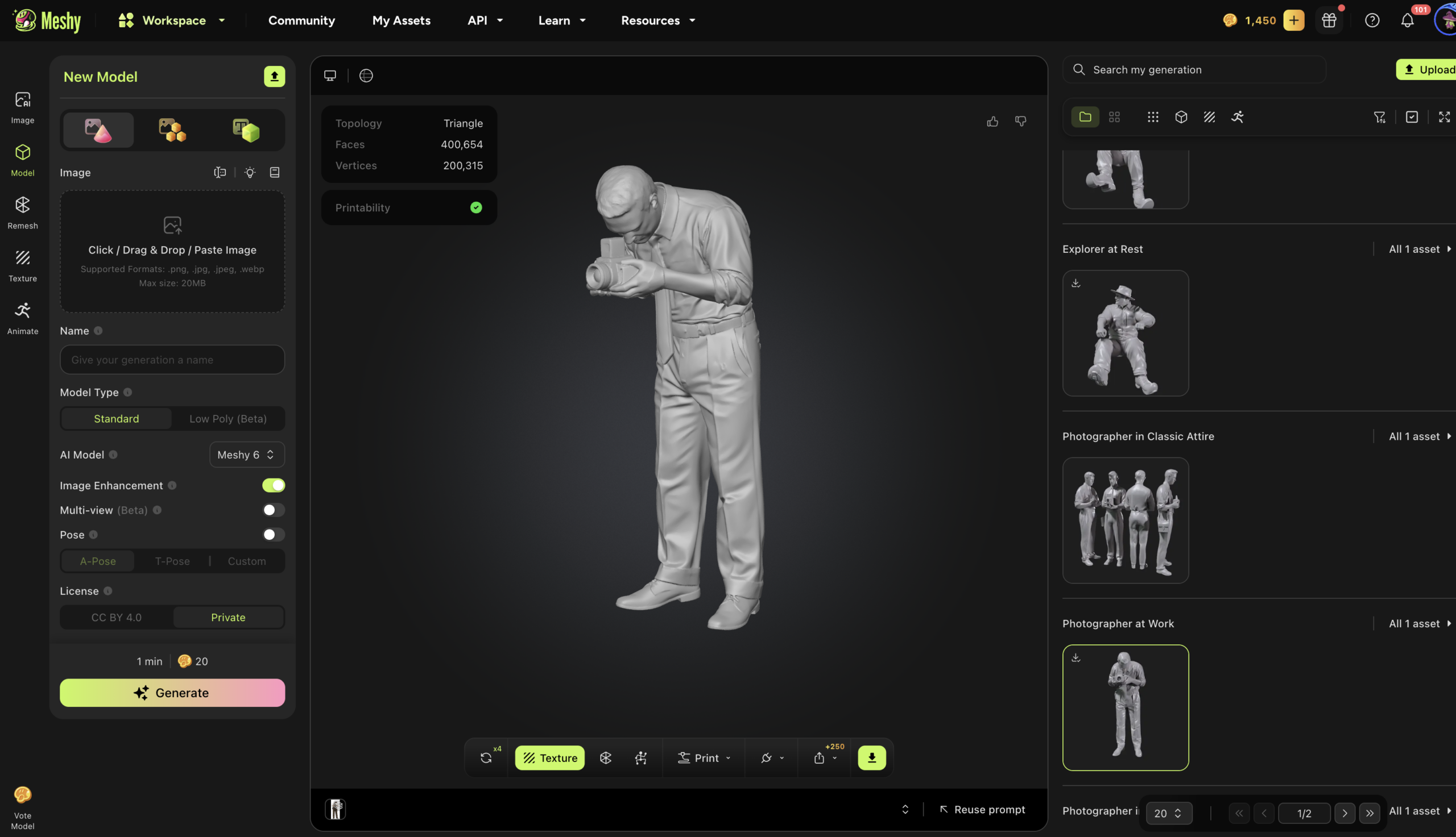 Both platforms operate on a credit system, so there is a cost per conversion. Neither guarantees a usable result on the first try. The tool sometimes needs to be re-run several times before it produces something printable. For a simple, upright figure, a good result might come on the first or second attempt. For a complex, seated figure, you might run it a dozen times over several weeks as you work and tweak.