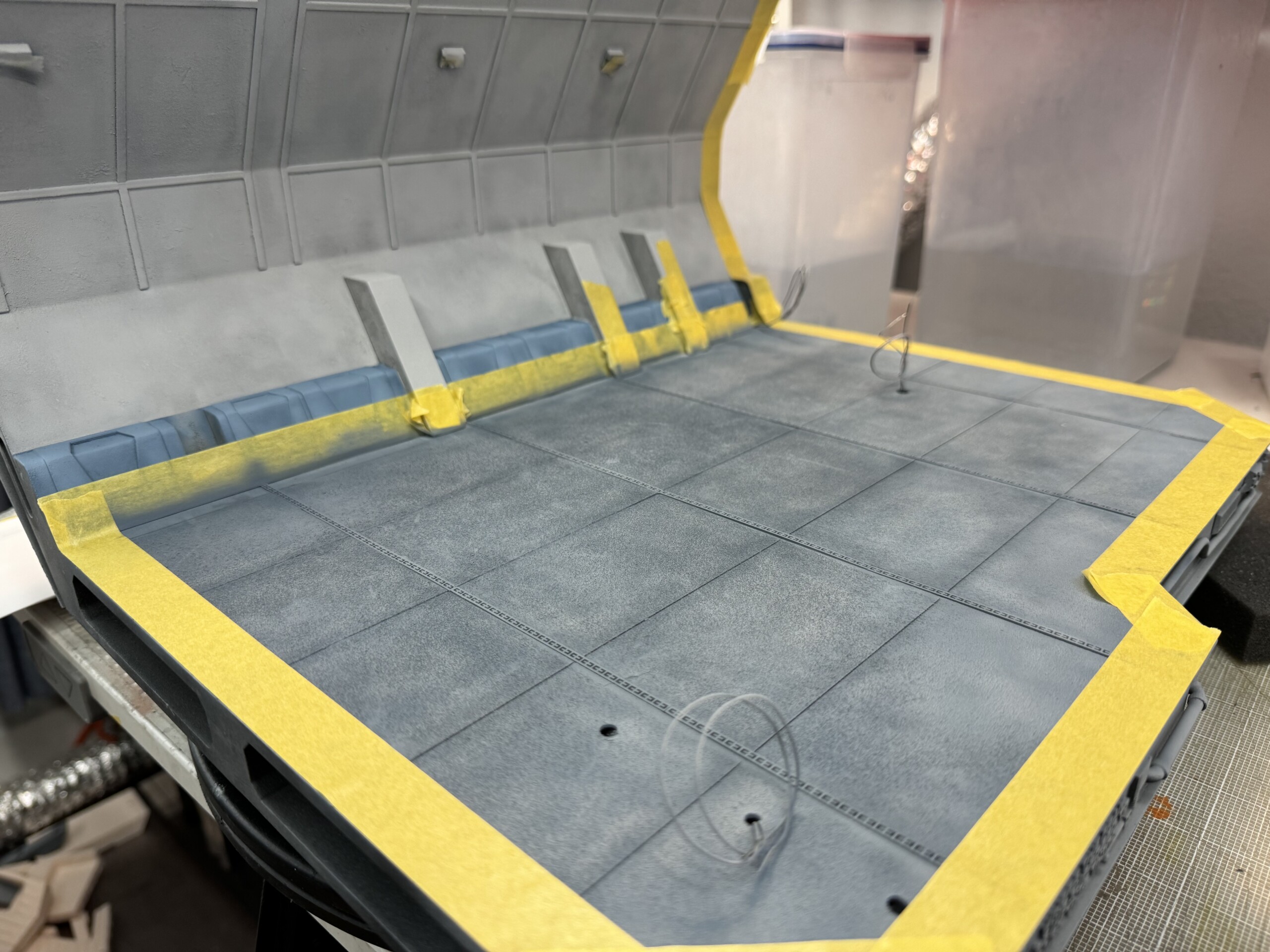 Once everything was glued, textured, primed and ready for paint, the mass volume of Tamiya paint usage began. This things big and sucked up paint like mad. Especially since I had to spray and spray again to adjust tones to get them where I wanted. White(ish) vertical walls, tan gray interior wall and deck color, Tamiya German Grey sides, blueish grey exterior colors as well as dark gray base color under the exterior panels.