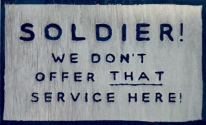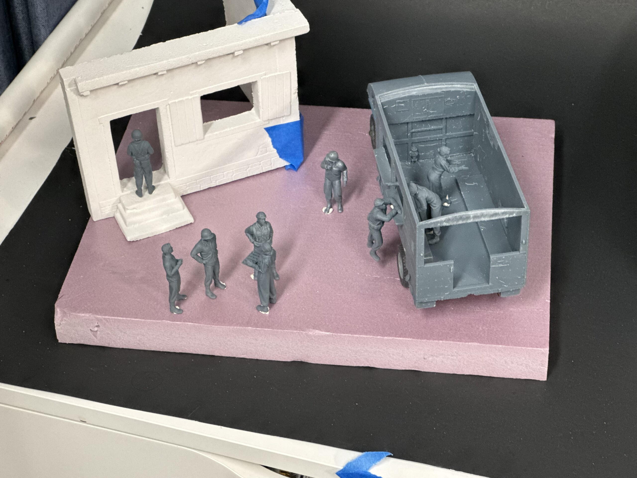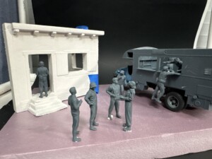 I found a great set of figures on Etsy for a Clubmobile scene, generally speaking. A group of soldiers and a crew of three Clubmobile women. It took some time trying to figure out the “story” of this diorama. I had been reading a number of accounts about the Clubmobile history and the stories the women had. Or better yet, the stories about sexual harrassment, returning home to families who said things like “you were only serving donuts, why are you saying you had a hard time”, and so much more. One of the figures from the set was a woman leaning over the counter and pointing. I had a flash of inspiration.