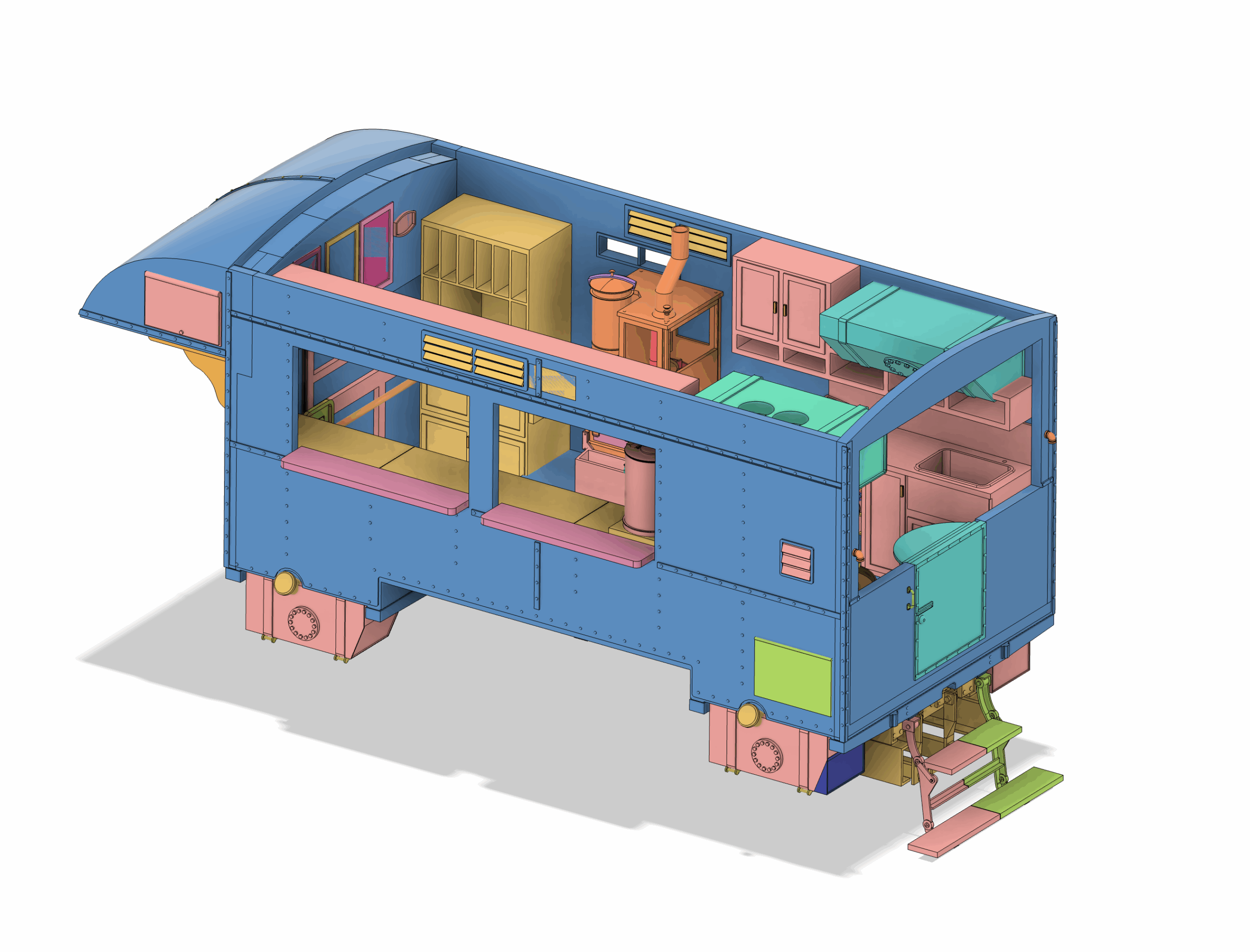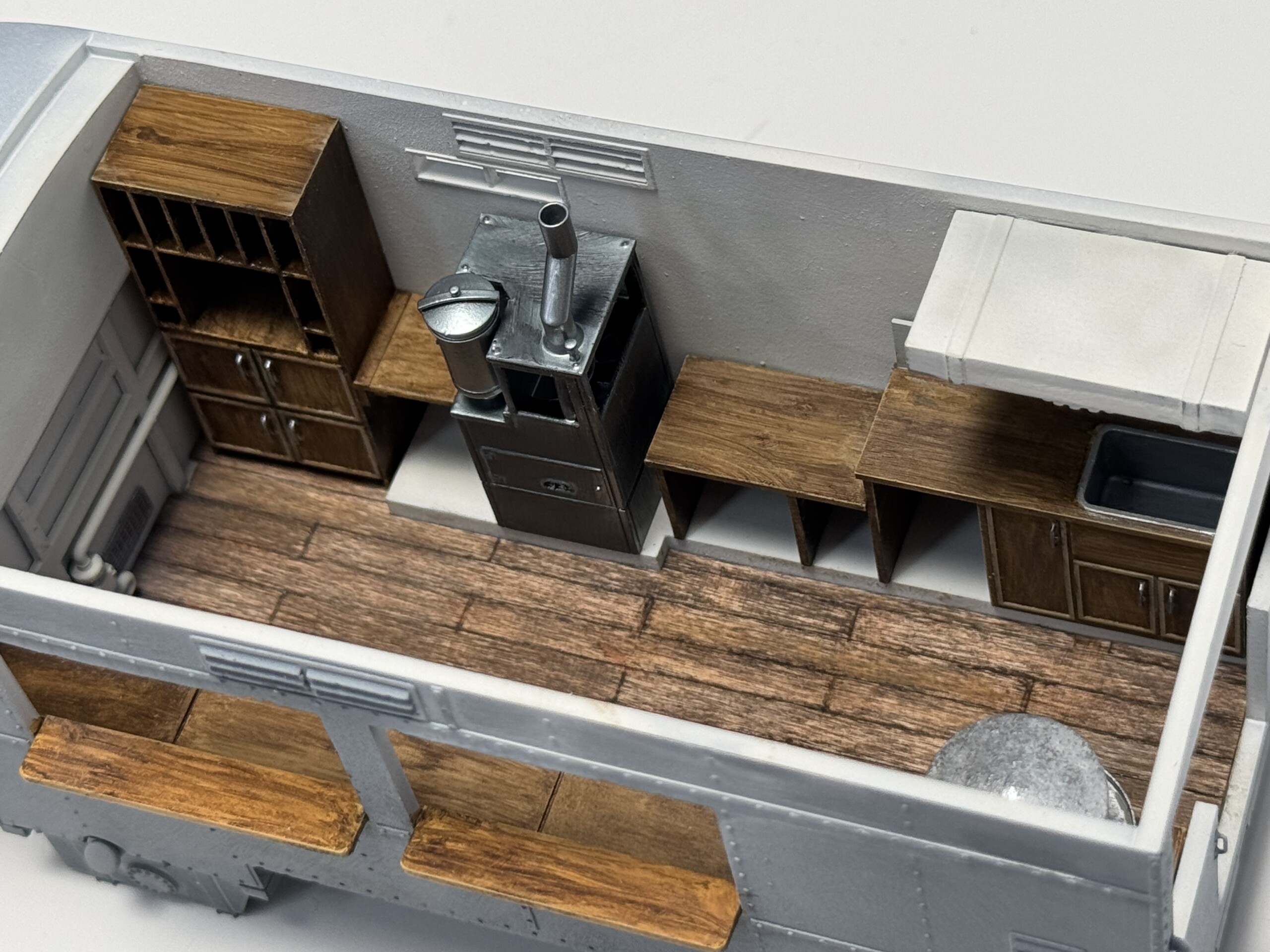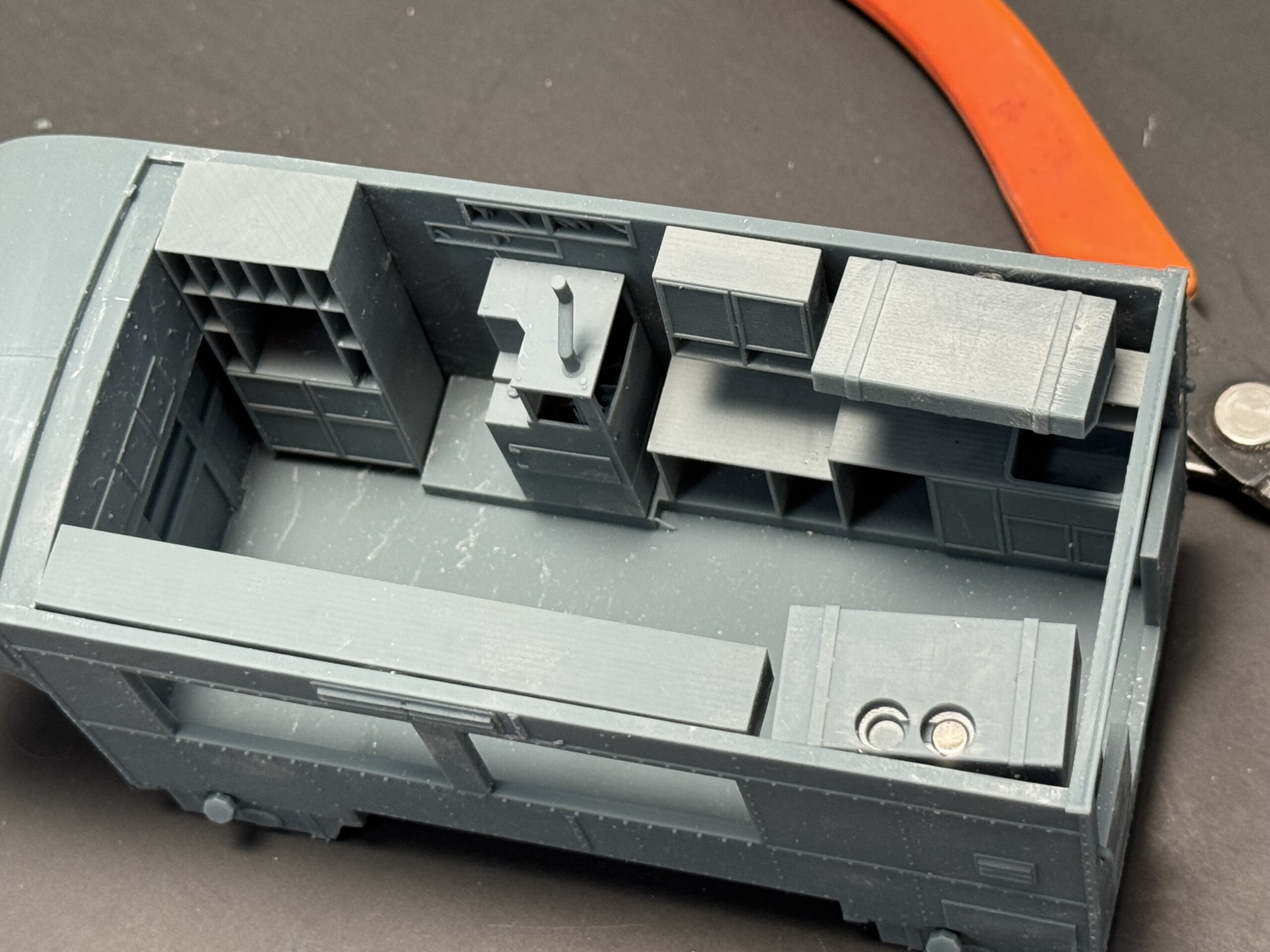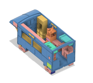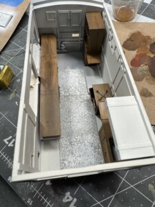 The interior reference material is TOUGH to find. I probably found less than a dozen helpful images of how the GMC Clubmobile (vs. the initial London Bus version) was laid out inside, or what each of the interior equipment/cabinetry elements actually looked like. I spent hours googling and generally figured out the elements of the interior. At least close enough. (I’m sure I’m going to stumble across a cache of great images as soon as I’m done with this project…)