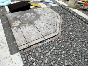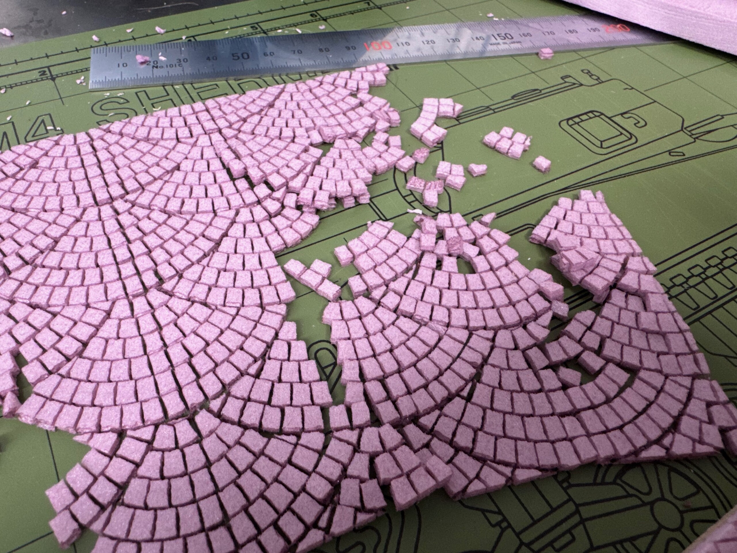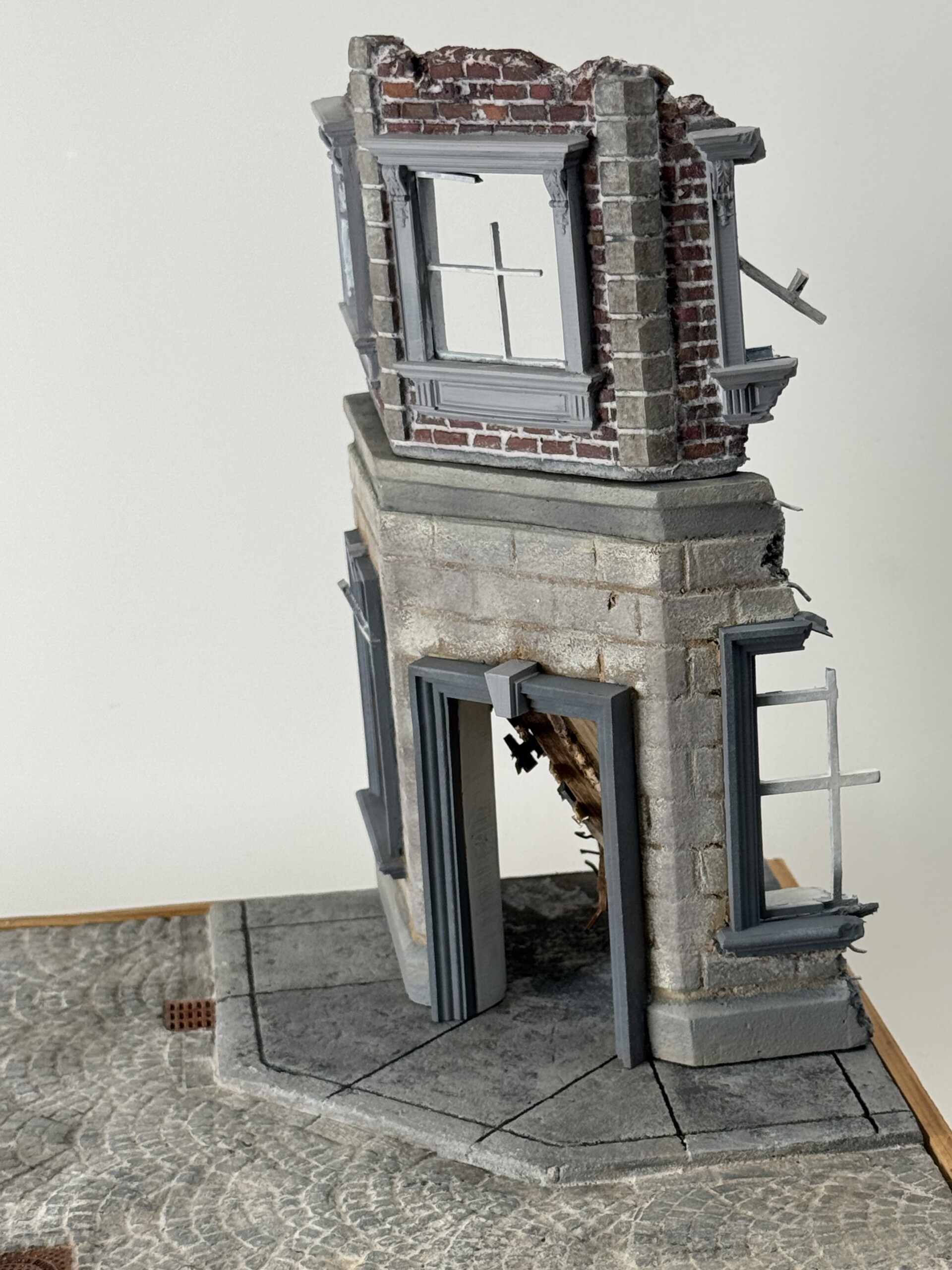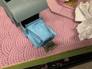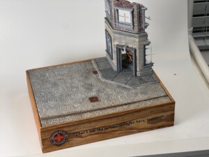 I also started testing the base + foam. It looked pretty good. But I realized pretty quickly that I wanted to have a single railroad rail coming through the diorama to add some fun to the city street “texture”. But when I put it straight in the cobblestone fans, it didn’t look right. Some quick research made me realize that inside the two rails, the stones are more often than not laid straight not fanned. So I cut out and replaced that area with a new laser cut piece of foam.