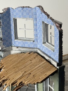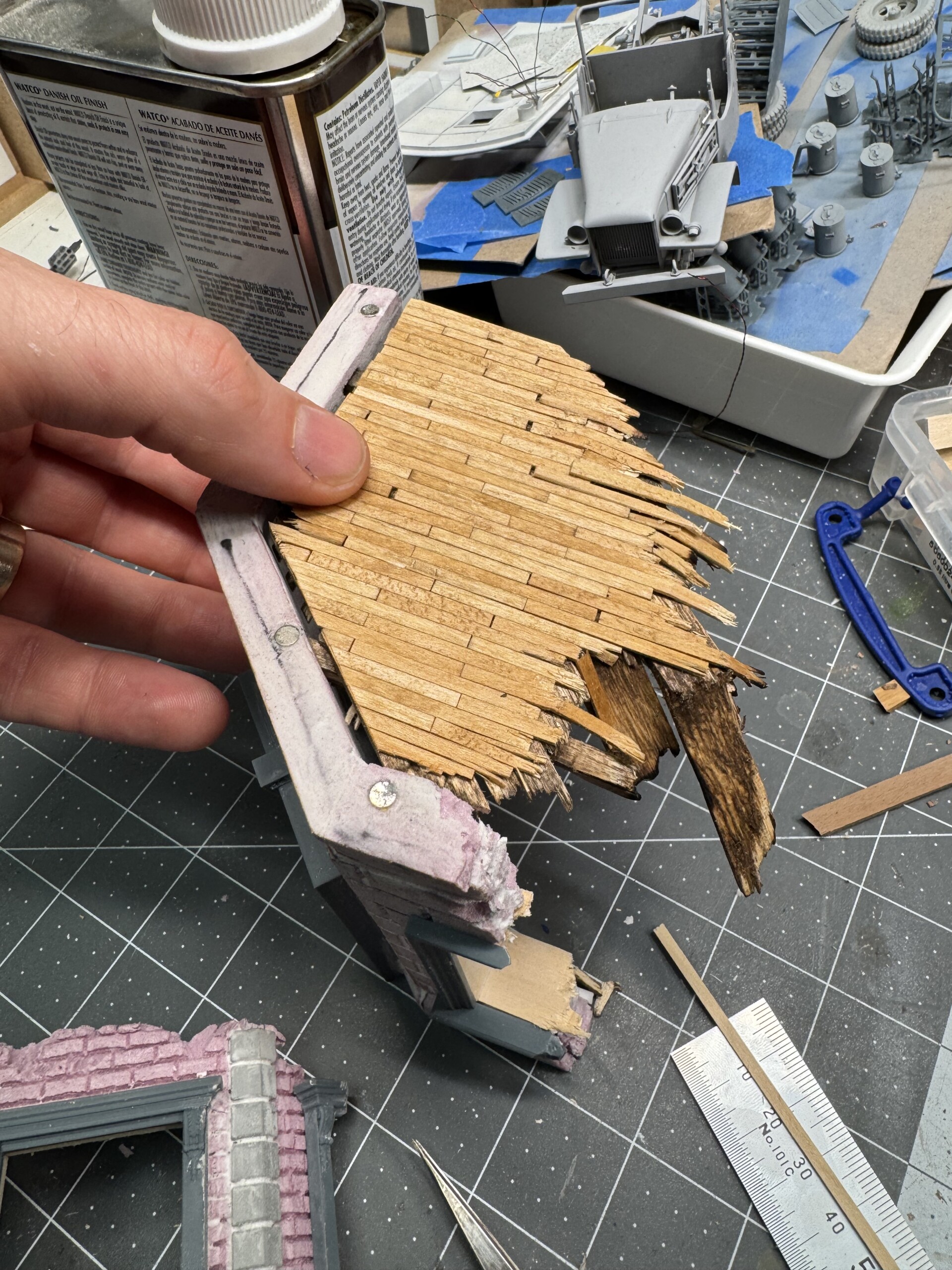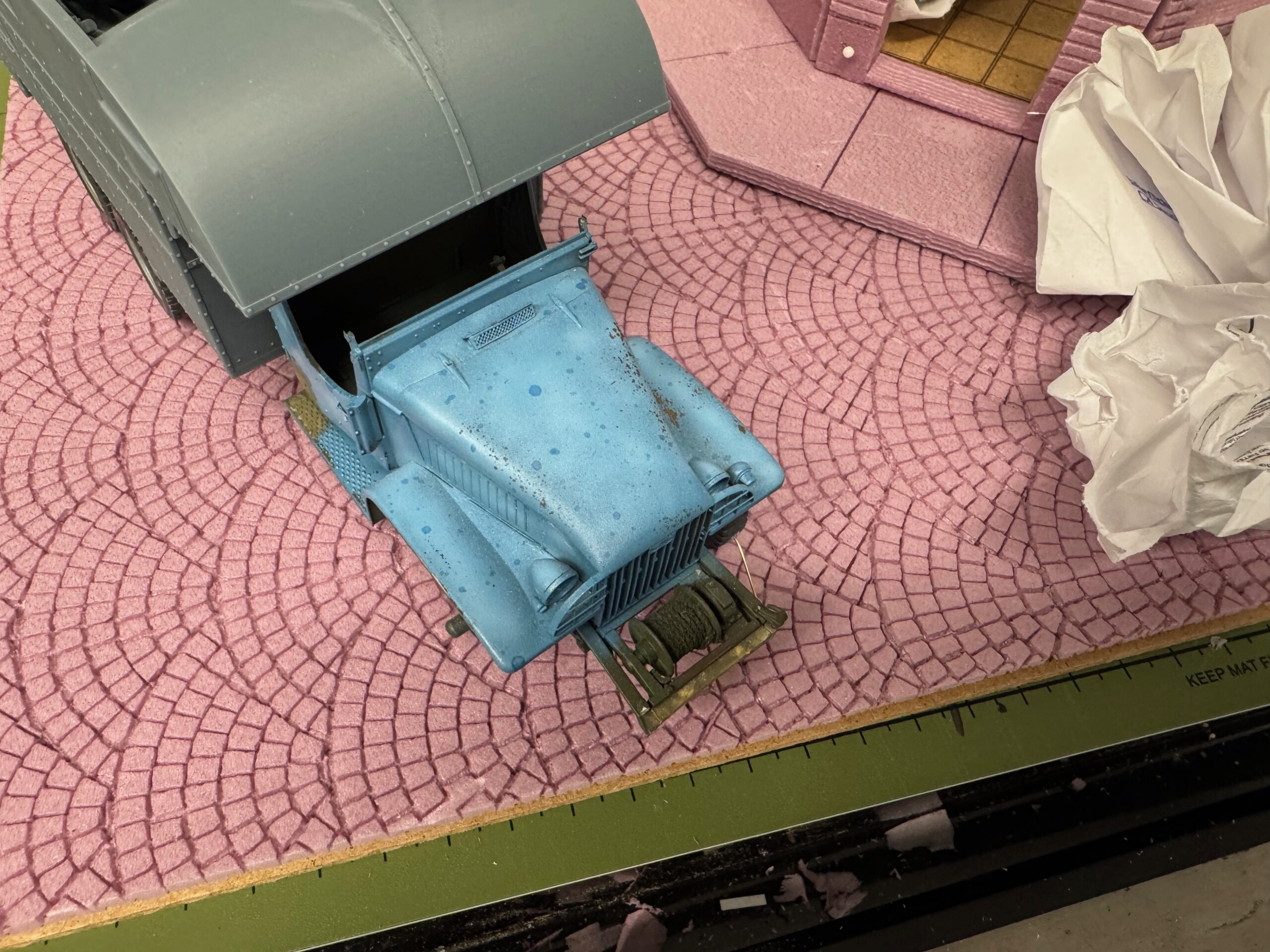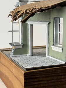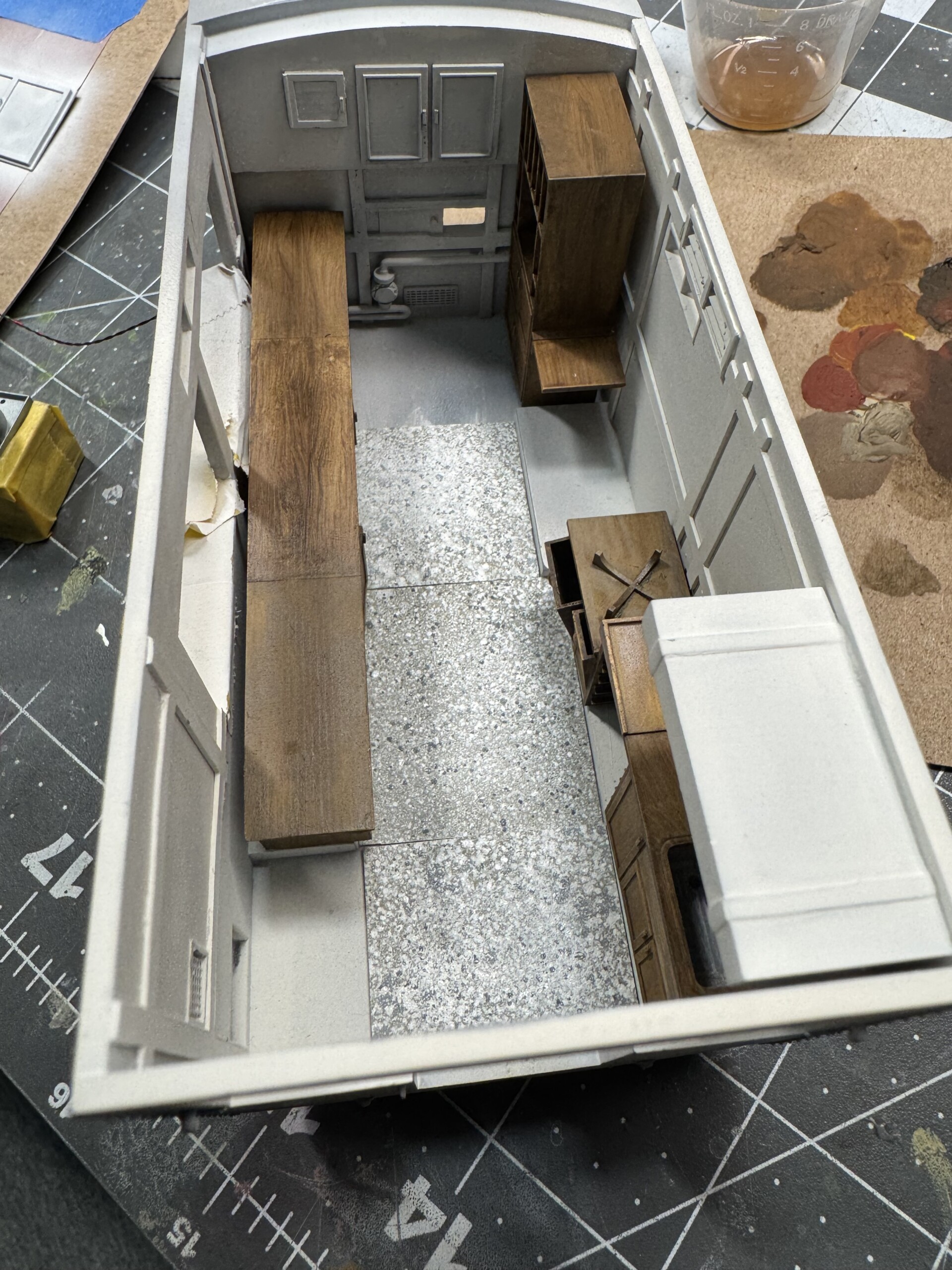 I also realized after I’d painted and glued down the wood flooring (laser cut basswood sheet) that the Clubmobiles actually used linoleum. So out it came. Here’s a couple pics of my first attempt at 1940s style linoleum. Needless to say, I’ll be going back to the start on this particular paint job!
