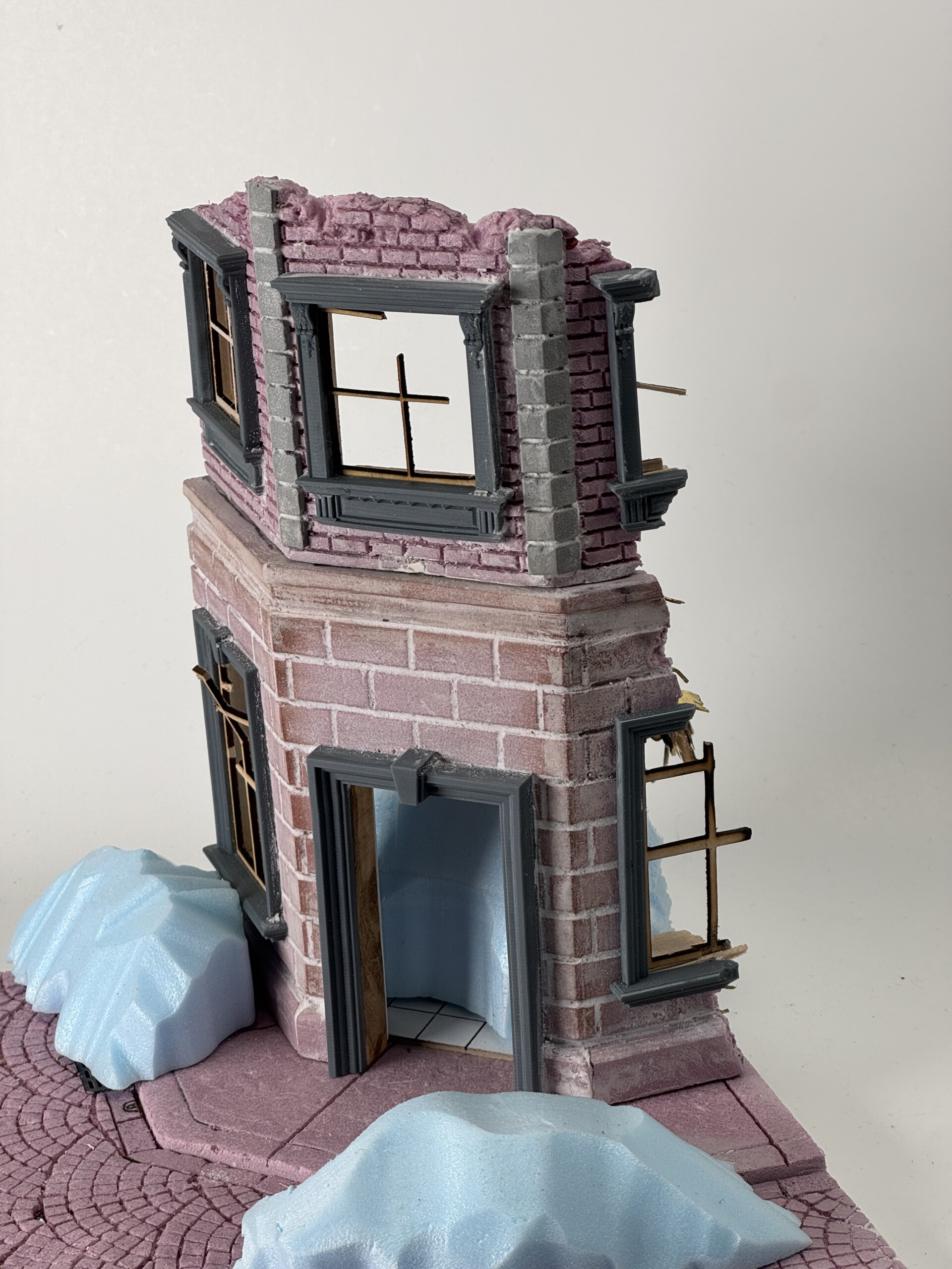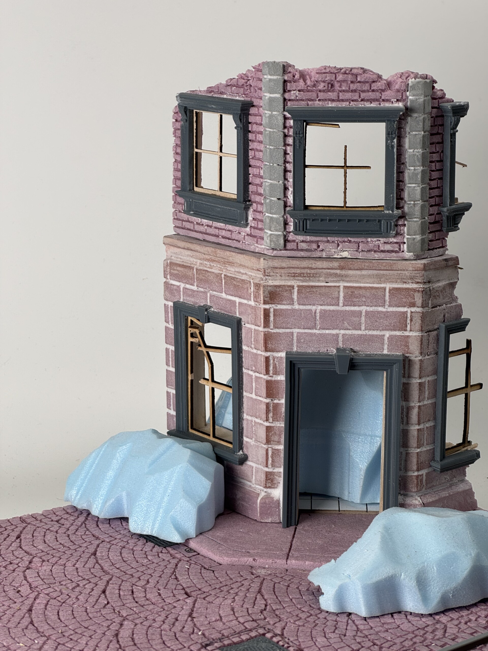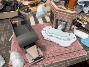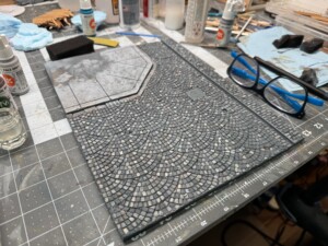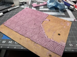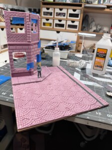 On top of the MDF I glued down two pieces of insulation foam, one cut to size for the sidewalk and building foundation, and one for the cobblestones. The cobblestone pattern was laser engraved (not cut all the way through, just cut about halfway down the piece of foam). This looked great on both counts and allowed me to weather, damage, and generally beat it up to look pretty realistic. You can see the first pass at the pieces of foam here: