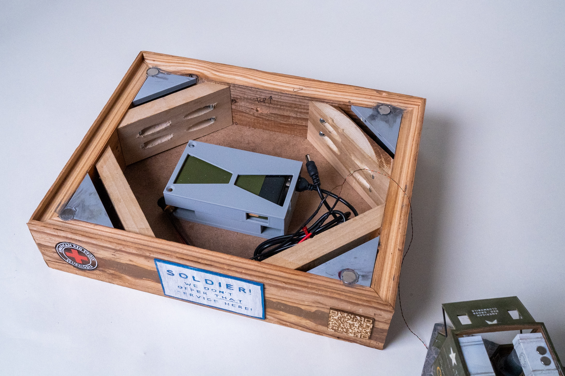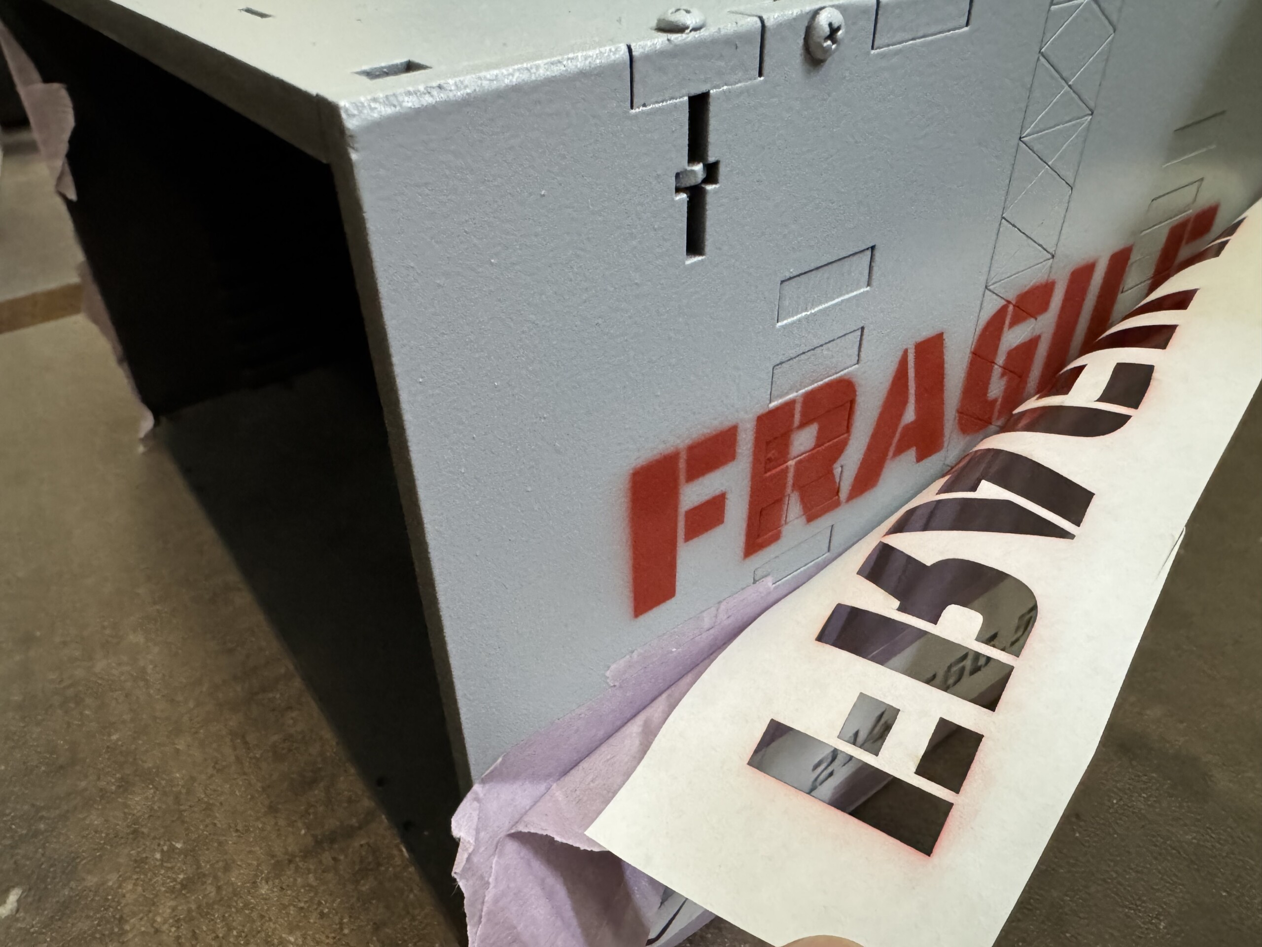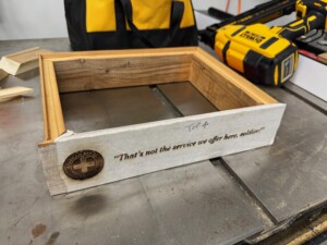 The solution was to paint over the etching with a matching color and then I decided to go in a different direction all together and laser cut a title plate. This design was based on the hand created signs that the Army put up as they moved through Europe to warn of various dangers. This also pushed me to shorten the overall title… less words are better than more. I love how it turned out!