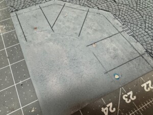 I painted the concrete base coat with grey acrylic paints, stippled on various shades of grays and lighter blacks to give it some wear look. And of course before I did this, I beat up the edges and added some texture on top by plucking with tweezers and rolling with a ball of aluminum foil.