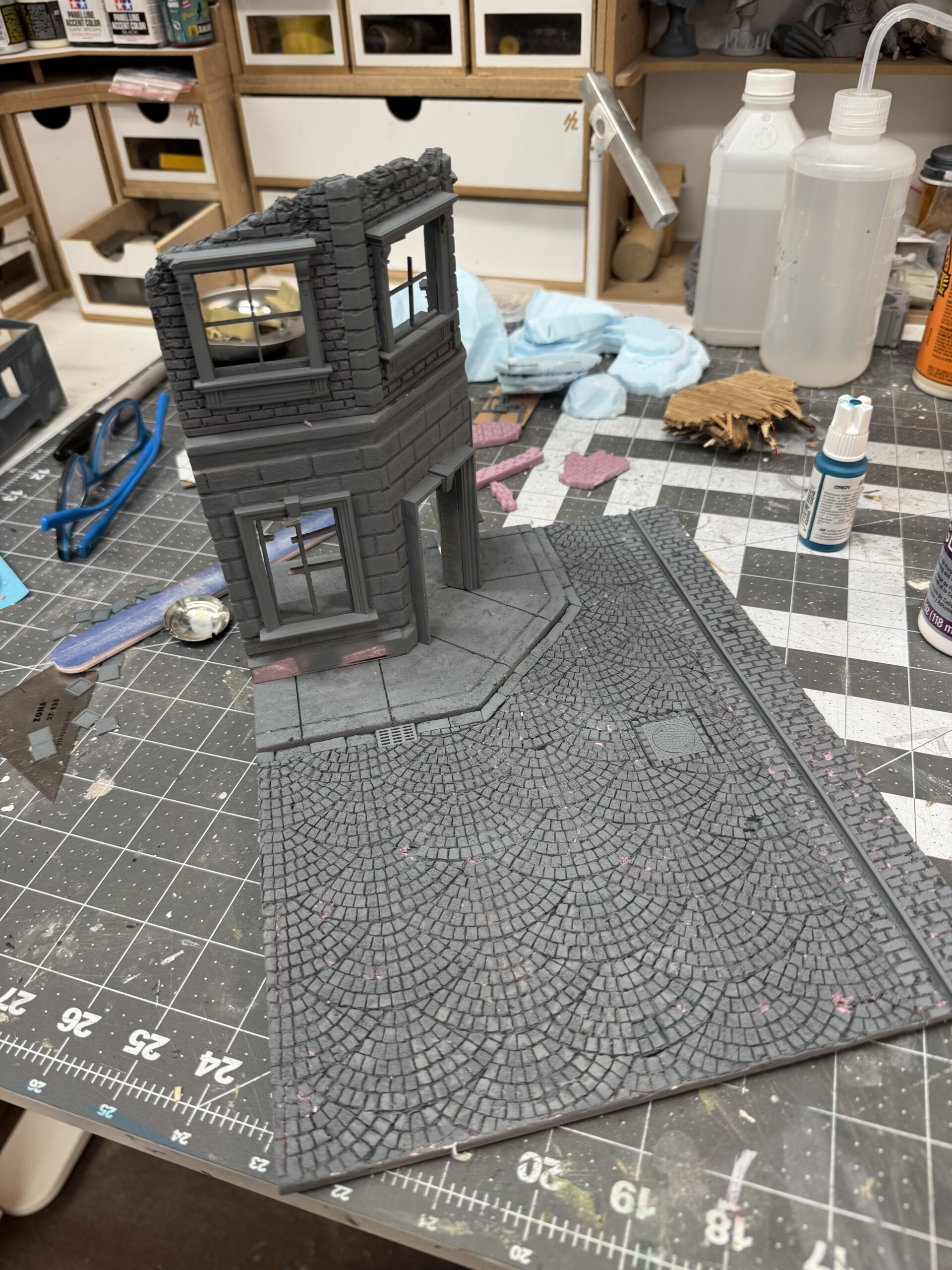 Then it was time to paint the cobbles. I used several shades of greys, tans, and whites. Turned out pretty good for a base!