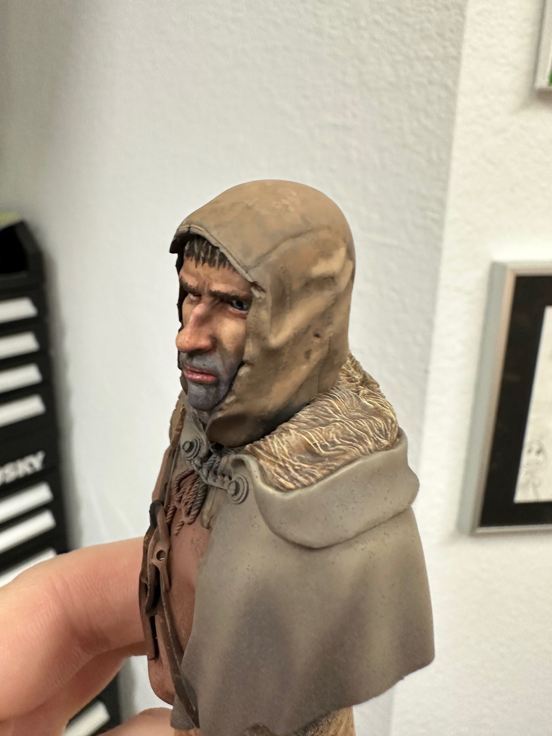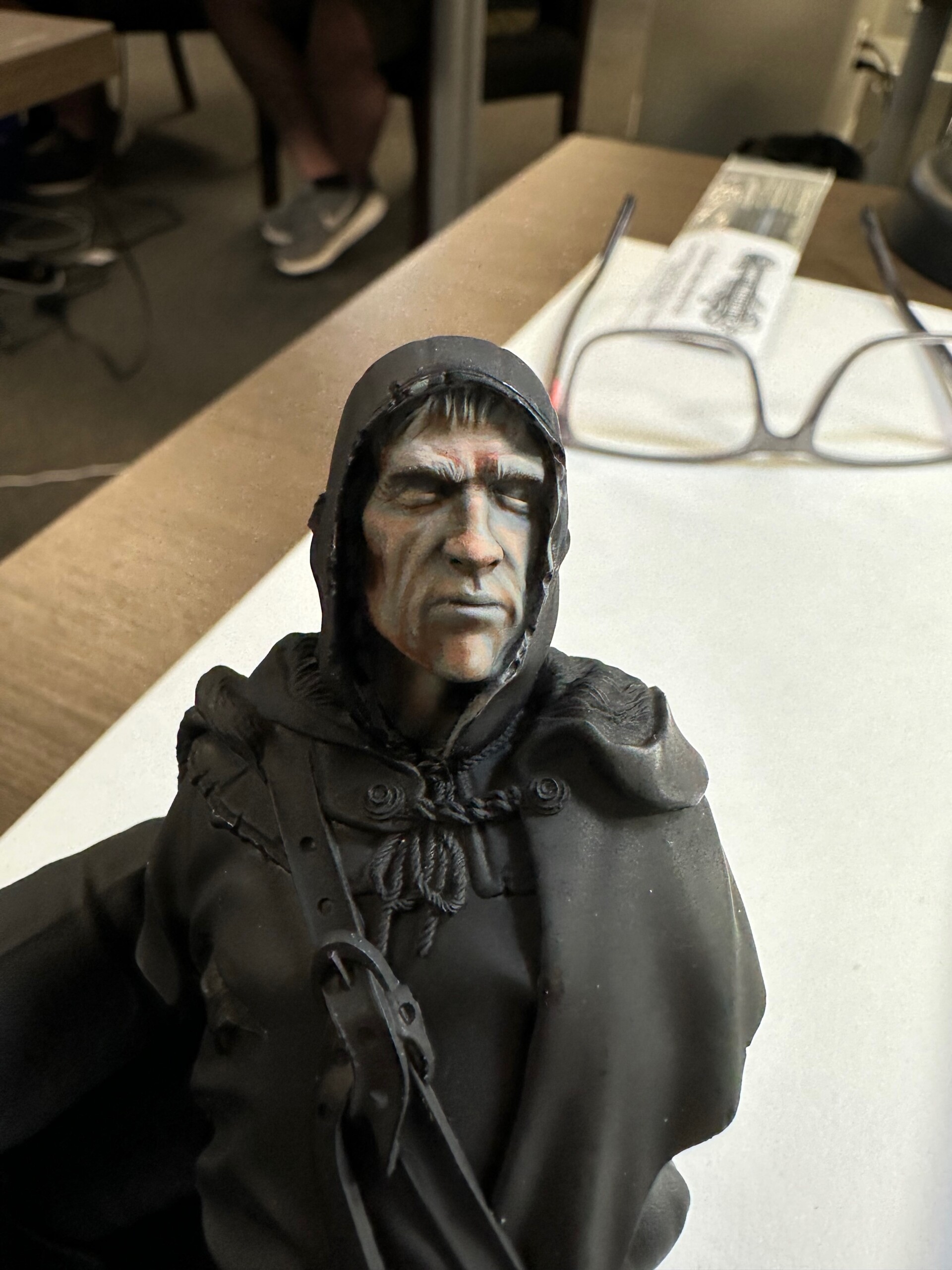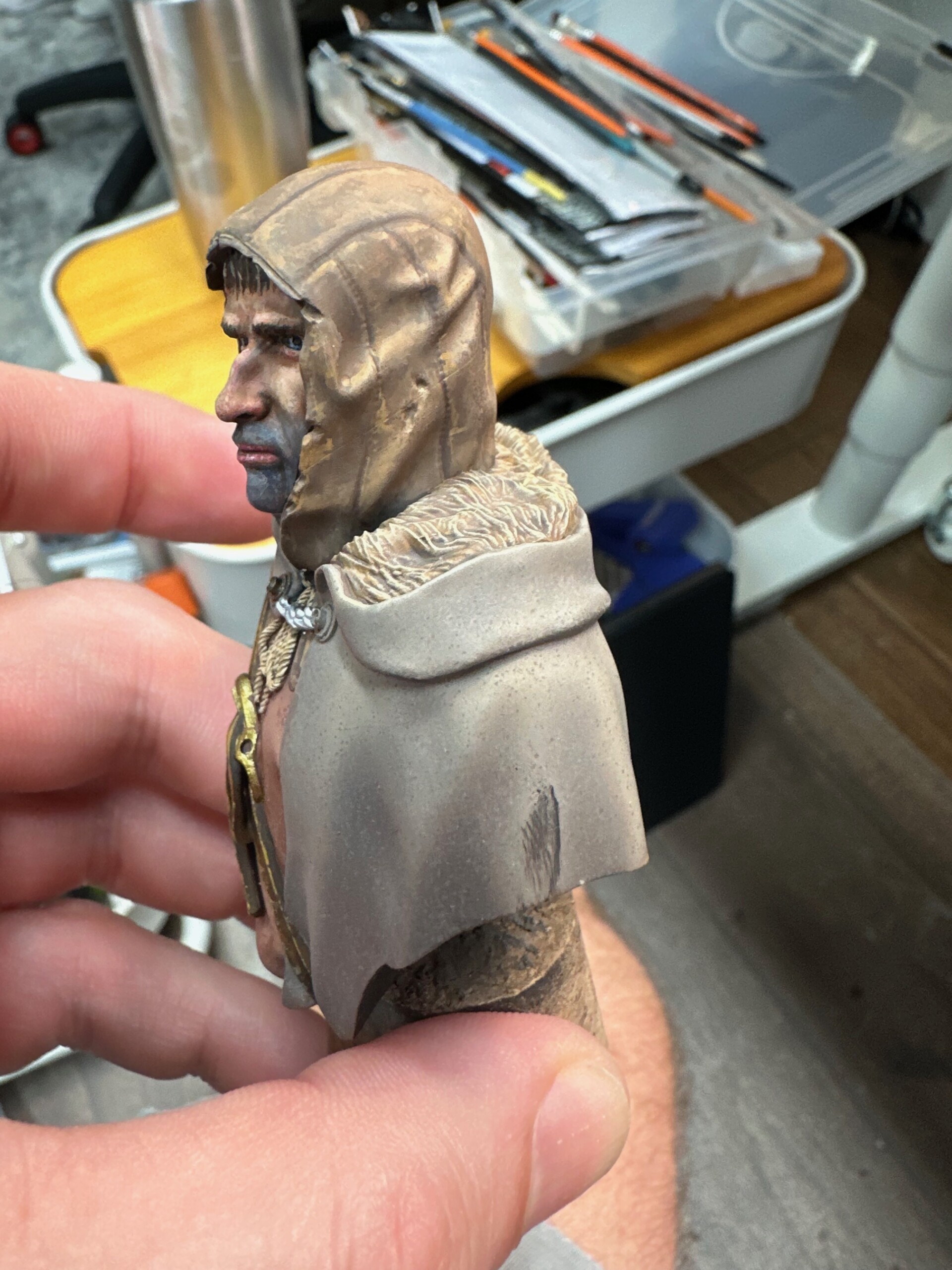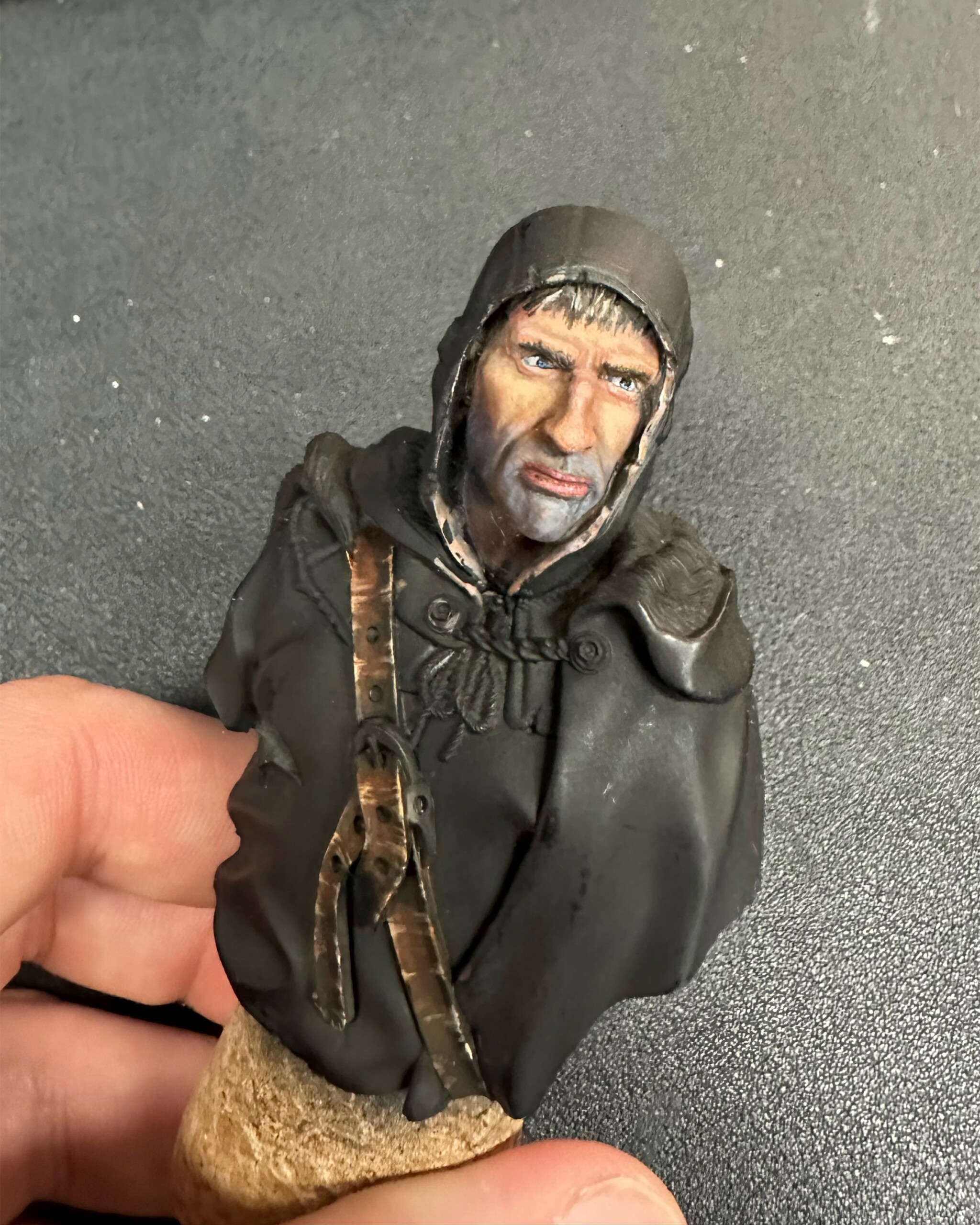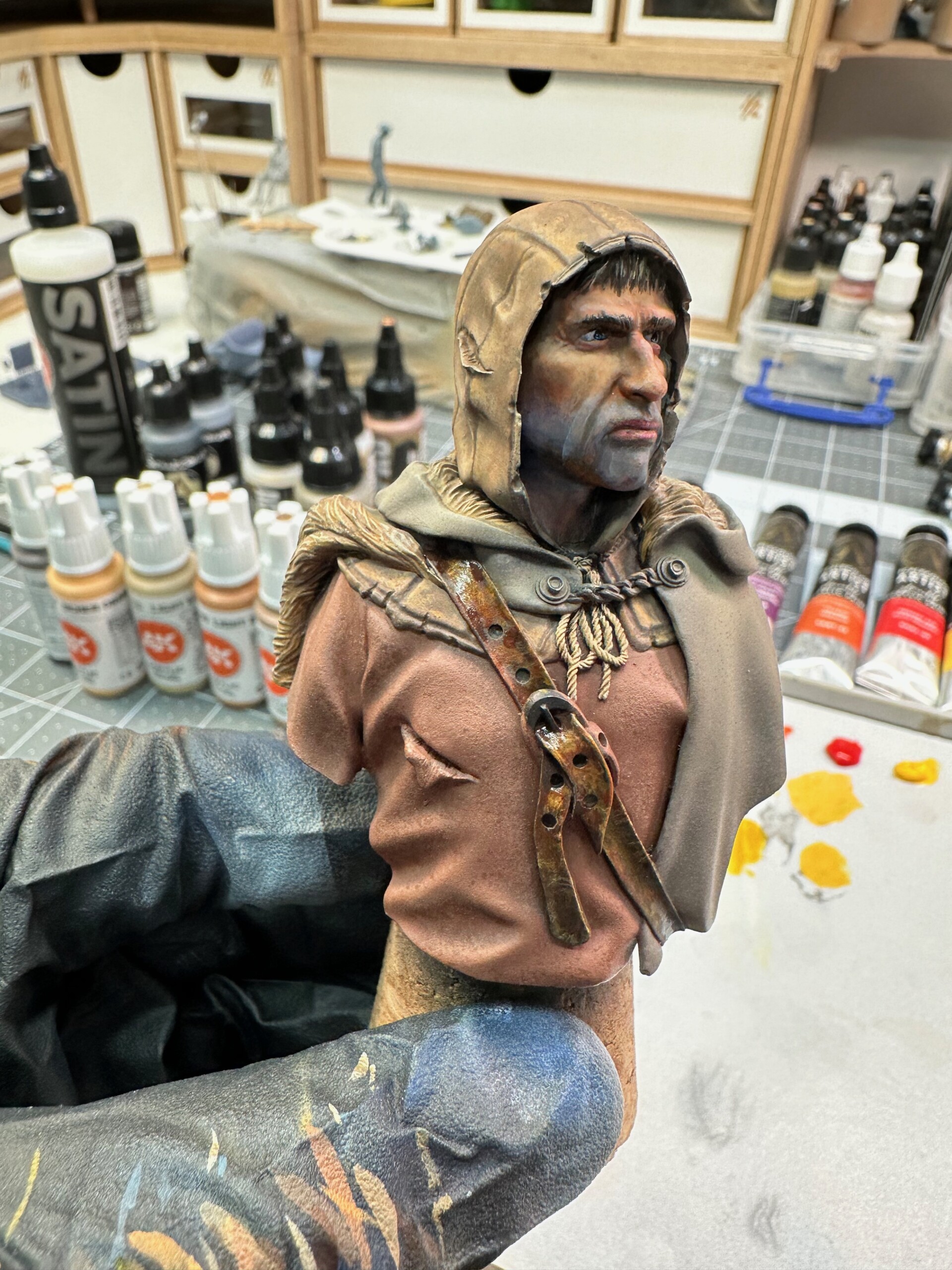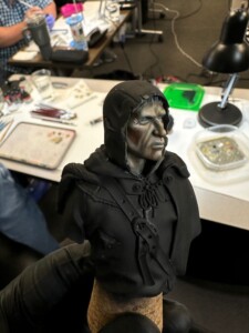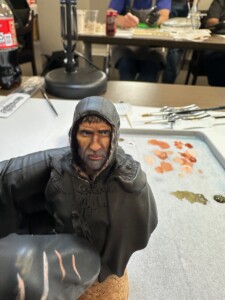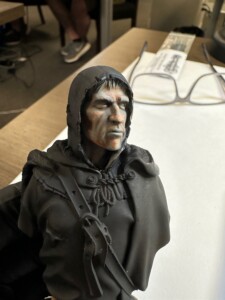 Then it was time for details like 5 o’clock shadow, lips, hair. This was about the point where the class ended and I’d just started to play with the leather strap. That ended up getting totally repainted for ease when I was working on the shirt and tunic.