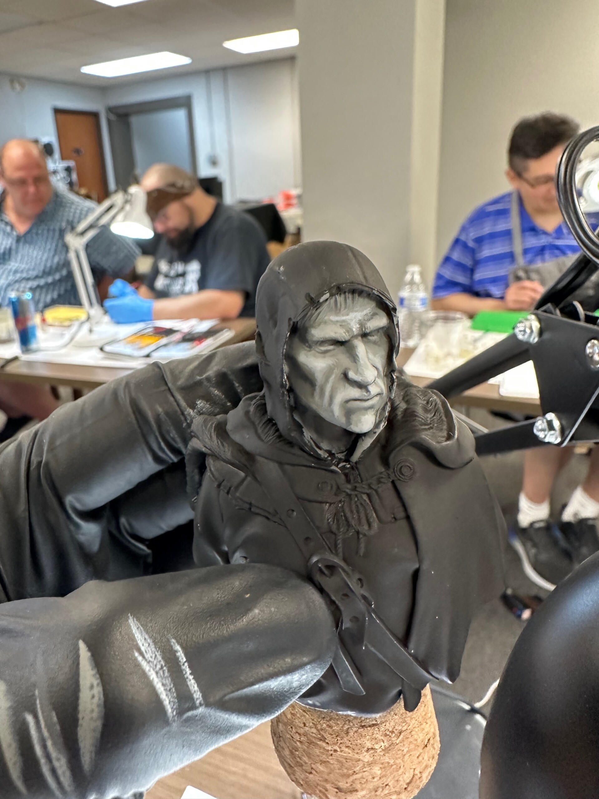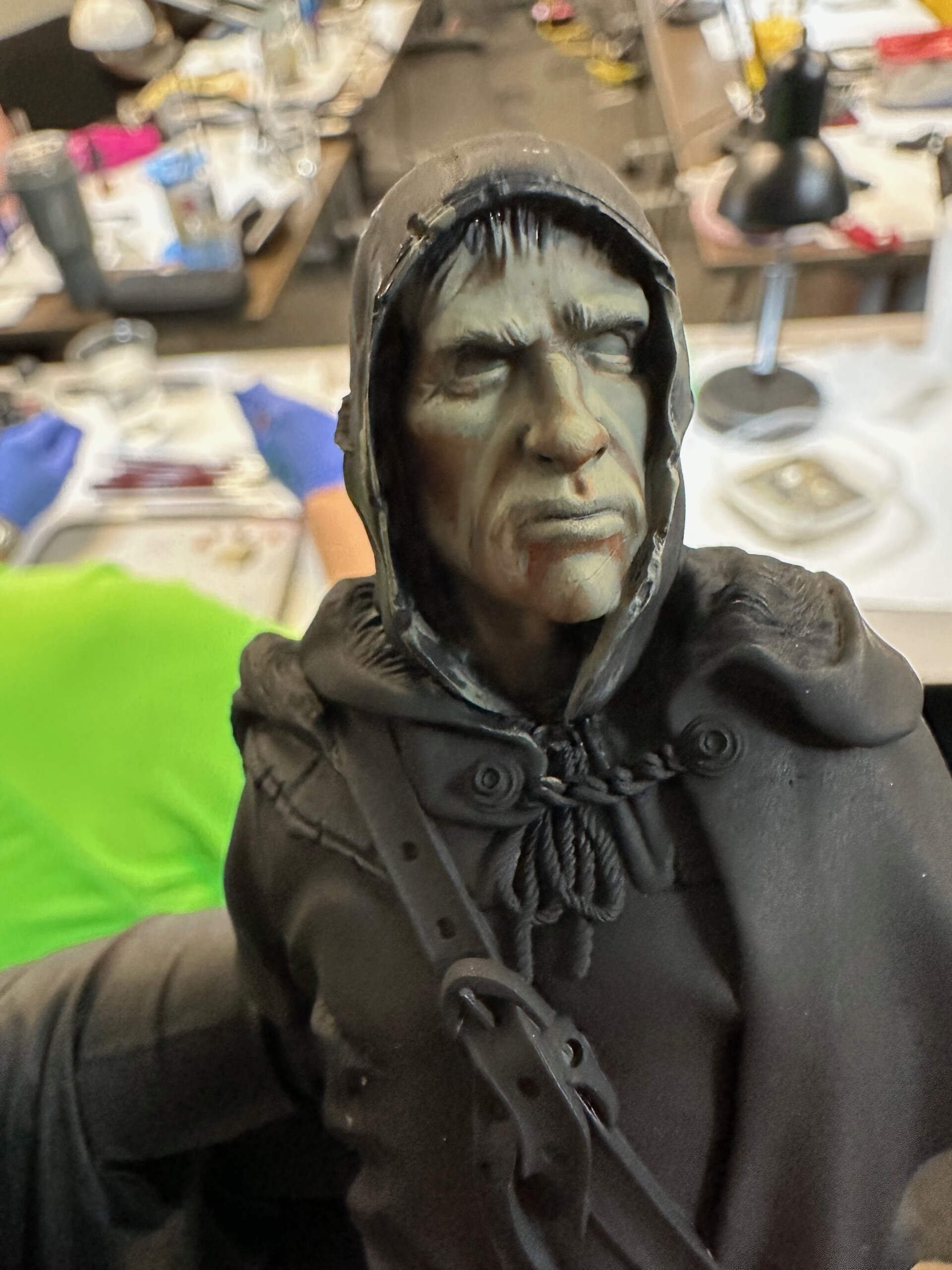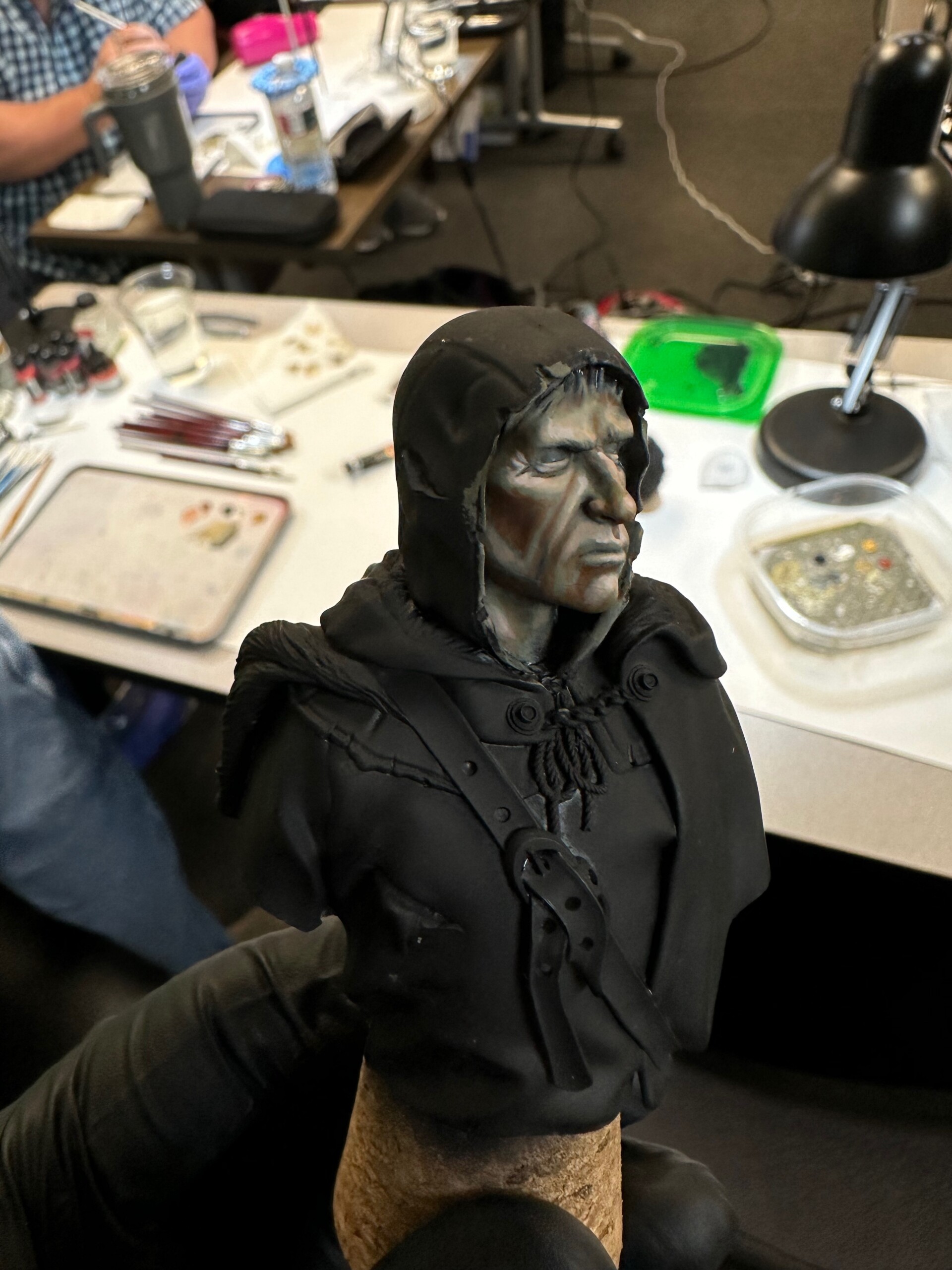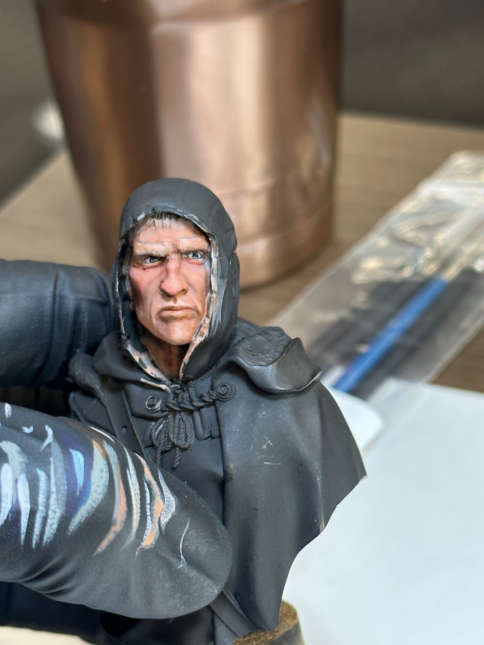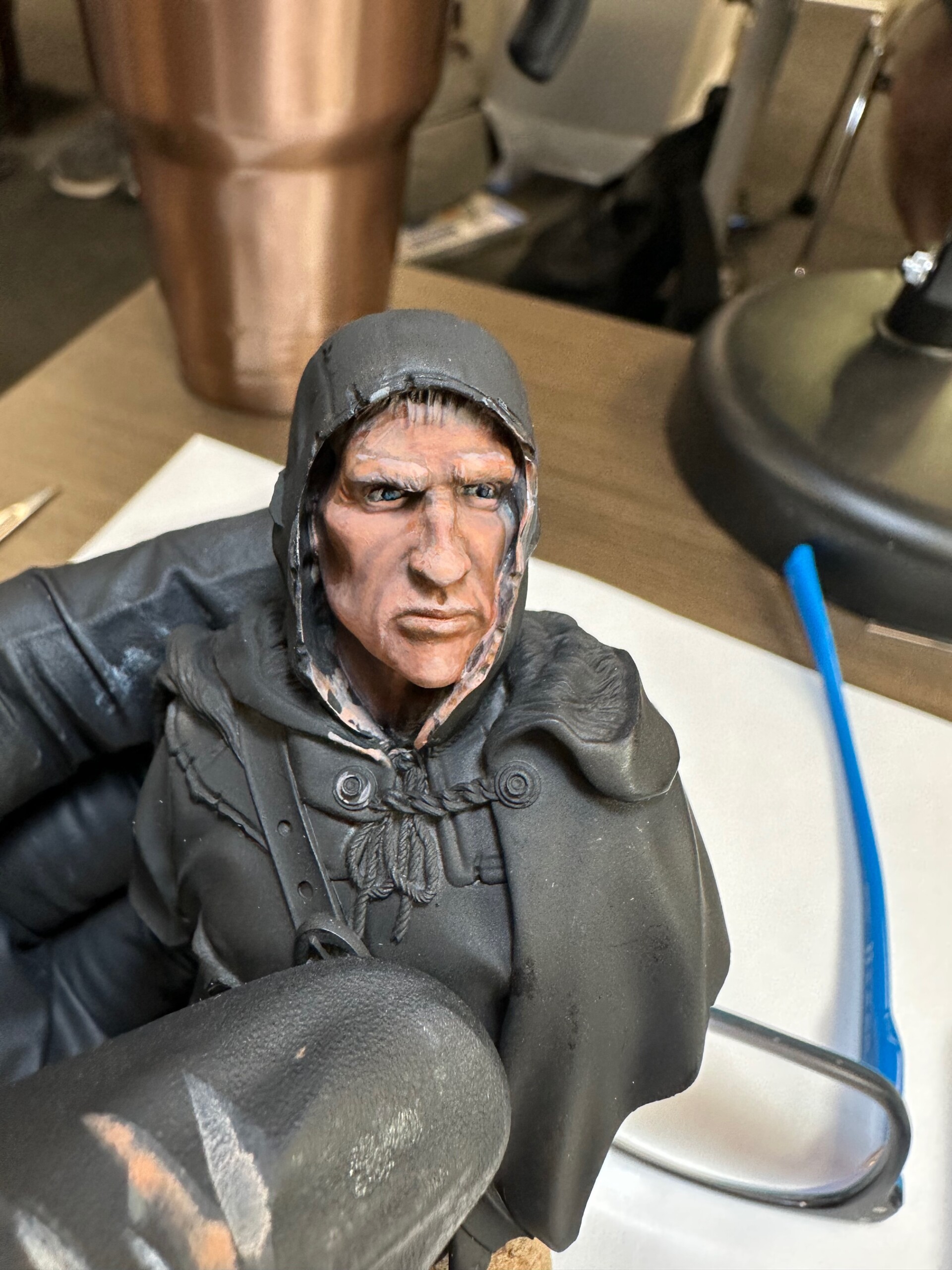 Then it was time for details like 5 o’clock shadow, lips, hair. This was about the point where the class ended and I’d just started to play with the leather strap. That ended up getting totally repainted for ease when I was working on the shirt and tunic.