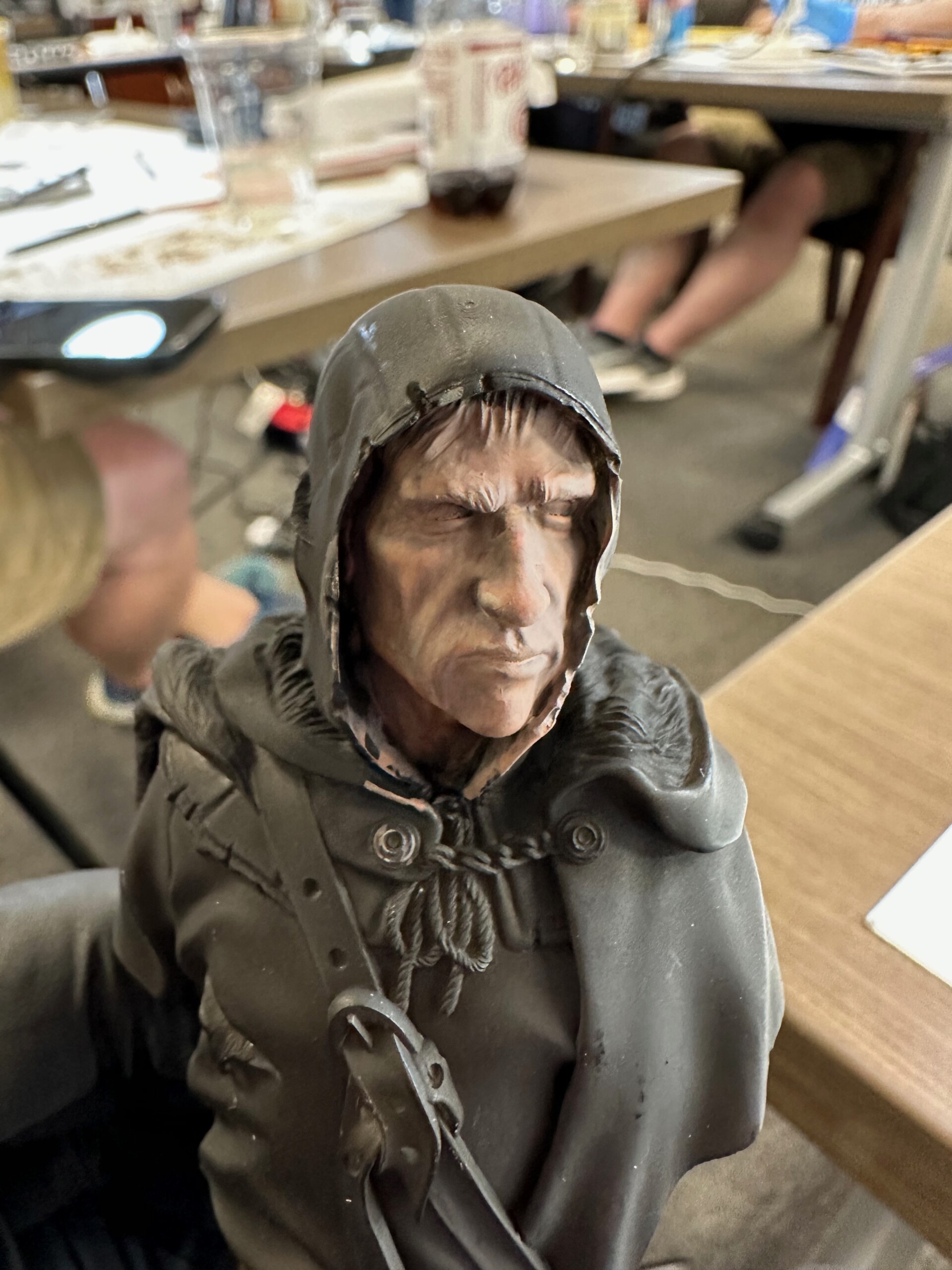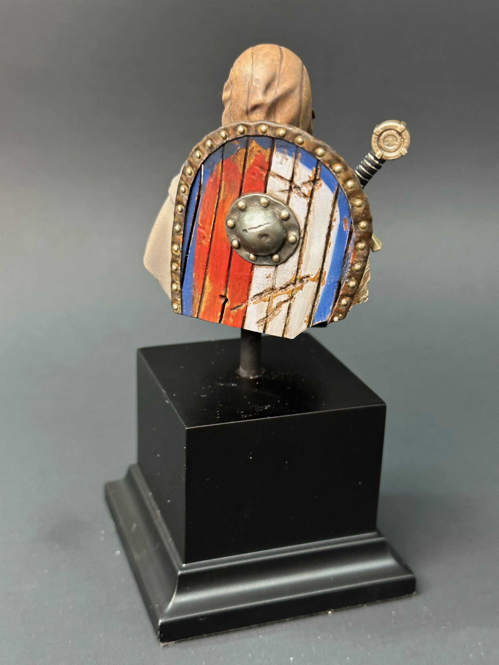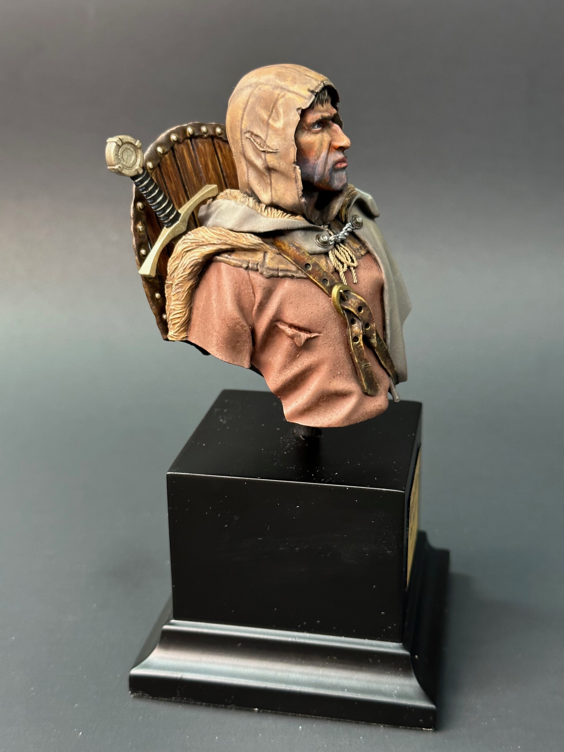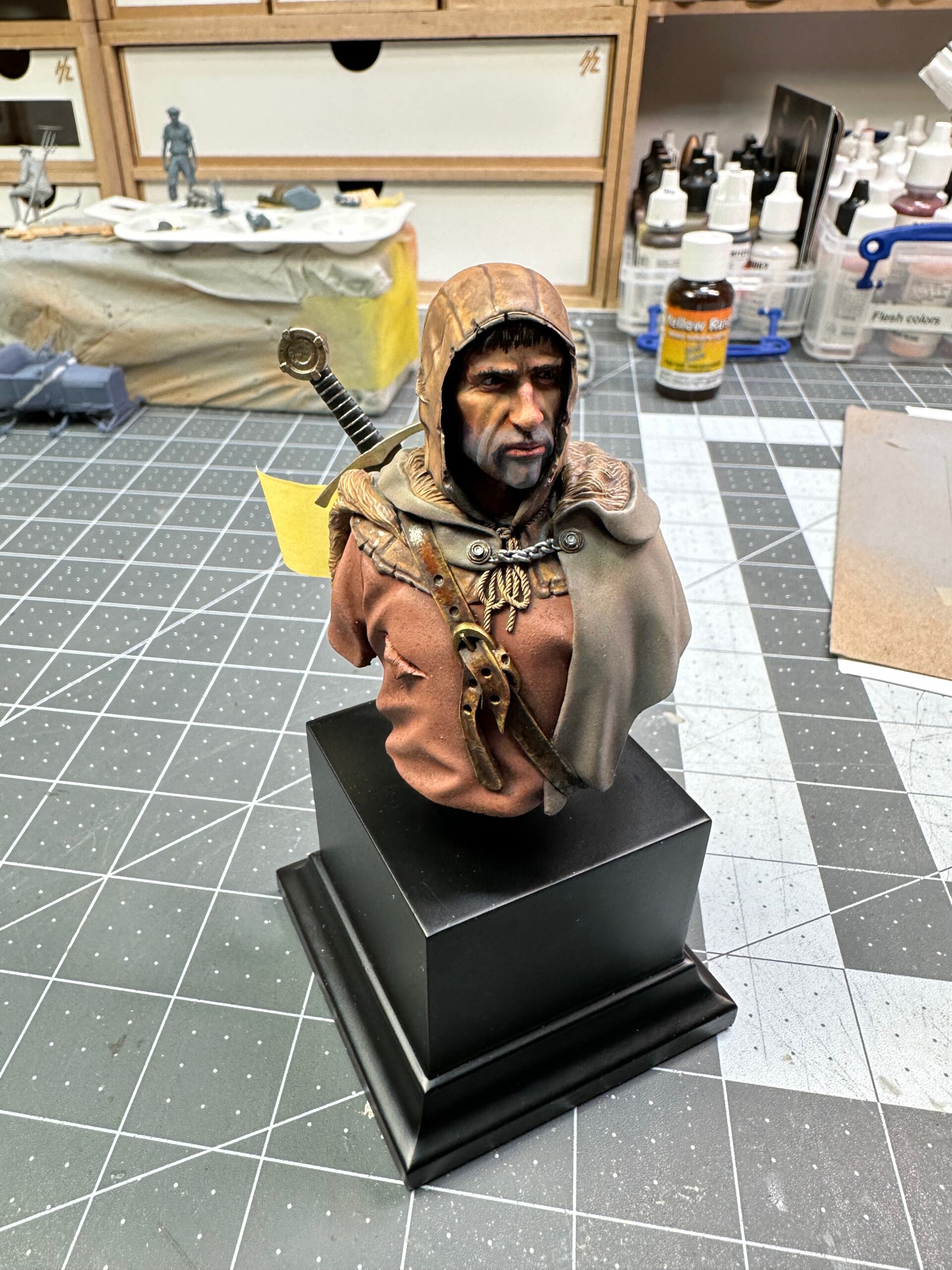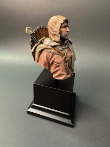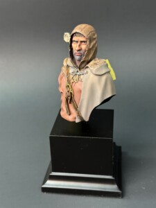 Now that the face was done and I was back home after the workshop, painting began on the cape and tunic. Since this 1/10 scale bust was kinda huge for this 1/35 scale guy, I wanted to use my airbrush to lay down as much base coating and shading as I could on as much of the figure as I dared. So I started with the tunic and sprayed it a dull reddish color. My story I was working off of was this was a lowly soldier who’d been in the field a while. He wasn’t going to have fancy clothing… totally functional. And worn down.
