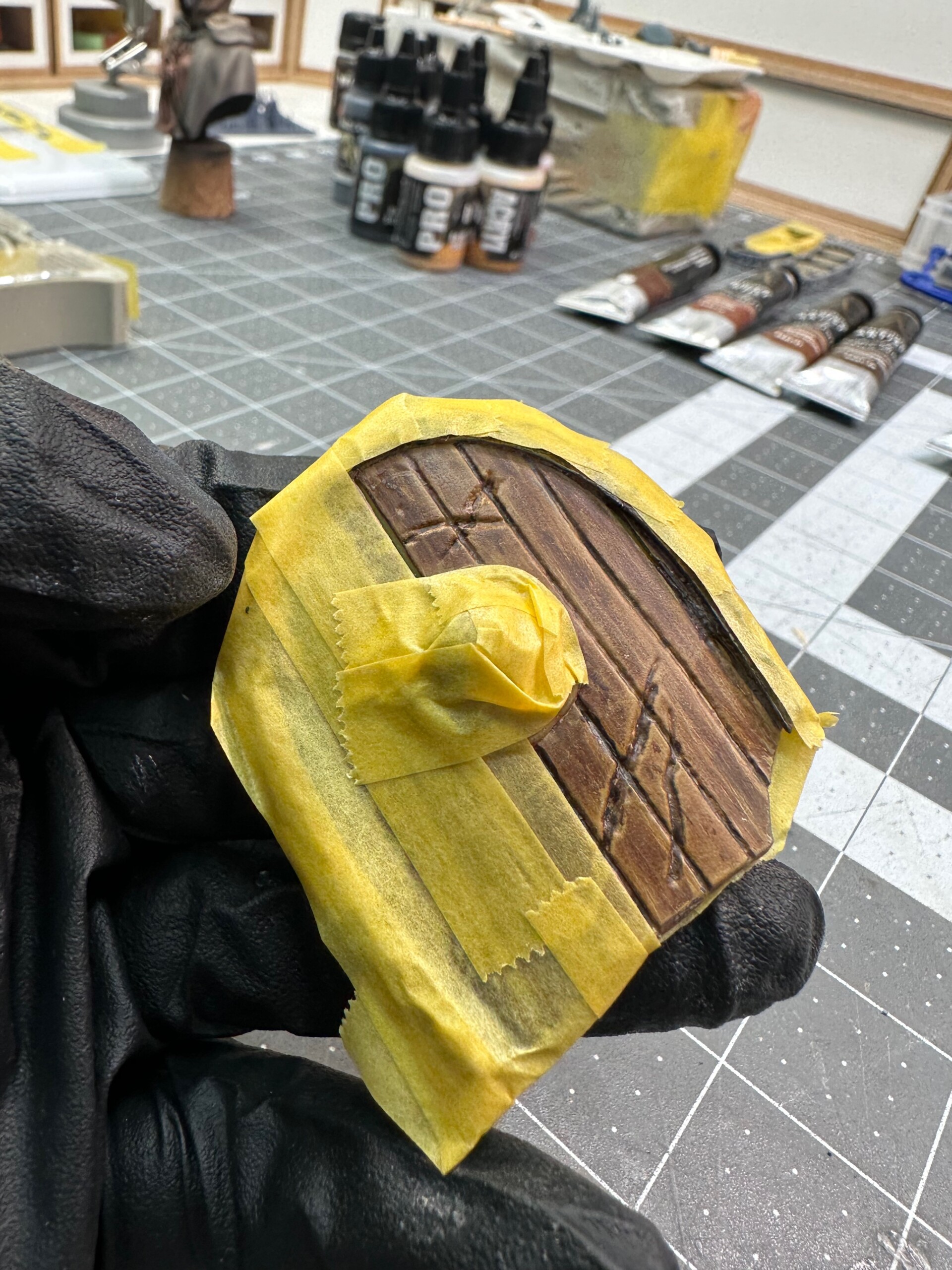 Once the base coat was fully in place, I used the airbrush stippling technique (VERY VERY low pressure, very thin paint) to add some stippled cloth texture in both pure wood base and pure leather brown.