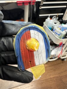 So I started over from scratch and opted for red and white stripes with a blue border, much more like the original LEGO shield. Some basic taping off one half, then the other, spraying the colors and then applying the chipping. But the hairspray chipping on the first go round didn’t turn out well. So started over. Again.