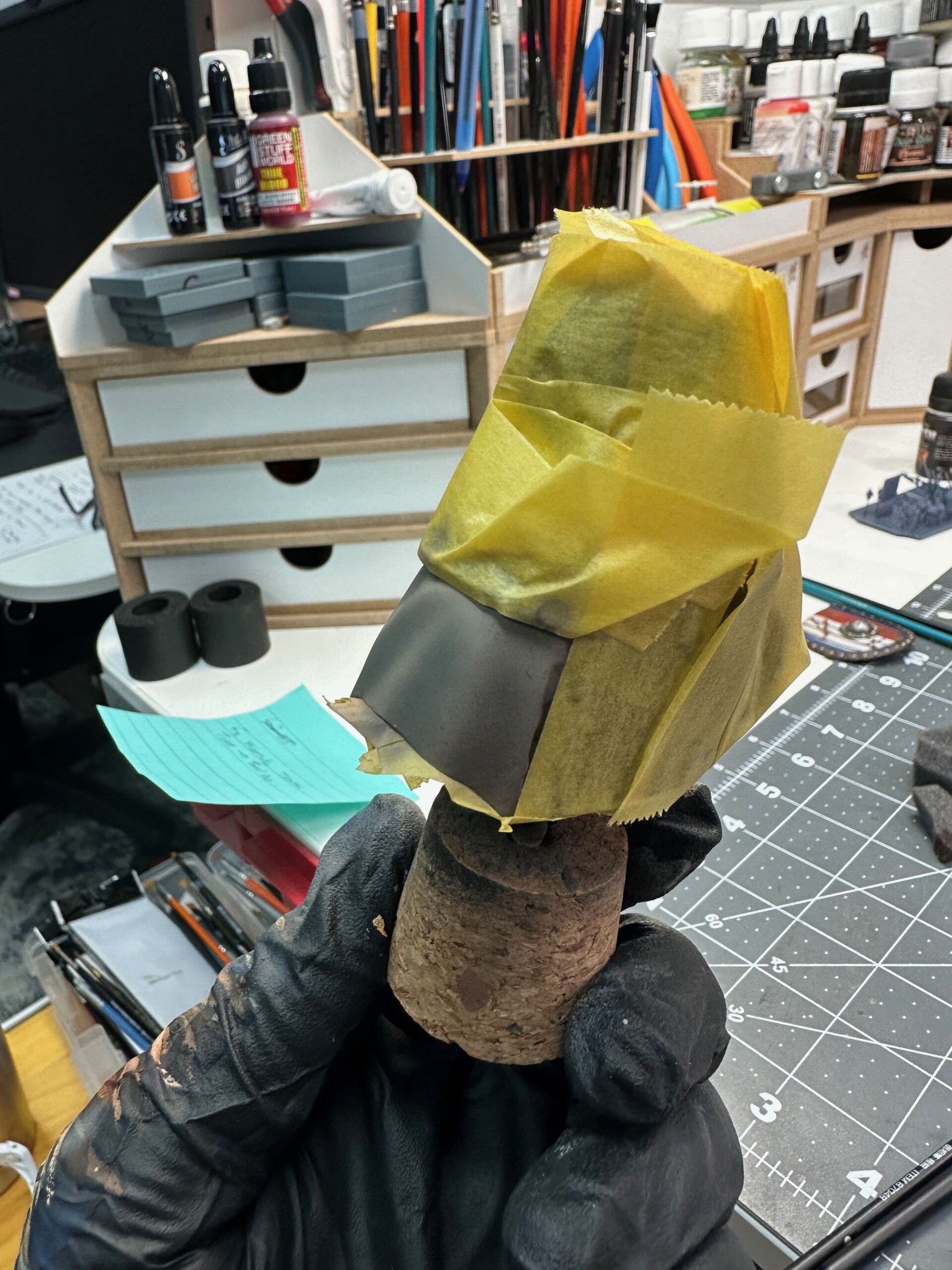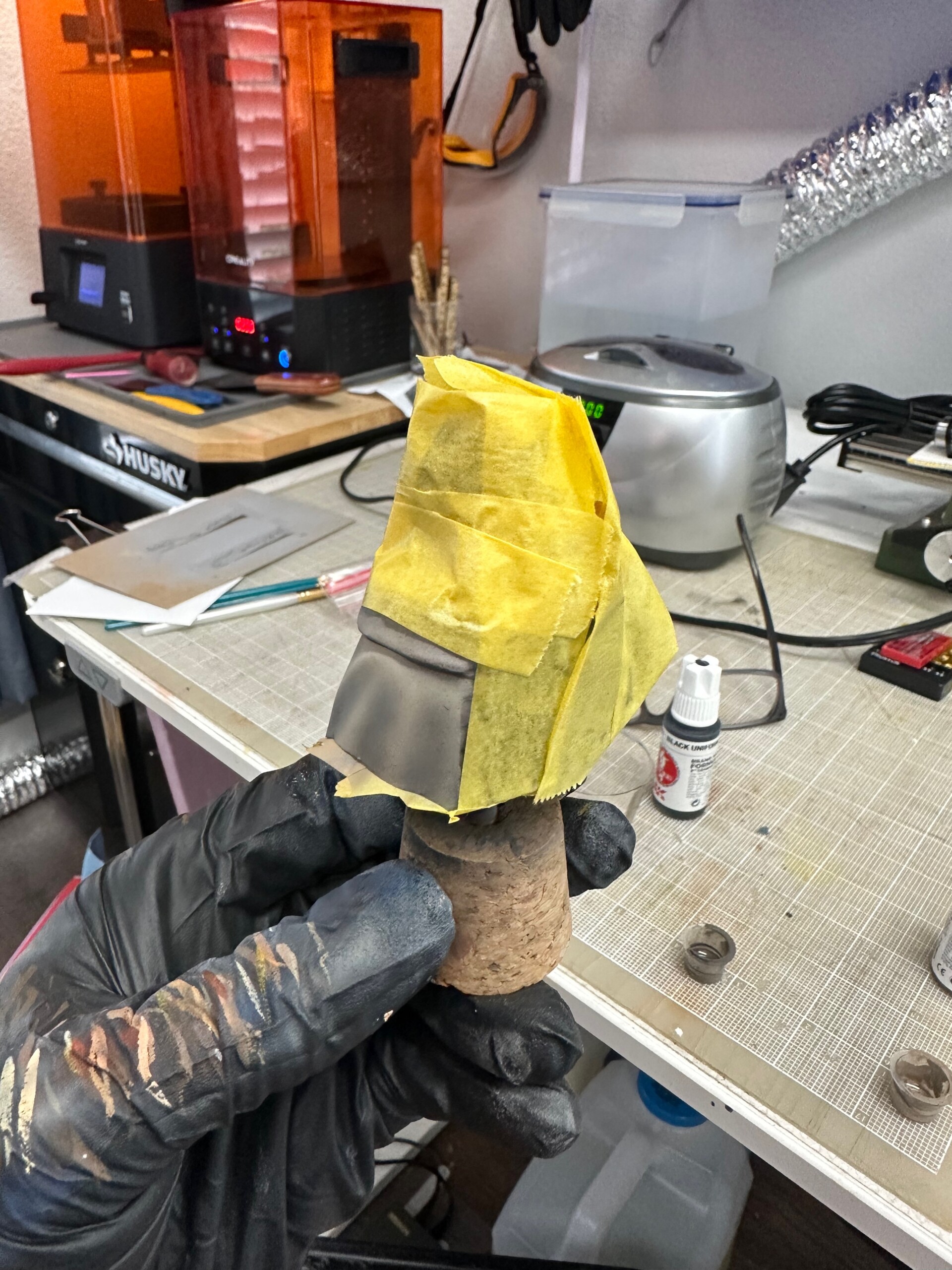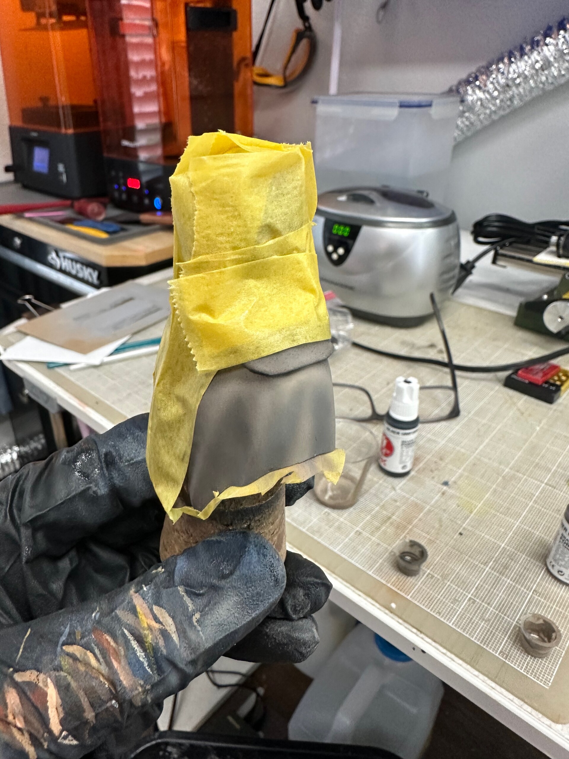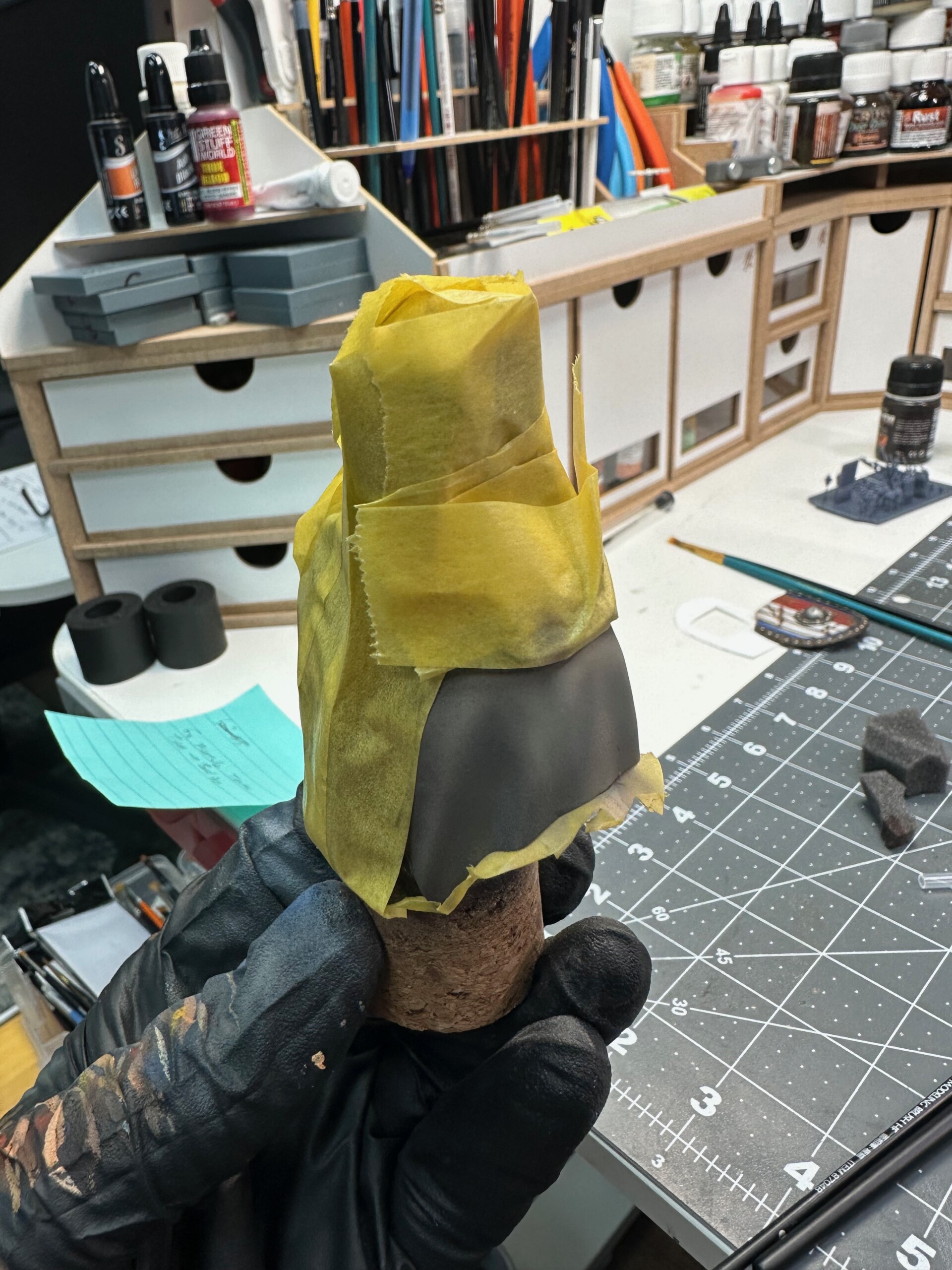 While hand painting the hood, I got some wet fluid on my finger and touched the tunic. No clue what, no clue how since I wasn’t doing anything at the time with liquids. But hey, it happened. So I had to mask up everywhere on the tunic, do my best to match colors again (it’d been a while since I originally mixed the tunic colors… but even if it was the day before, getting the right exact color match is near impossible). I matched well enough, blended in the patch, then shaded and stippled to get everything back in order. Then came several solid coats of Mr Color GX114 to hopefully lock this thing down and protect it from further foolishness. And removing the Tamiya tape caused no additional damage. Thank god.