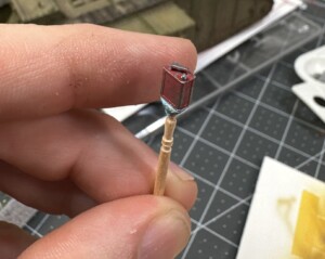The painting process on this project was… irritating. As mentioned earlier, I painted the entire base black to start. For the tin panels, I then sprayed rust base coat with the airbrush. Then I started working to add the silver tones and rust tones. I absolutely hated the results…mainly because that Verlinden lead foil has such a perfect natural color. So I stripped the paint off with some AK Paint Stripper and added oxidation and rust markings. On one panel, I added some blue paint to help the “we swiped this from a local civilian building” look. I was vastly more satisfied with the results.