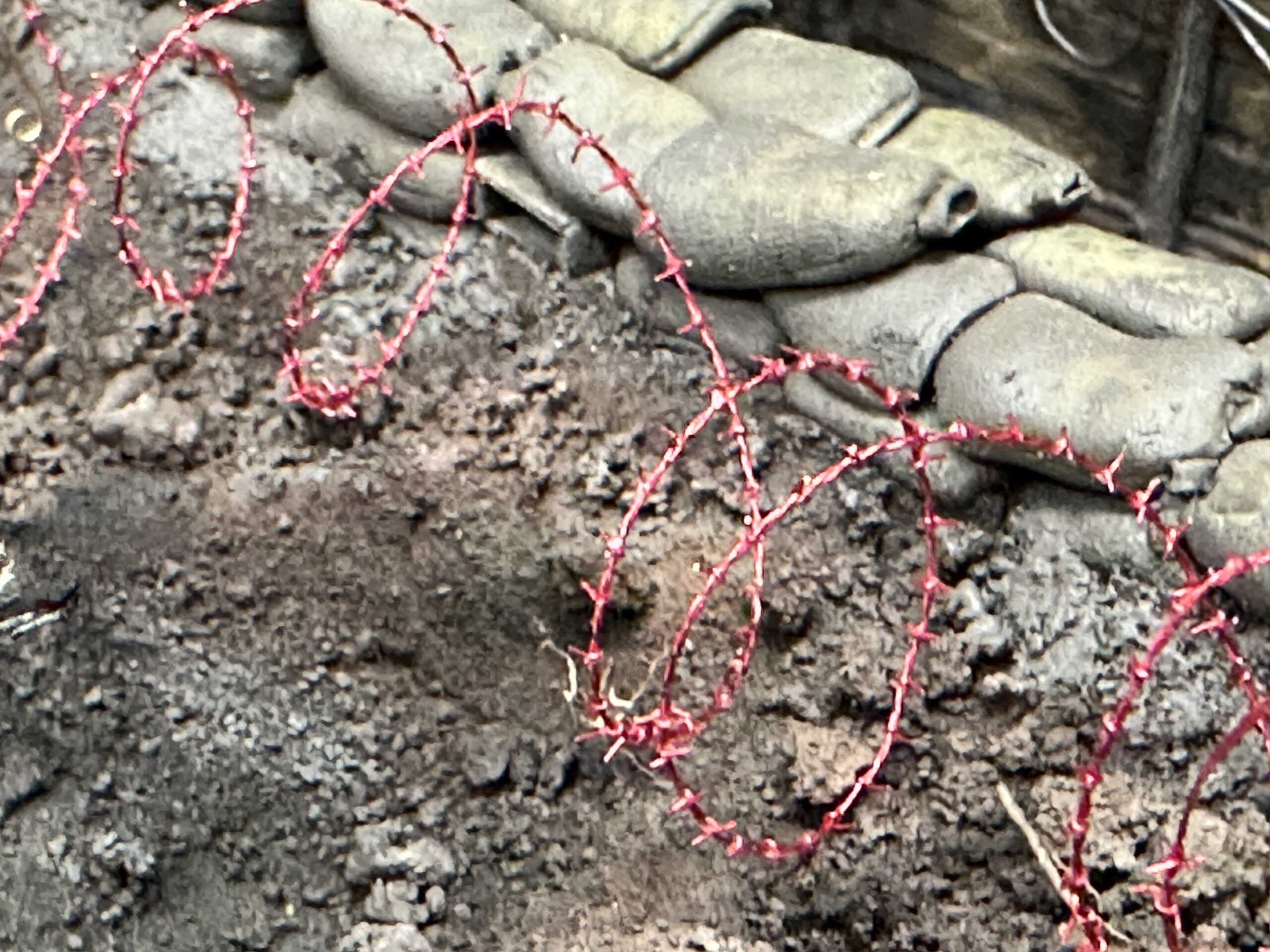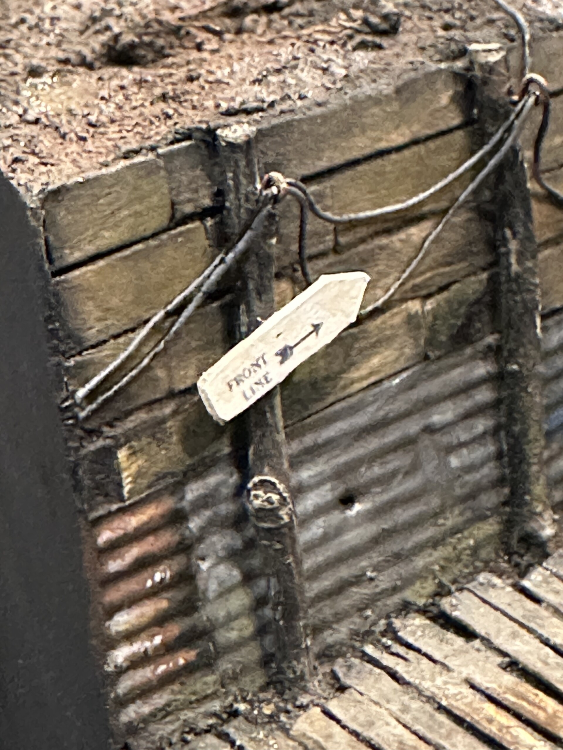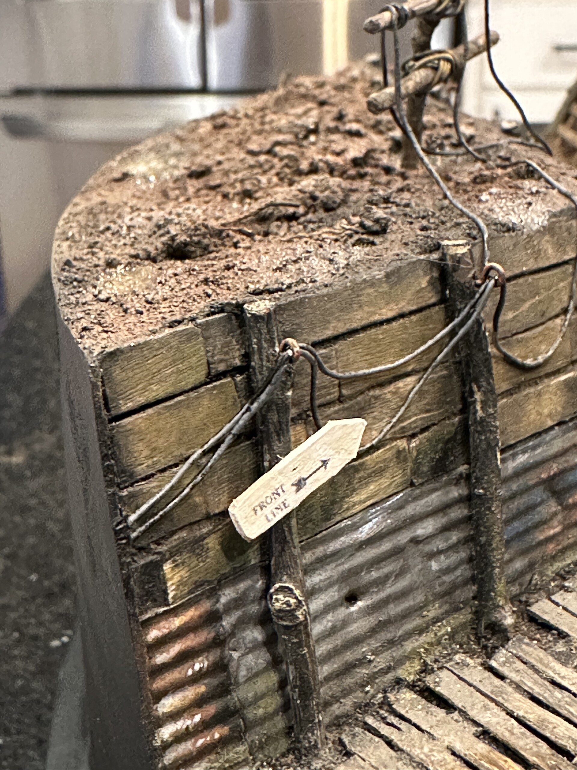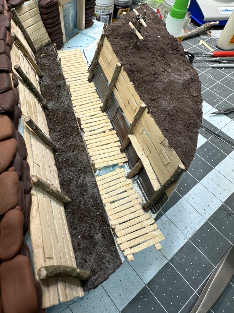 I wanted the trench messy and one of the more interesting features I saw in the reference photos was the phone lines. I have no idea if this is totally accurate… but hey, looks cool. The pole is made of twigs and the lines are just lead wire. I made little “hanger” eye bolts out of bent brass wire.