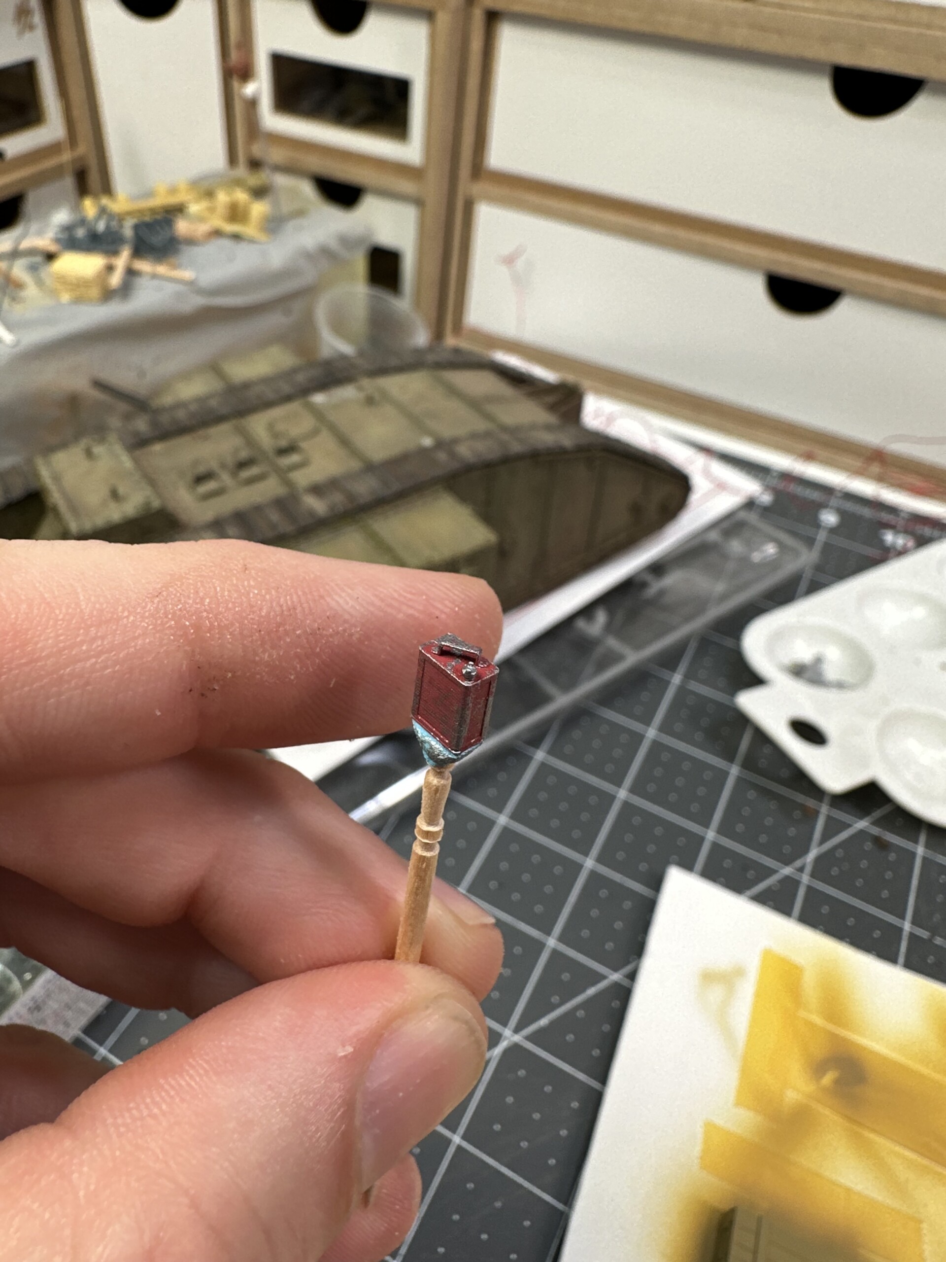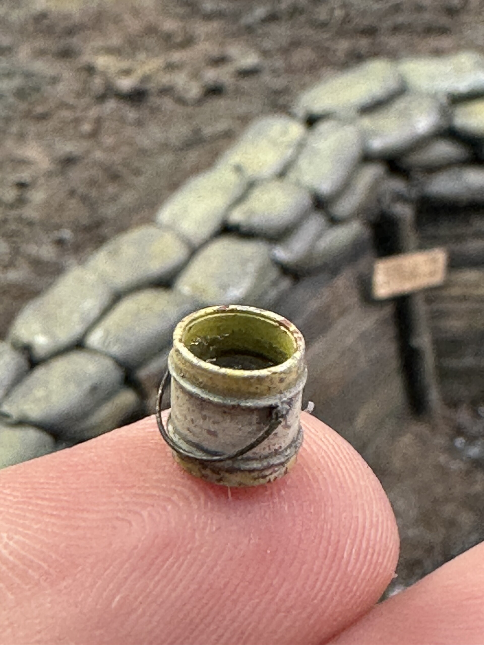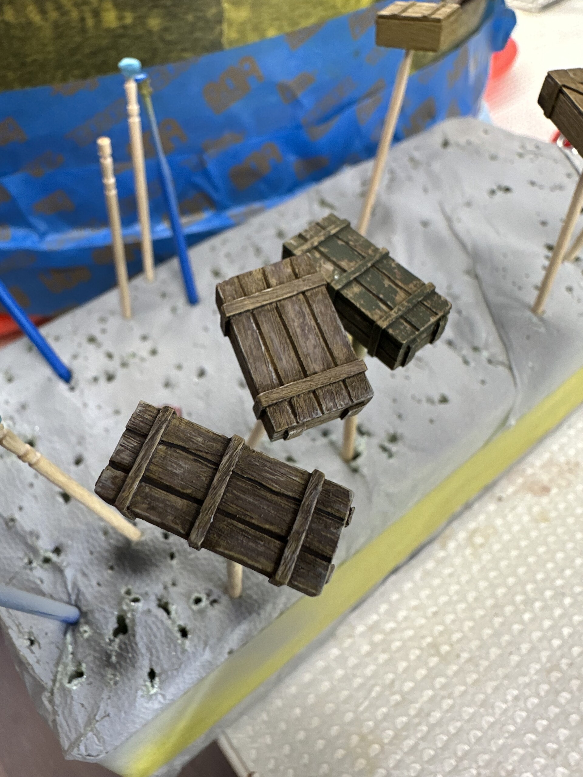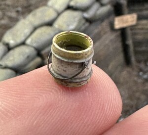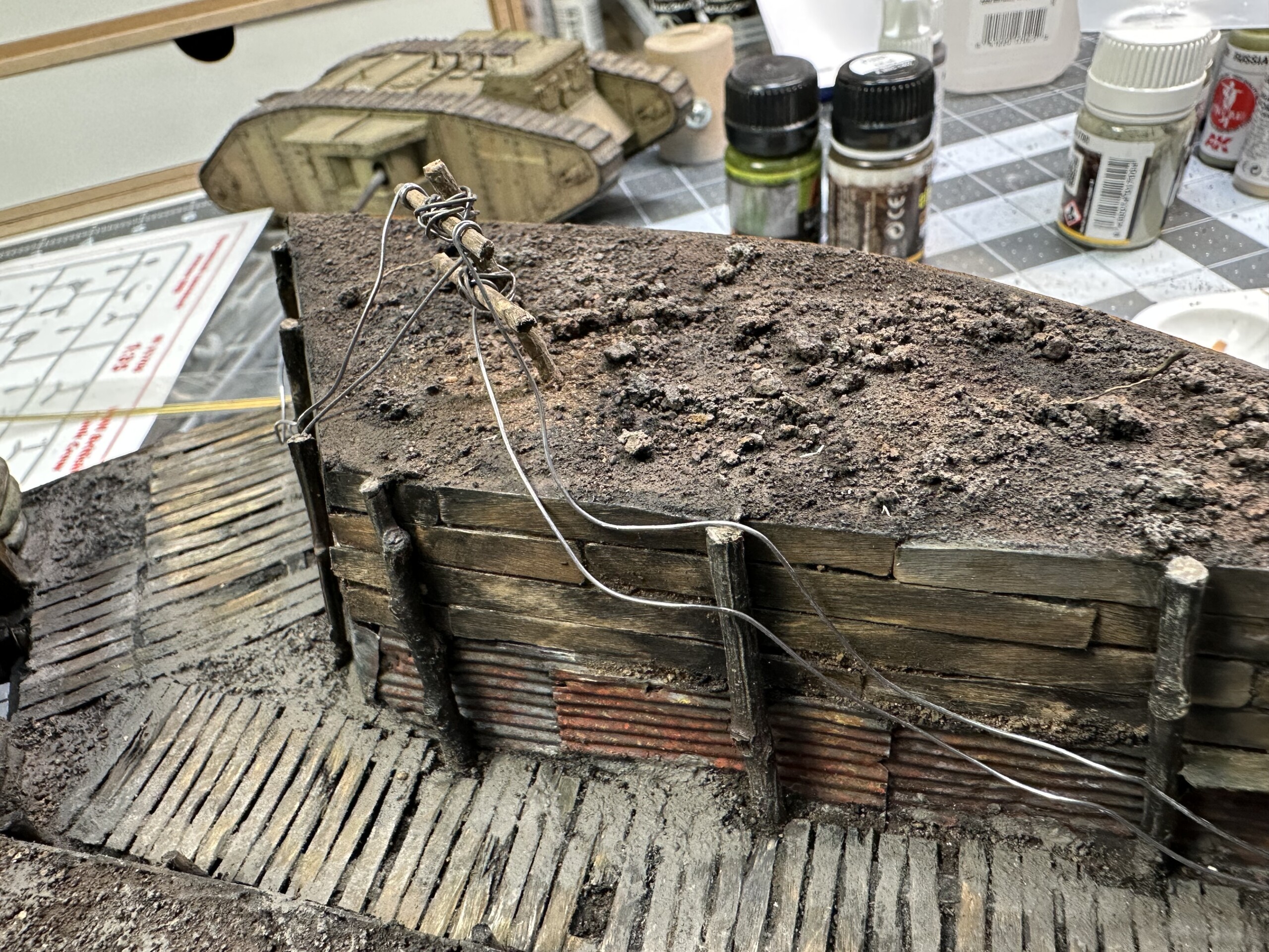 I wanted the trench messy and one of the more interesting features I saw in the reference photos was the phone lines. I have no idea if this is totally accurate… but hey, looks cool. The pole is made of twigs and the lines are just lead wire. I made little “hanger” eye bolts out of bent brass wire.