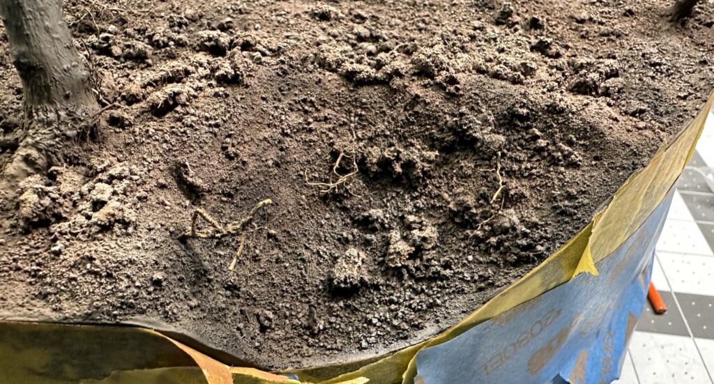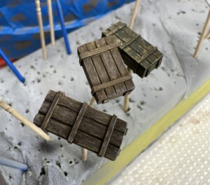 As mentioned above, the tree stumps (one large and two small) were twigs and branches I’d grabbed from my backyard after the post-ice storm tree guys had made me a very nice, very expensive pile of branches to source from. But I also added a number of small “roots” into the crater. Not sure why I put roots in quotes since these are literally roots from a large bush that the ice storm uprooted. They were a nice bit of extra detail to help sell the illusion of the ground being blown to bits.