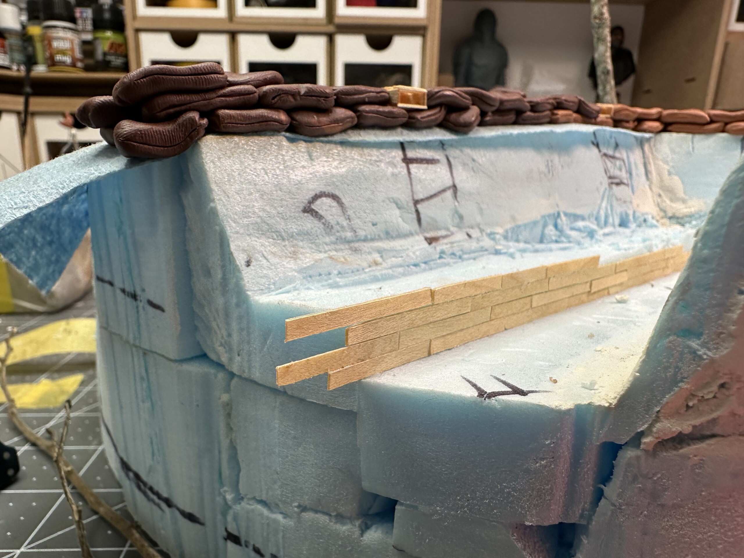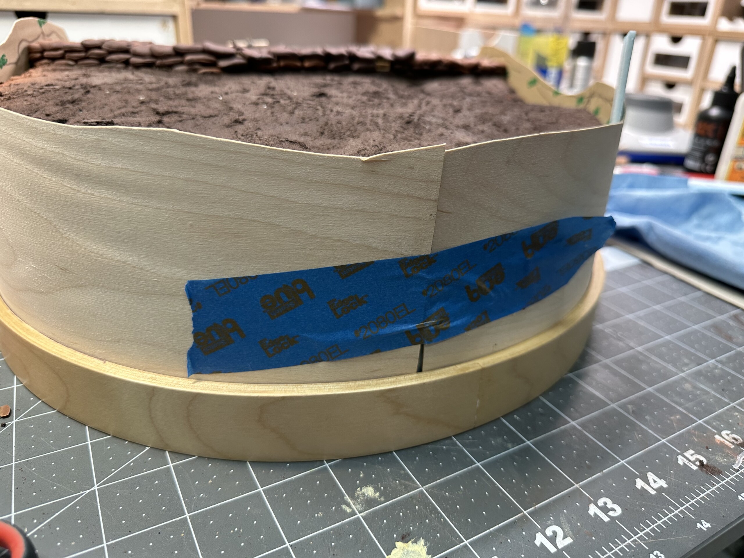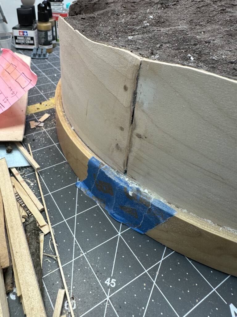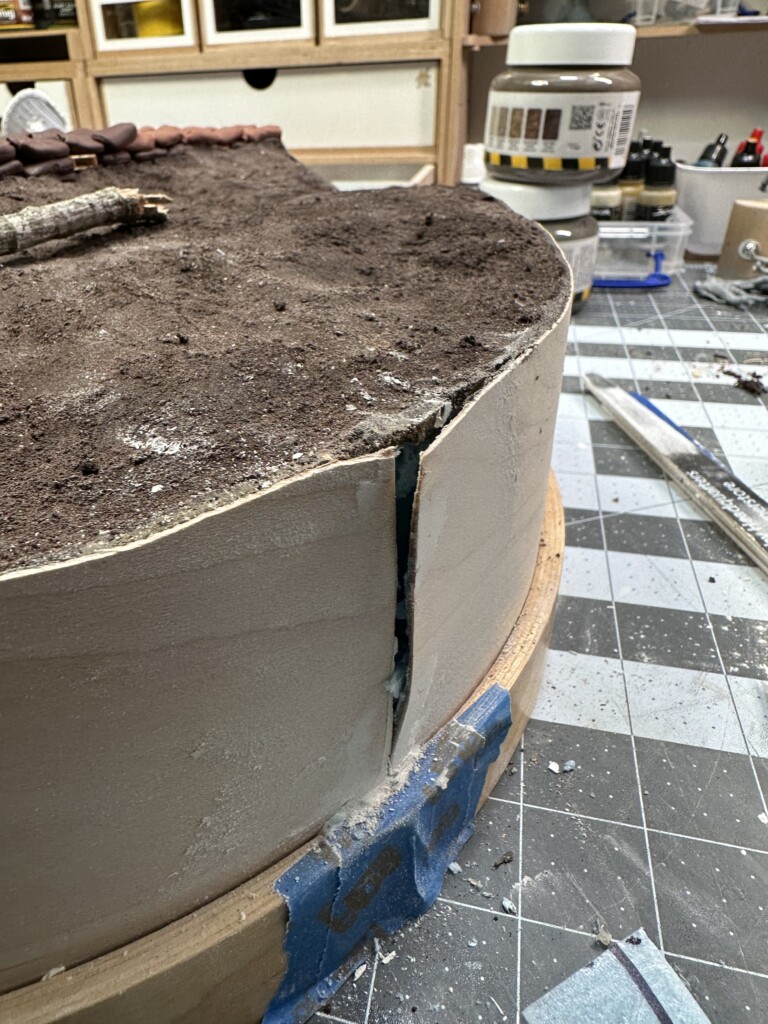 As you can see in the picture below with the tape, for weird reasons the edges didn’t meet up right when I taped the veneer down. Partially from my own boneheadedness when I cut the extra length down after everything was in place, partially from the way the foam happened to be shaped right behind the seam (there was too many shims there because I’d opted to push the non-shimmed area to the front of the diorama to make sure the trench cut outs were the priority)
