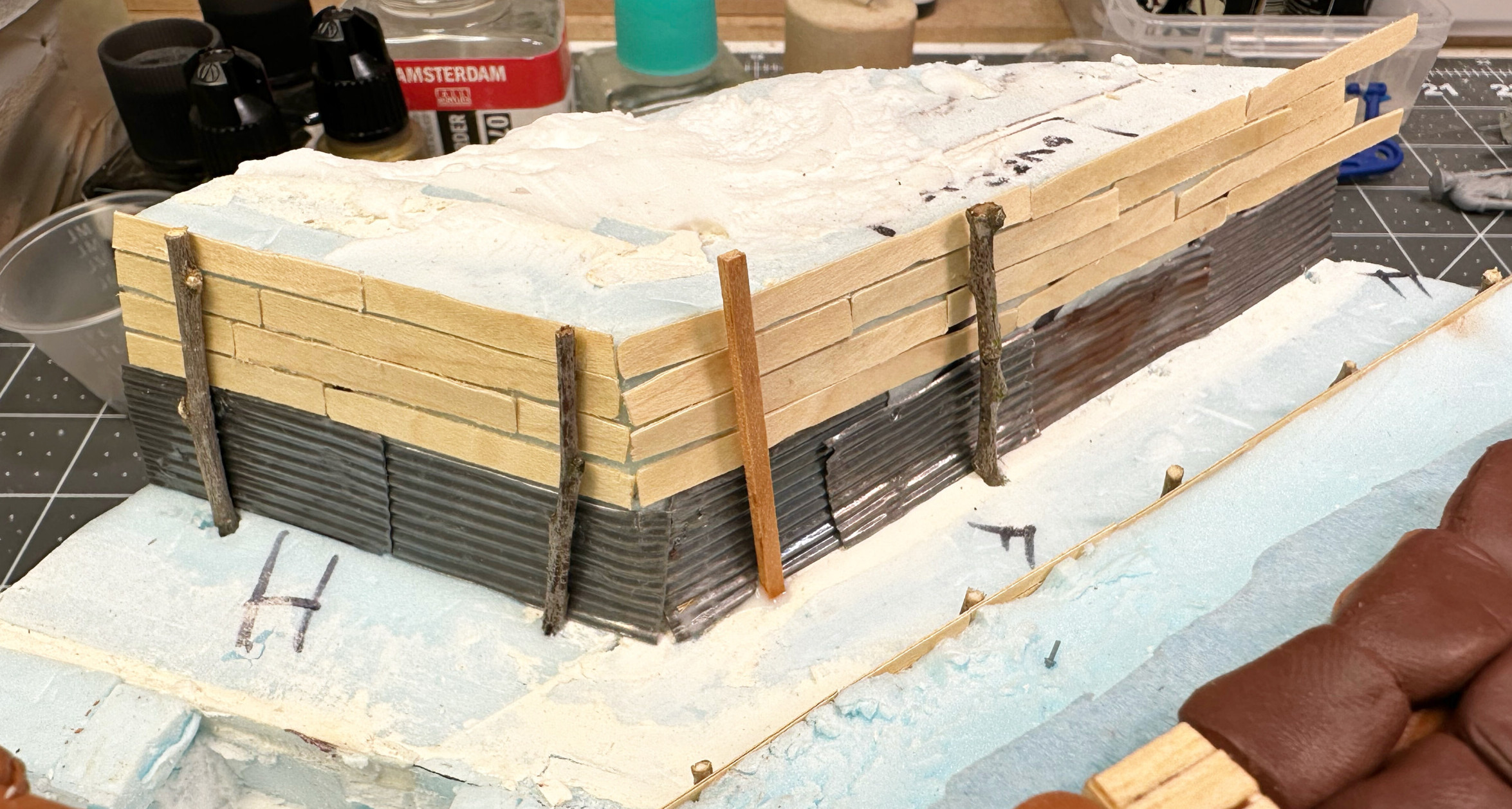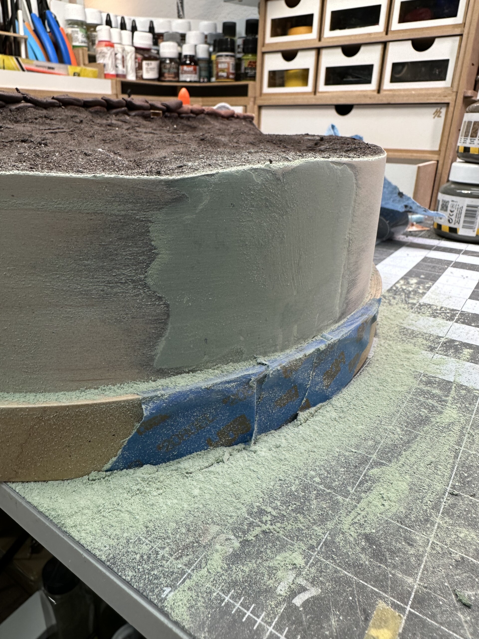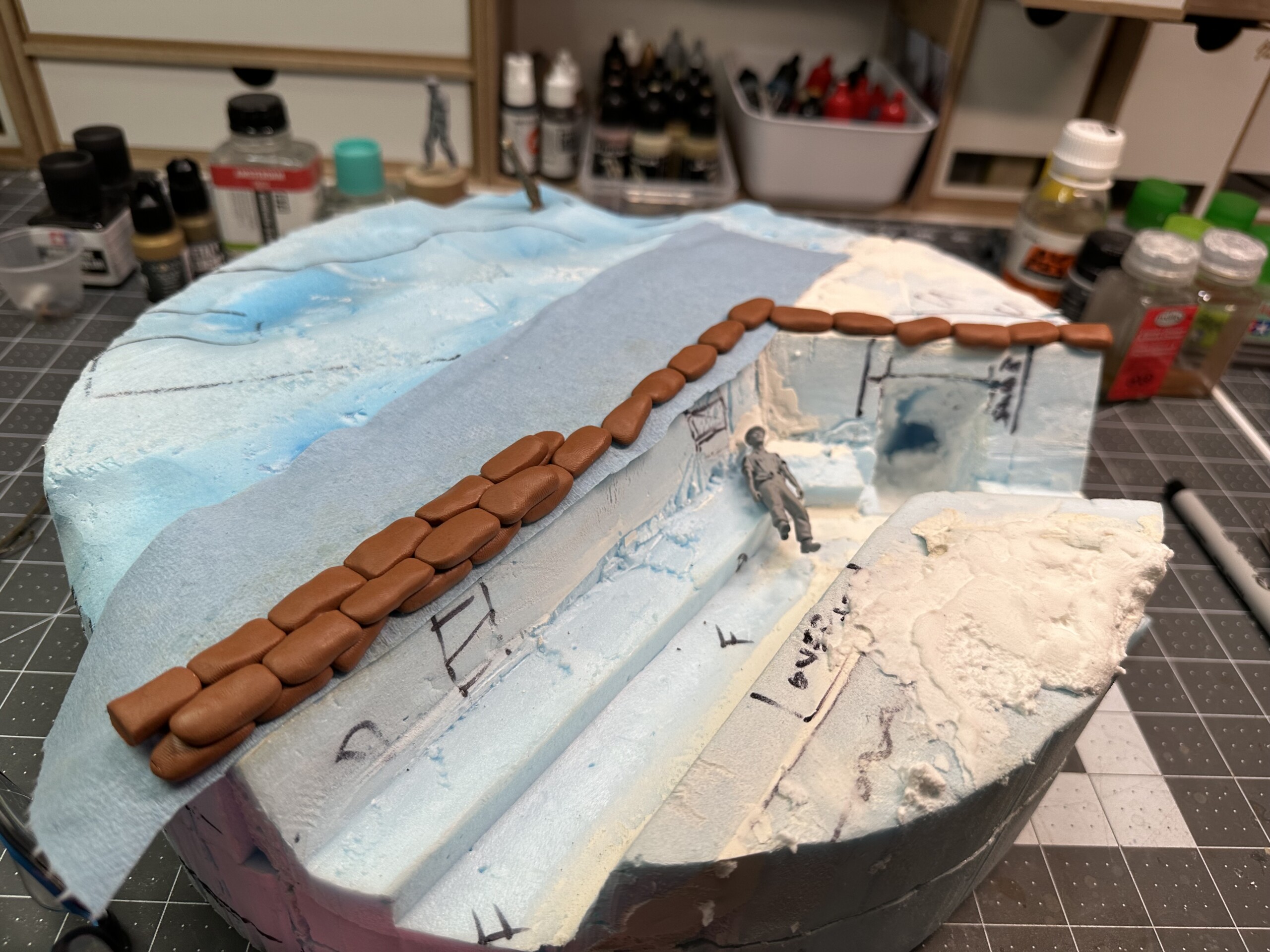 As you can see in the picture below with the tape, for weird reasons the edges didn’t meet up right when I taped the veneer down. Partially from my own boneheadedness when I cut the extra length down after everything was in place, partially from the way the foam happened to be shaped right behind the seam (there was too many shims there because I’d opted to push the non-shimmed area to the front of the diorama to make sure the trench cut outs were the priority)