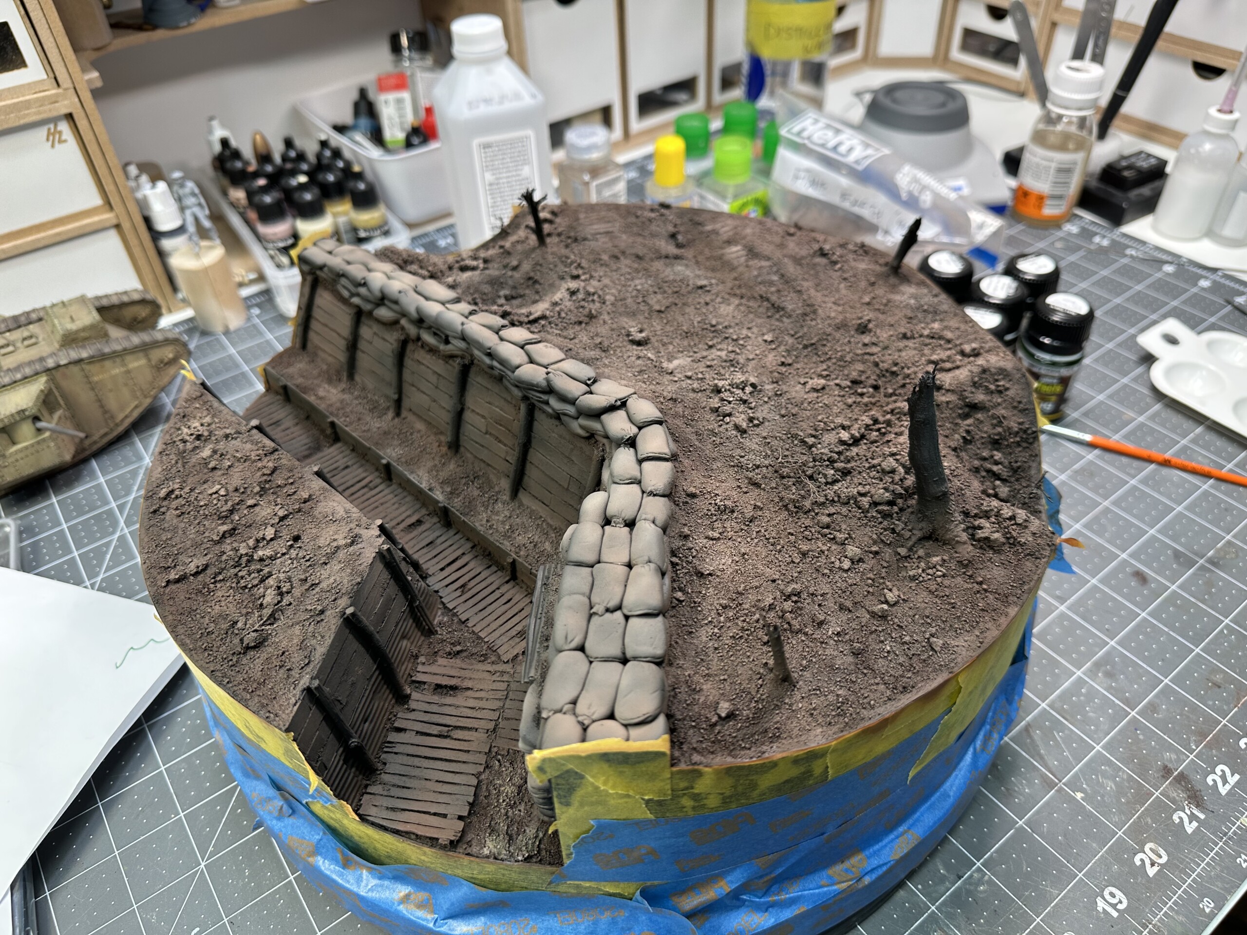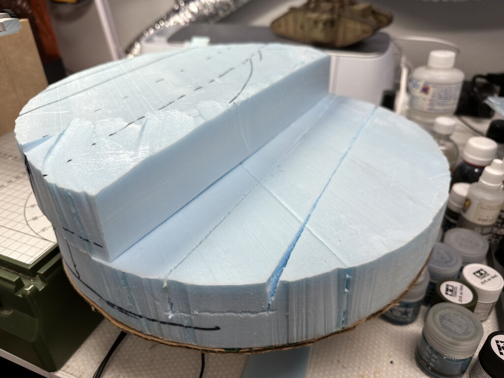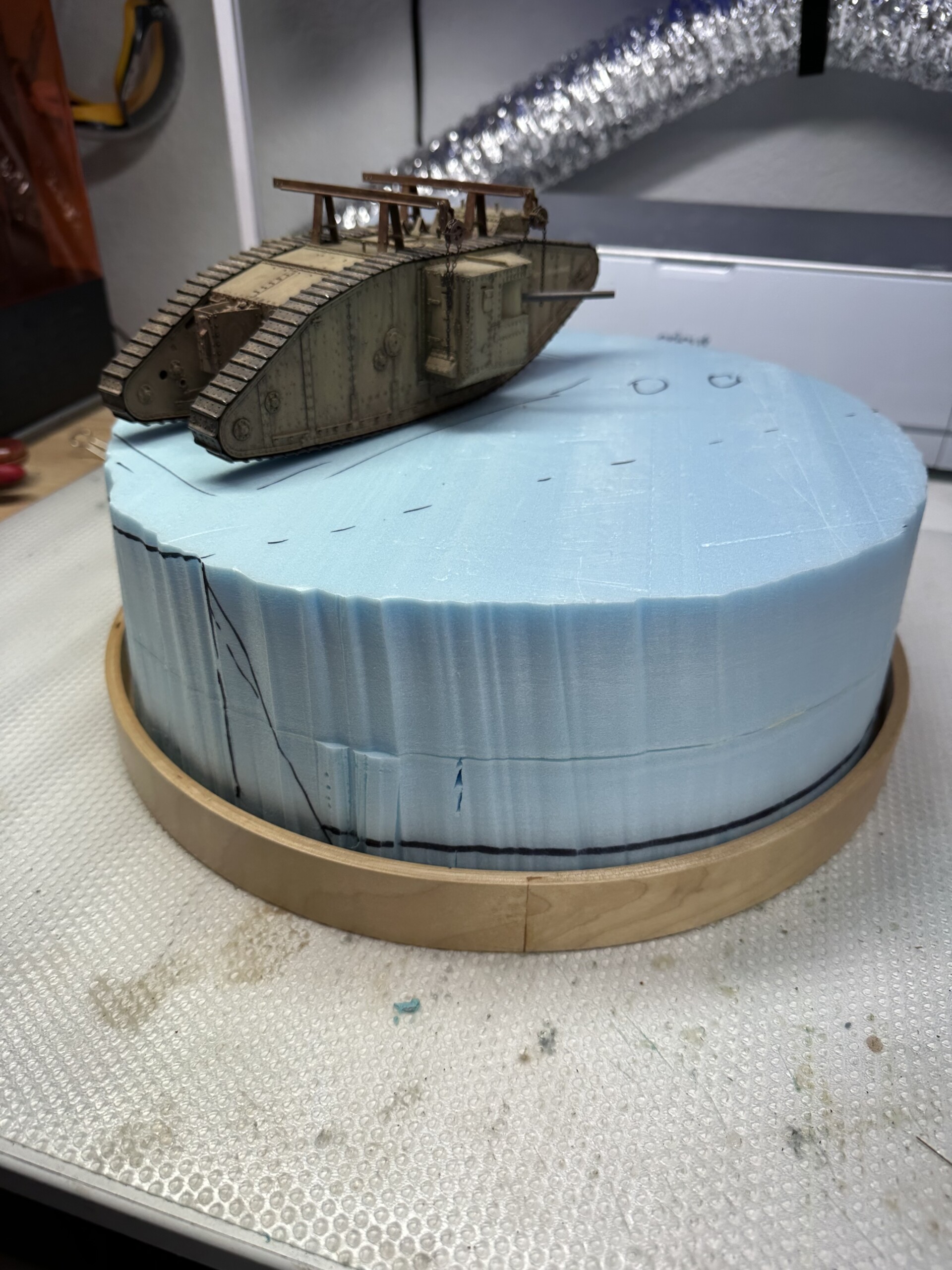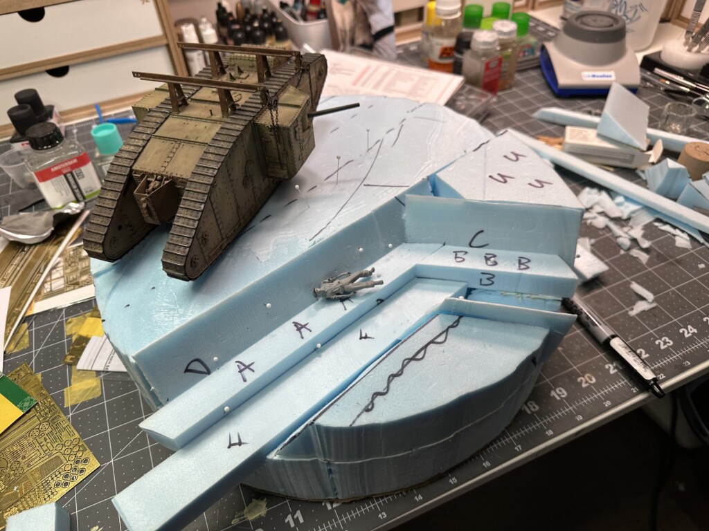 This diorama started years ago… sorta. I found a nice wooden diorama base at IKEA, improperly marked as “serving tray”. I hung onto this dumb thing for years, knowing one day I’d use it for a round diorama. After I finished the Barn diorama in early 2023, I was itching to do more work with insulation foam. So I grabbed an older, completed model of a WWI British Mk. IV tank and decided to make a trench base for it. Not sure where this idea came from, it just kinda fell out of my head.