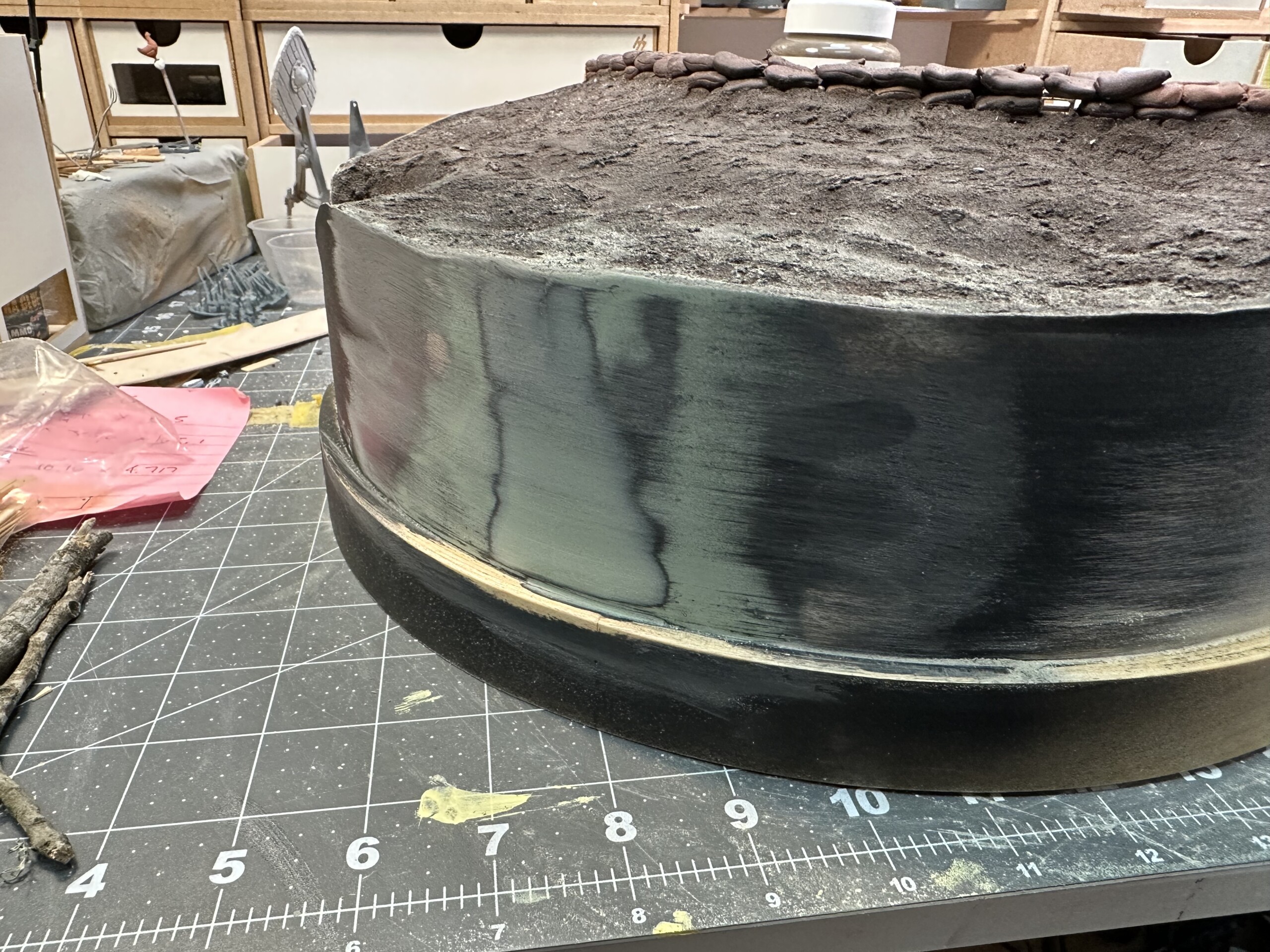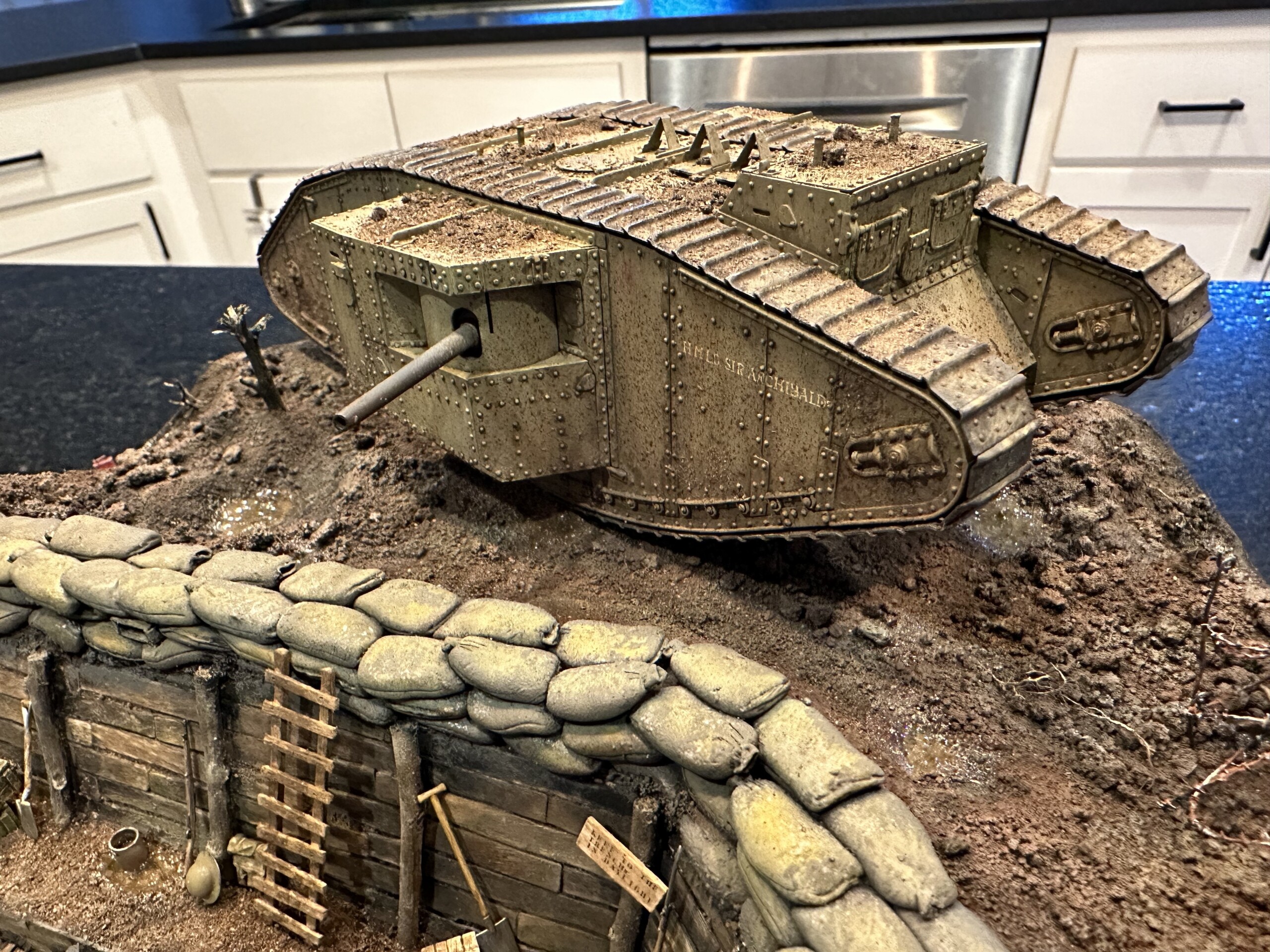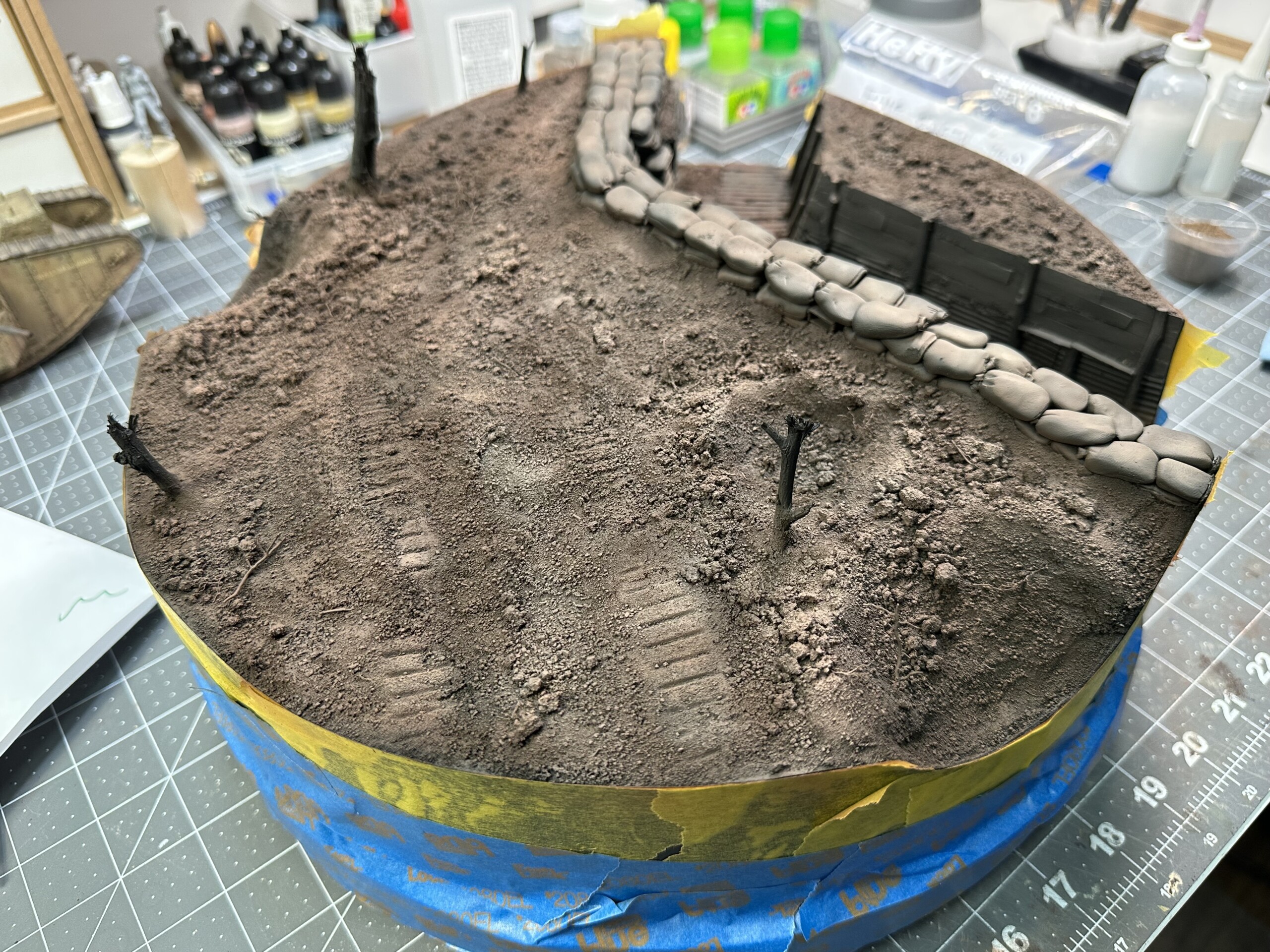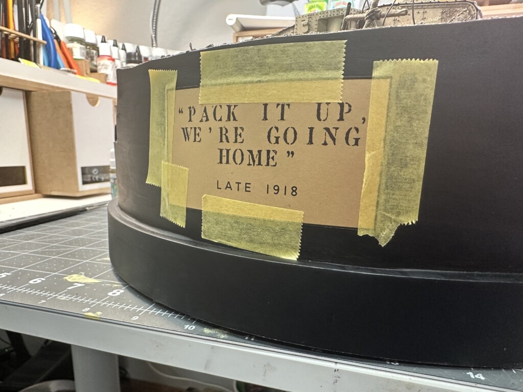 This diorama started years ago… sorta. I found a nice wooden diorama base at IKEA, improperly marked as “serving tray”. I hung onto this dumb thing for years, knowing one day I’d use it for a round diorama. After I finished the Barn diorama in early 2023, I was itching to do more work with insulation foam. So I grabbed an older, completed model of a WWI British Mk. IV tank and decided to make a trench base for it. Not sure where this idea came from, it just kinda fell out of my head.