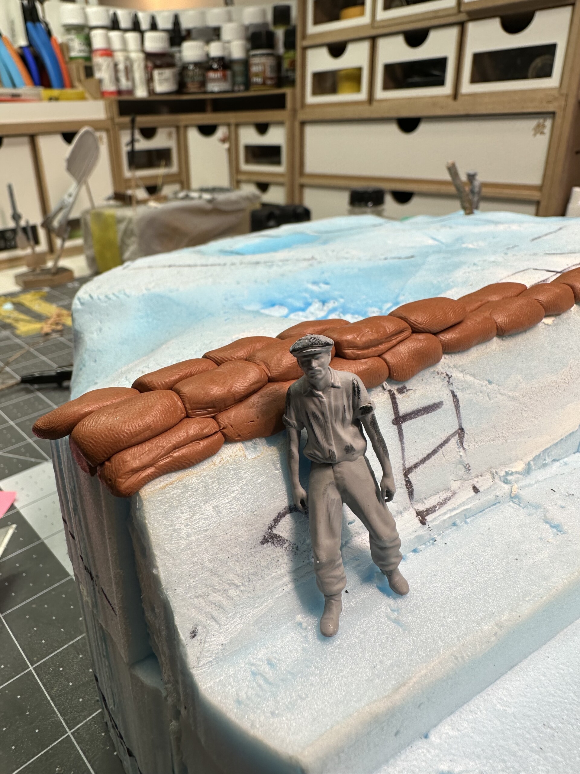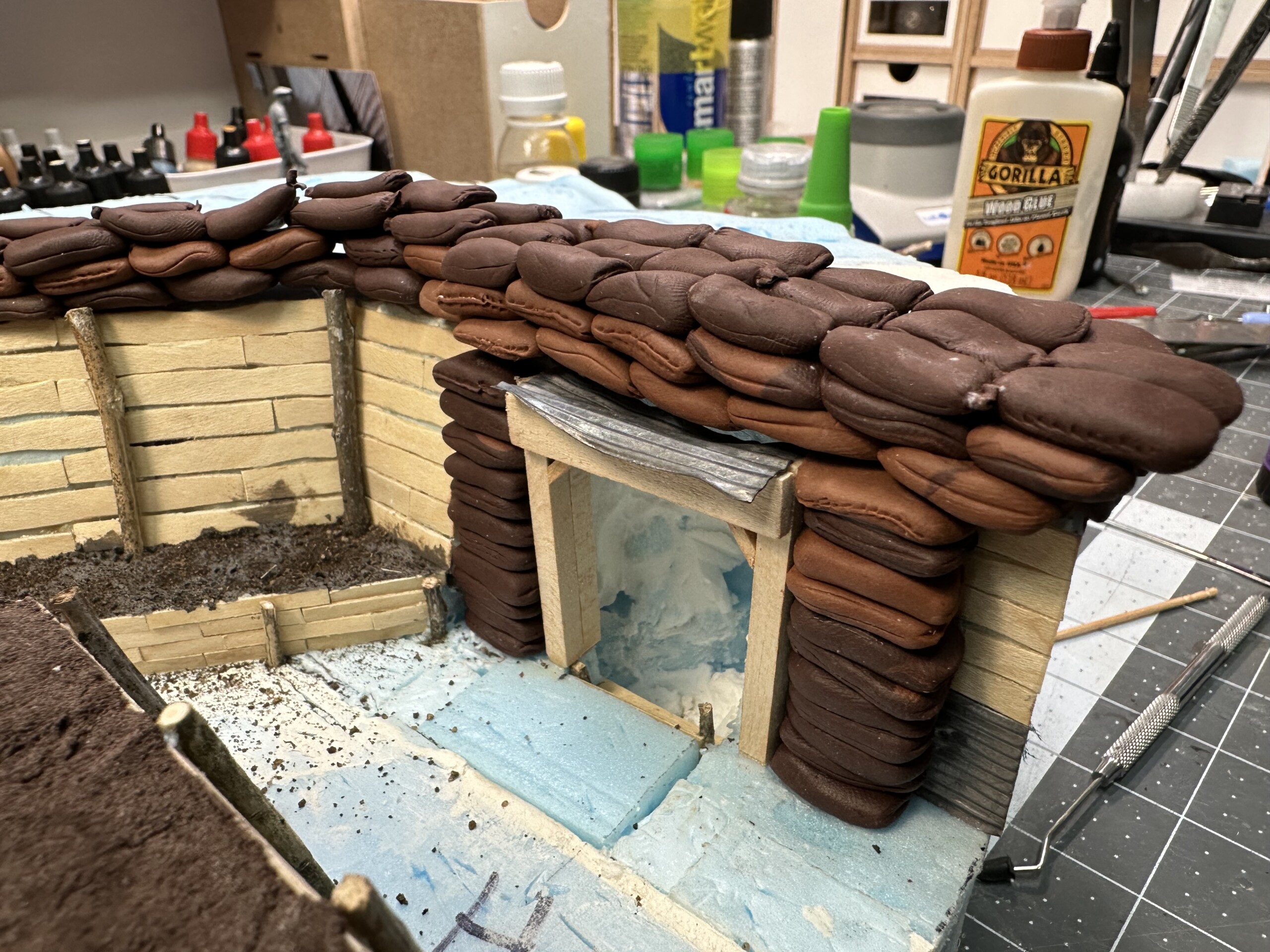 The other challenge with the sculpting was keeping the basic shape right. I used a small two-walled jig to get the right basic shape/size of the sandbag and then worked it with my fingers to get it to the final shape. I used baby powered liberally to keep the clay from sticking to the plastic. Then I would use a dental tool to draw in a seam line or a pair of tweezers to pinch a seam showing the bag turned inside out. Both were used in the trenches. I also sculpted a bunch of thin “tied off” closure of the bags on the top layer where the bags would have been tied off.