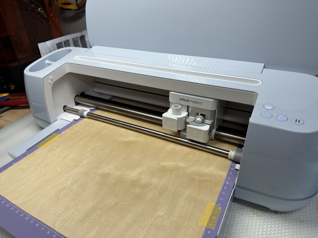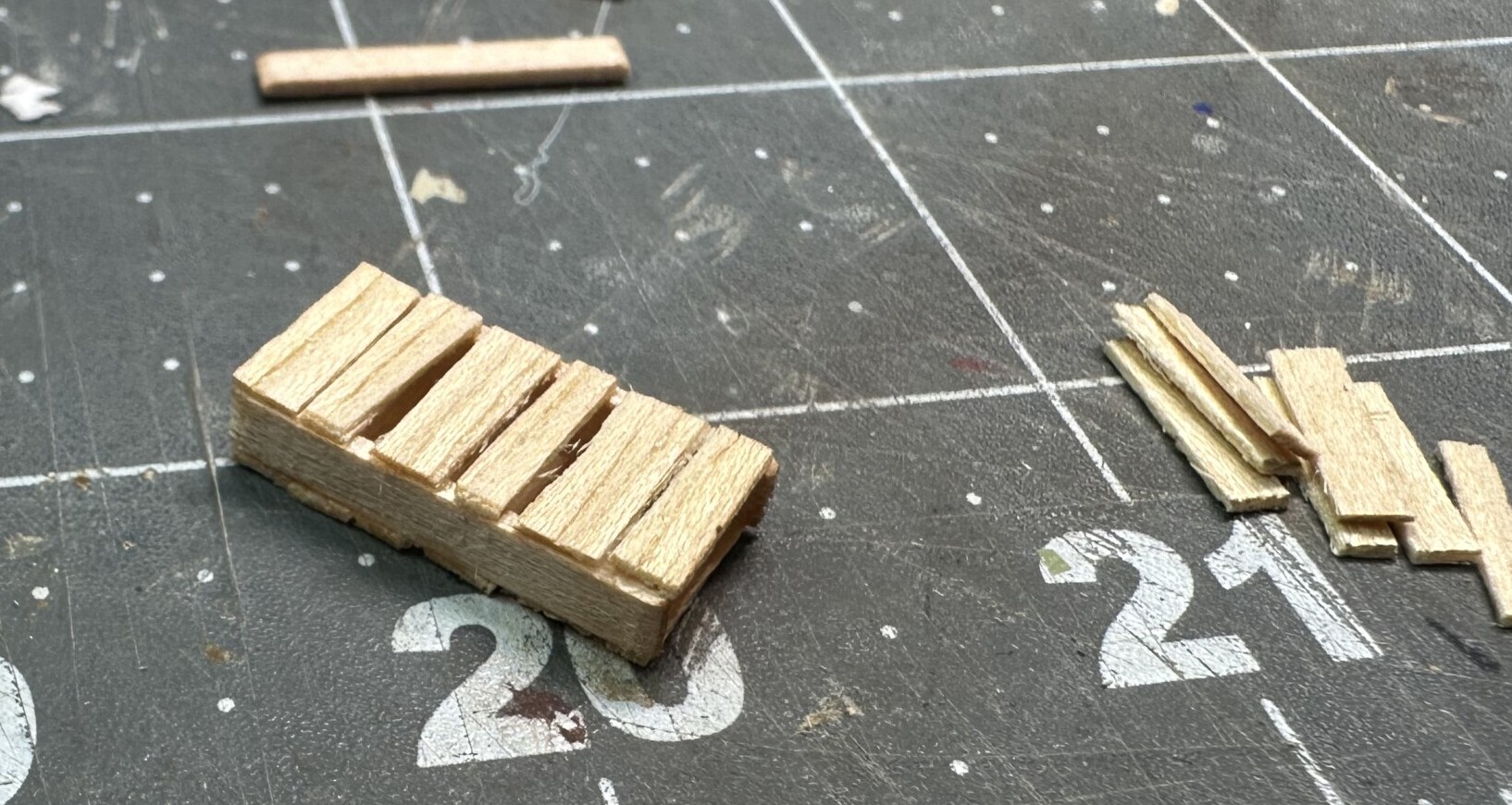 Using my handy Cricut cutter, I cut out a ton of veneer planks. These looked great and I started on the bottom of the step up ledge first. These planks were affixed with AK’s Wolverine PVA. I like this stuff because it dries quick. Although I’m moving more and more to using Aleene’s Tacky Glue.
