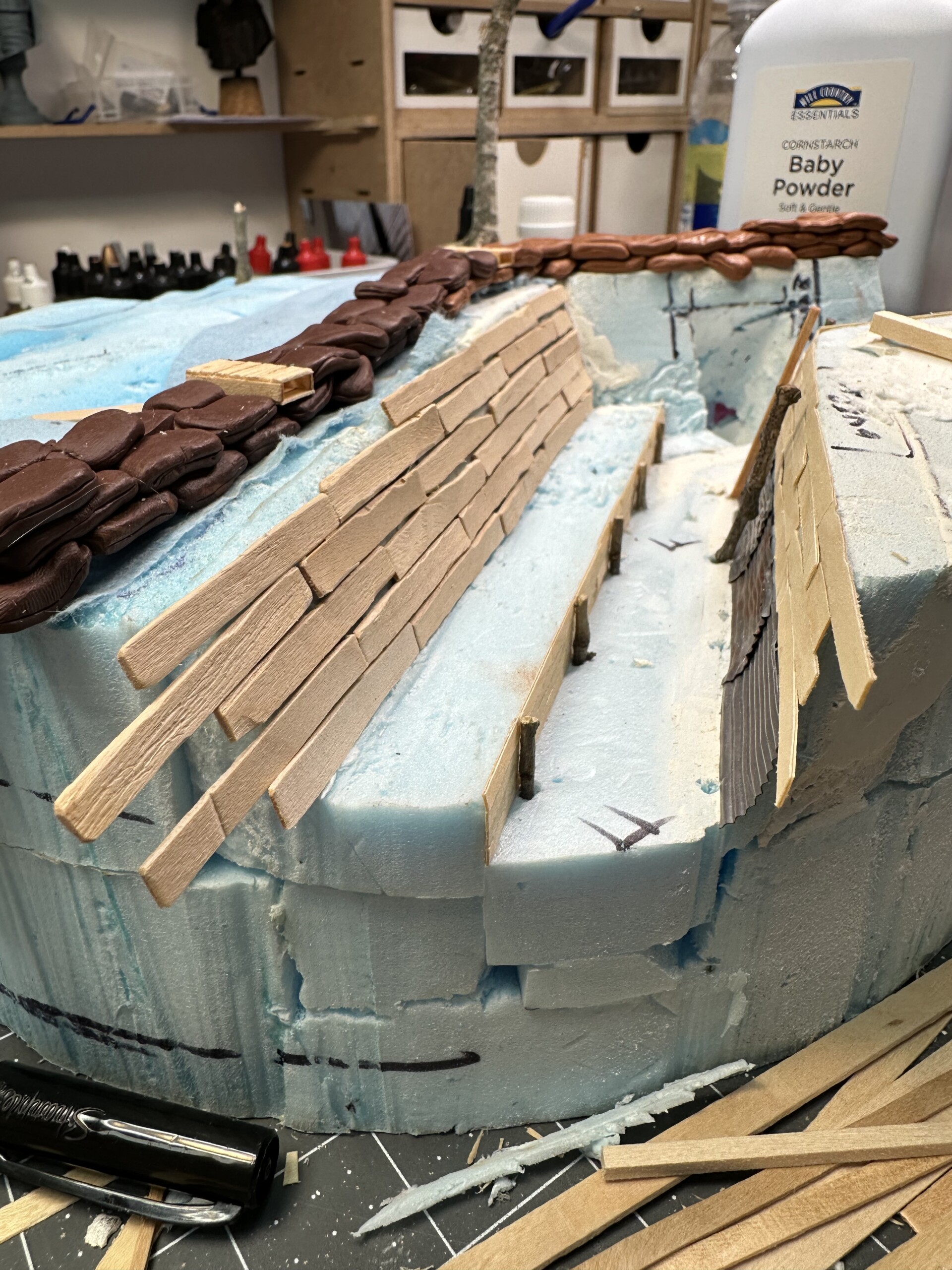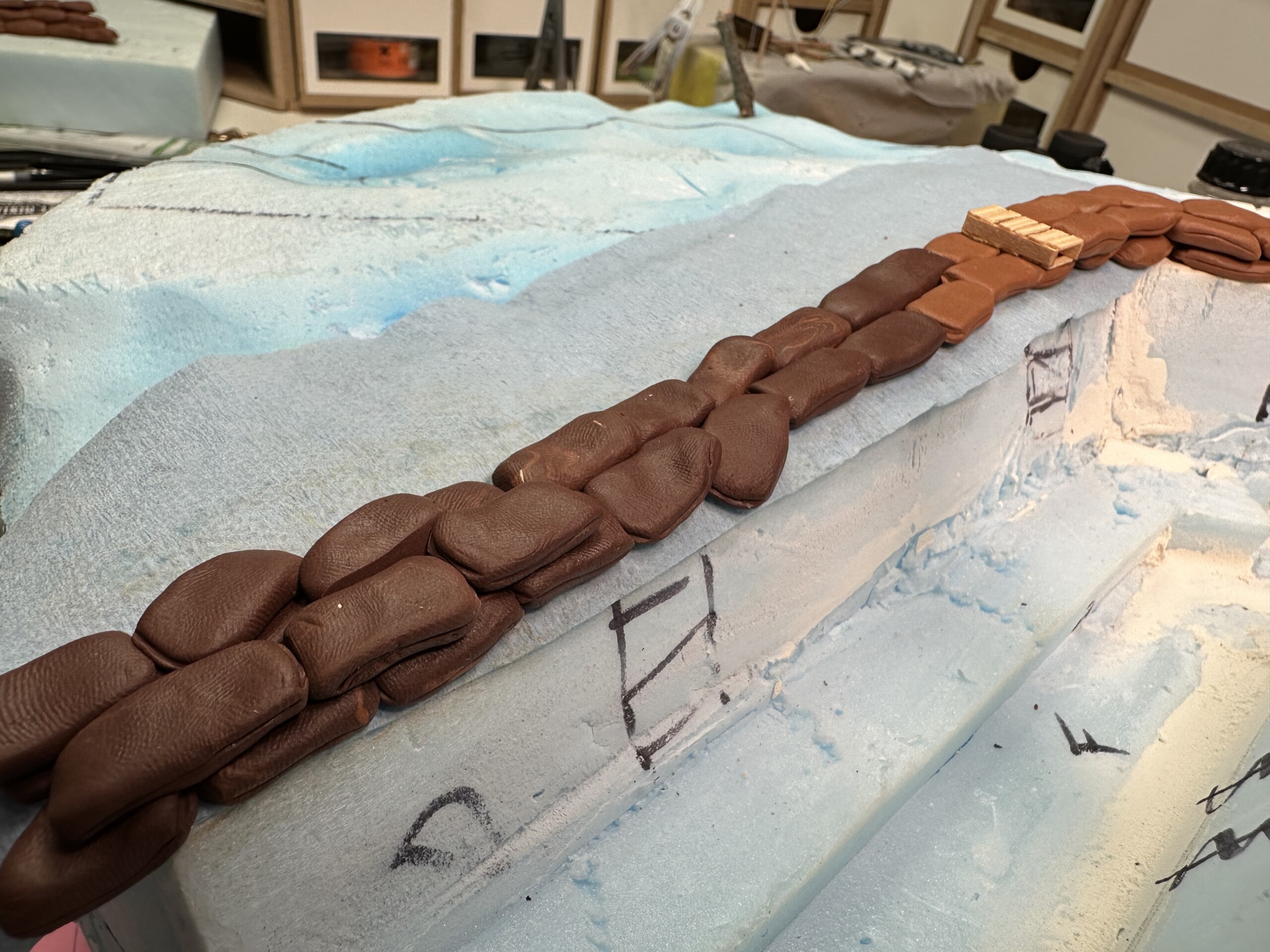 Once I had the foam shaped and glued down, the next step was to build a bunch of sandbags. I wanted them in place before I spent time on much else. Plus, I knew I’d be sculpting for a while and I wanted to do that at the start of the project when enthusiasm was high. I used FIMO oven bake clay to sculpt them. I would absolutely not use this again for this task. The FIMO was great to work with and baked to a rock hard finish. But since I was sculpting on the foam and then remove them, even in sections, to then bake, the final sculpted shape never quite matched the post-bake shape. Next time I’ll use A+B epoxy putty.