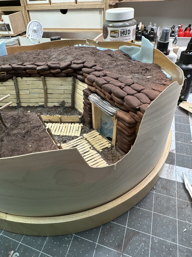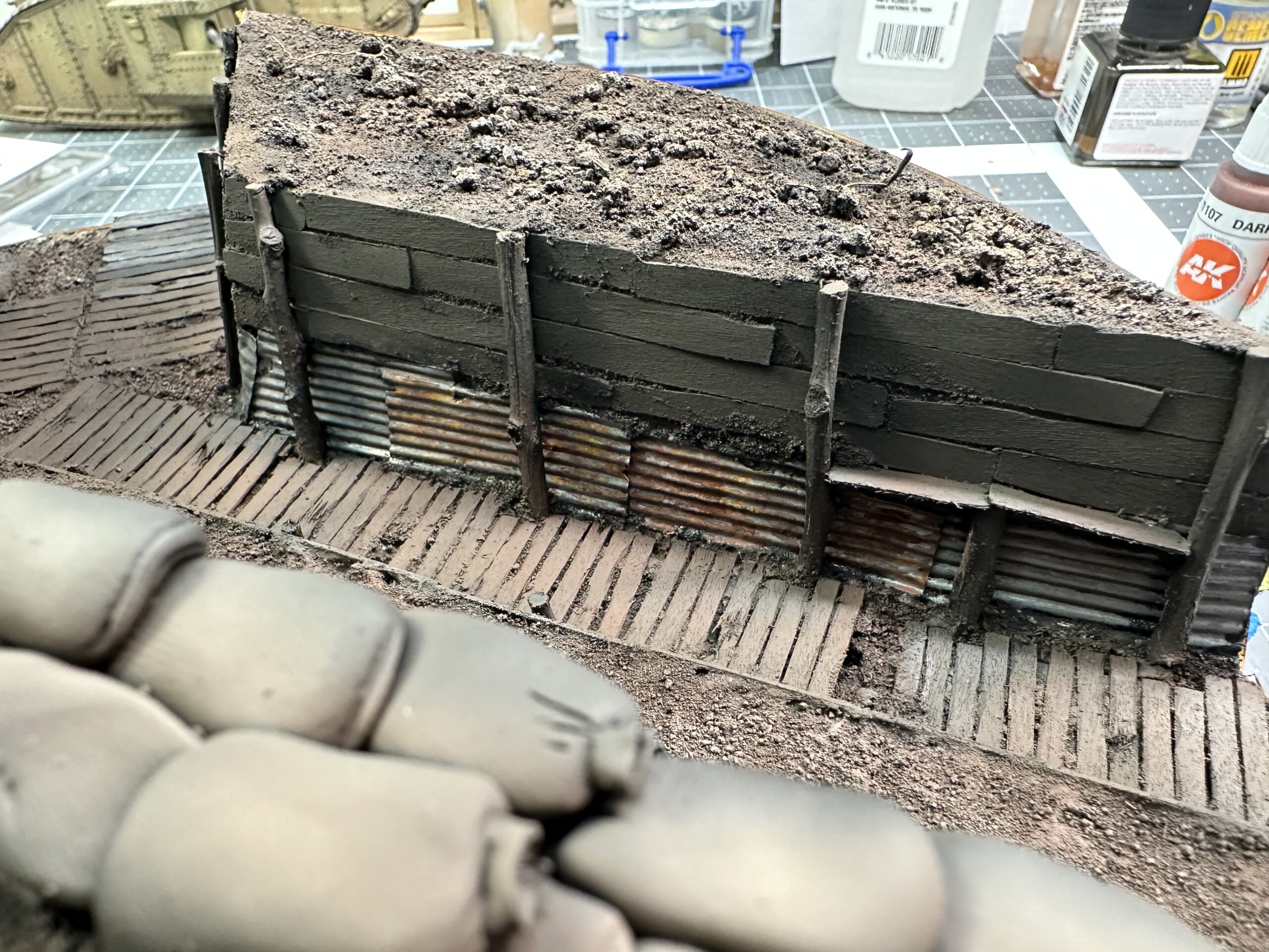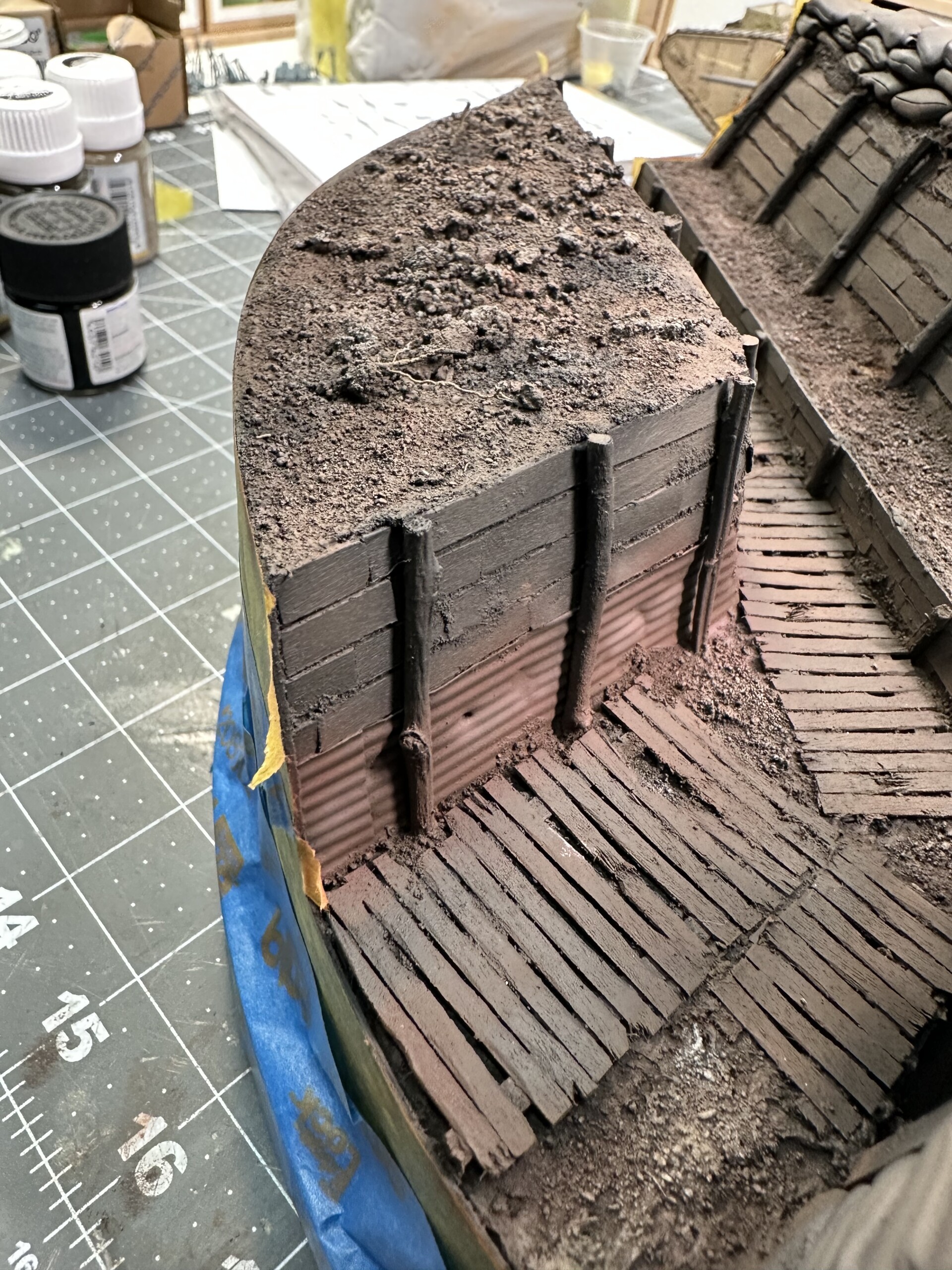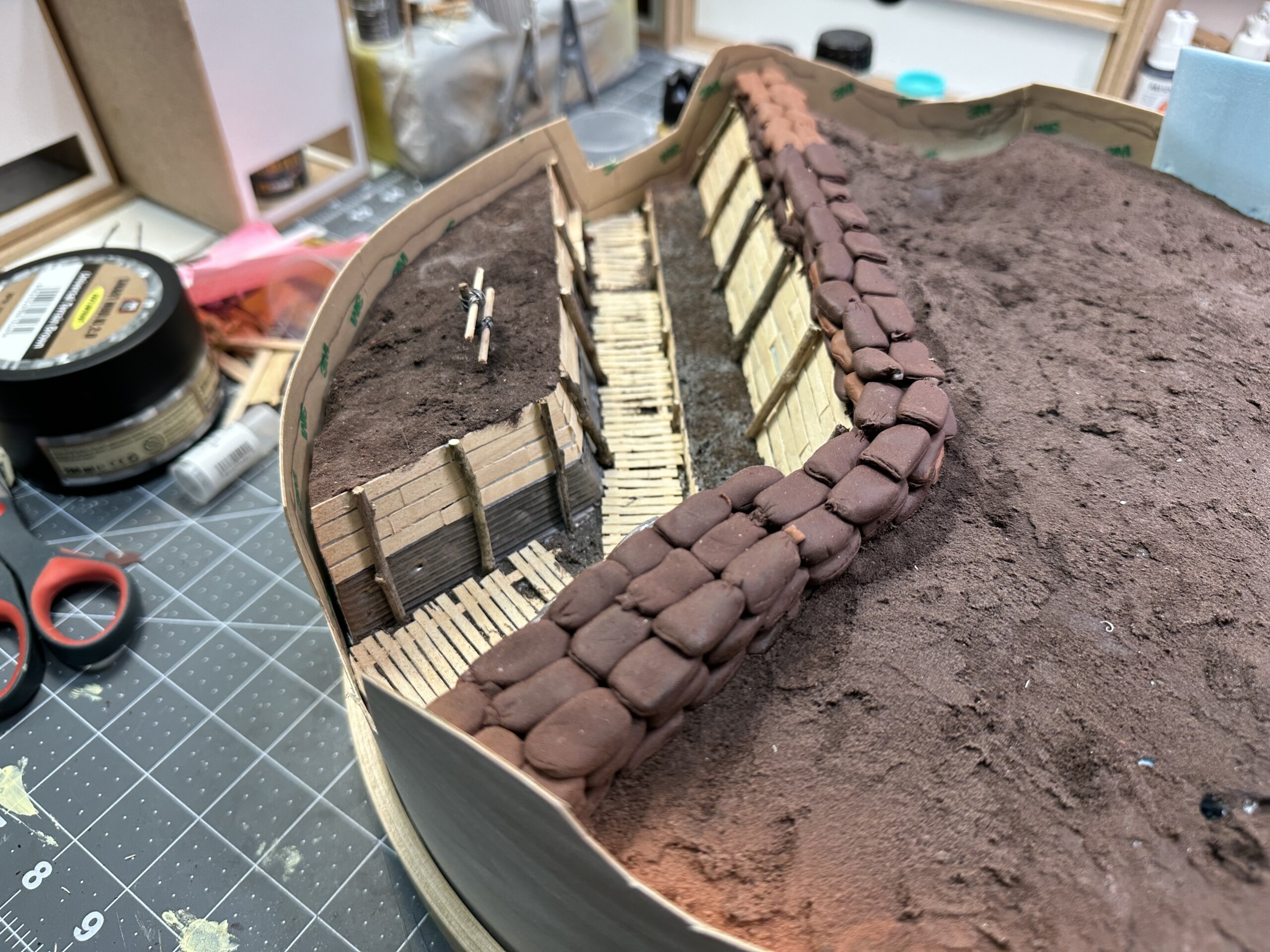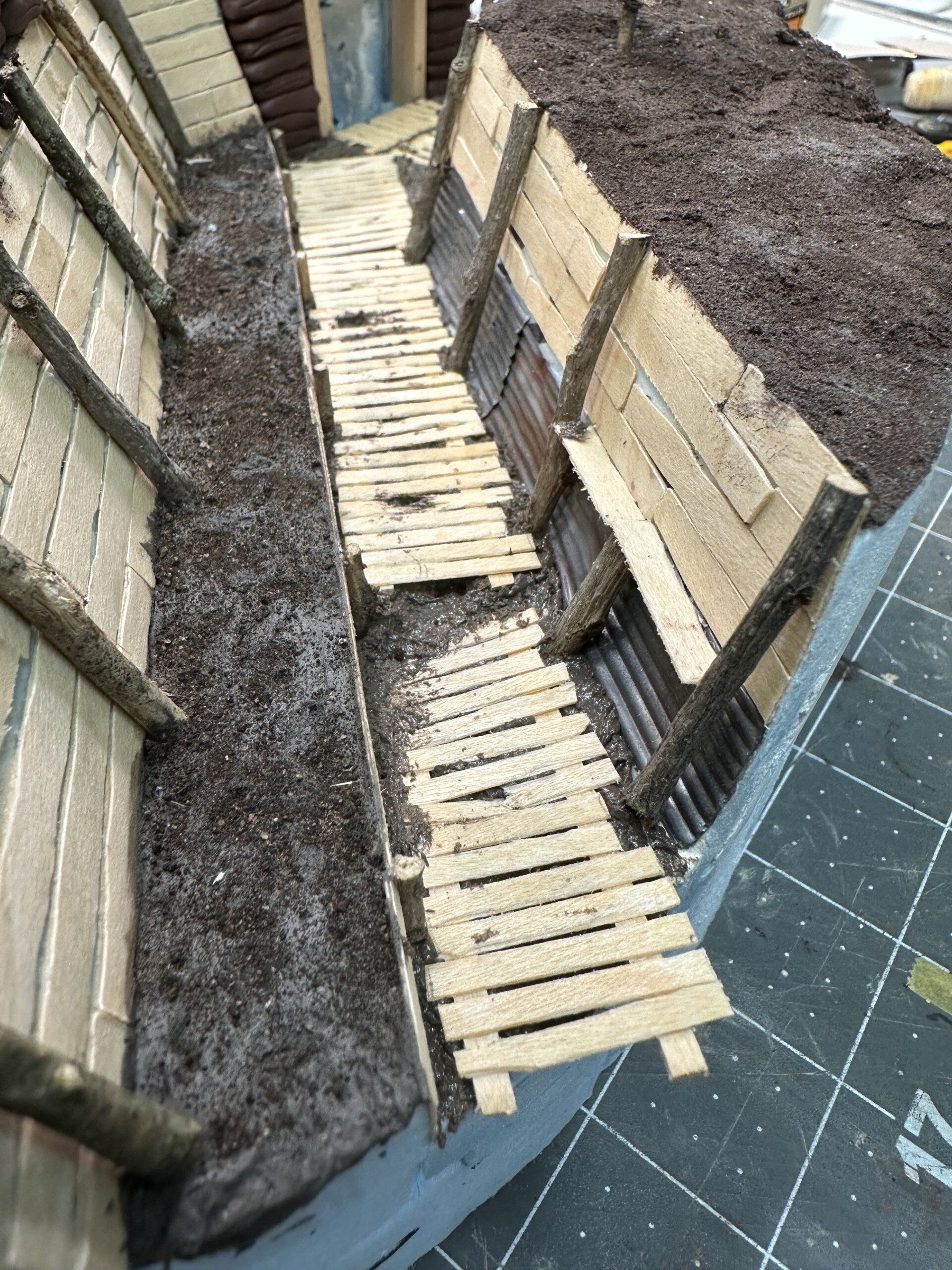 I was rewinding (and rewinding and rewinding….) the movie “1917” to get inspiration for the trenches. One thing I really liked was the “rooms” carved into the side of the trench walls. So of course I had to add one. So I cut it out. Again, without much of a plan, so there were… alterations later”.