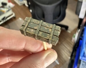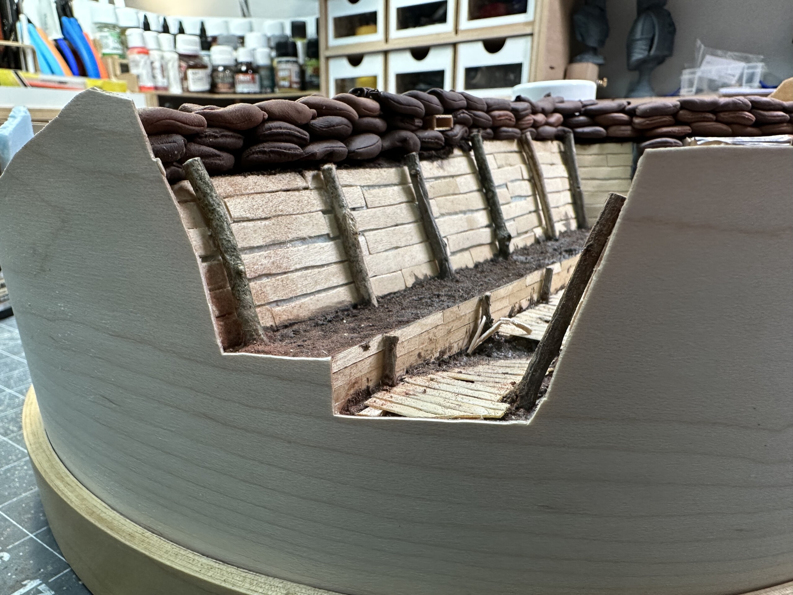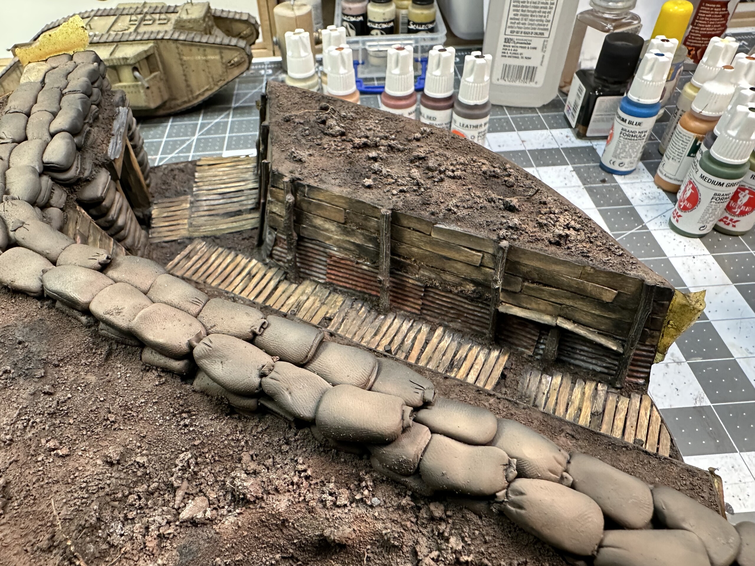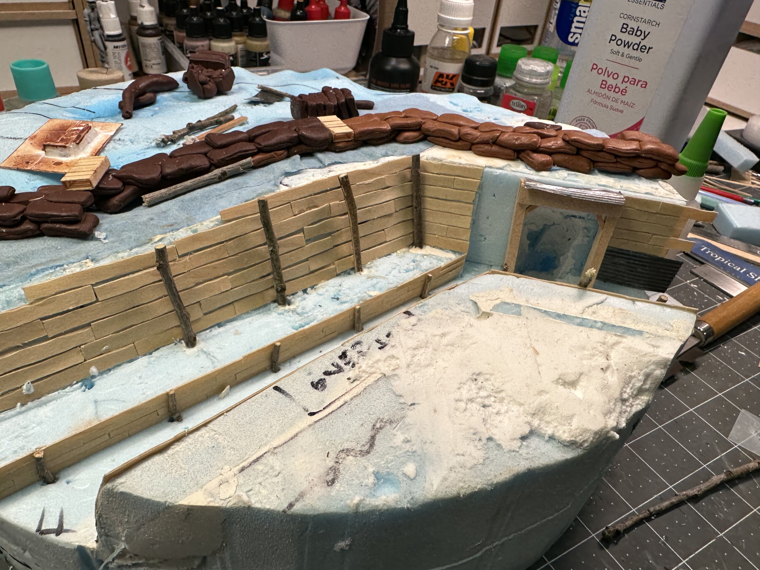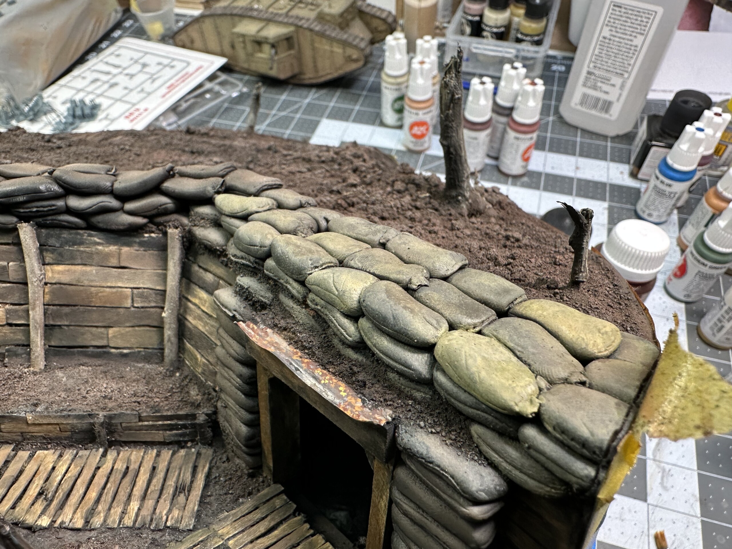 I was rewinding (and rewinding and rewinding….) the movie “1917” to get inspiration for the trenches. One thing I really liked was the “rooms” carved into the side of the trench walls. So of course I had to add one. So I cut it out. Again, without much of a plan, so there were… alterations later”.