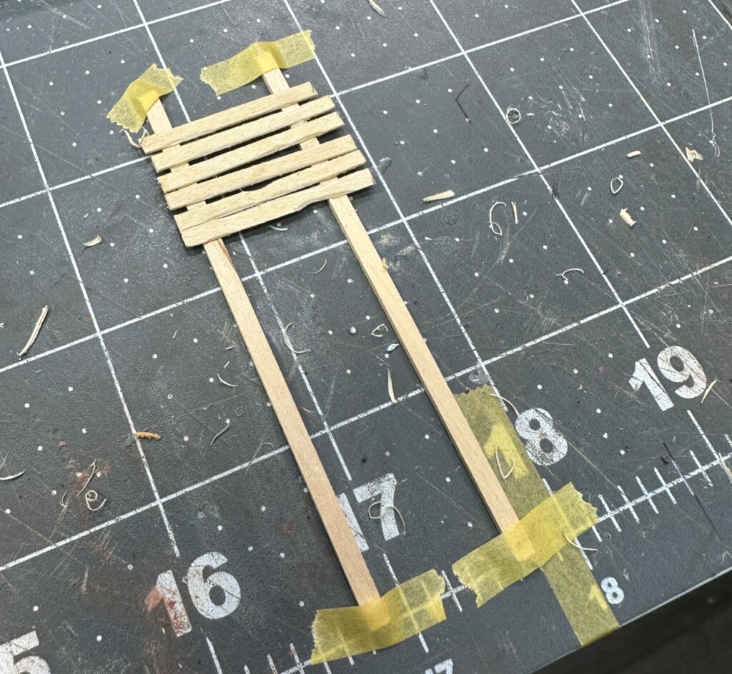 For some reason I thought I’d use a thicker wood (coffee stir sticks) on the front wall… but it just looked really thick and out of scale. So I ripped it out and replaced with the same Cricut cut wood veneer. On all the walls, I used real twigs for the upright supports. All planks were glued in place in a wonky kinda way… trying to show some level of haphazardness.