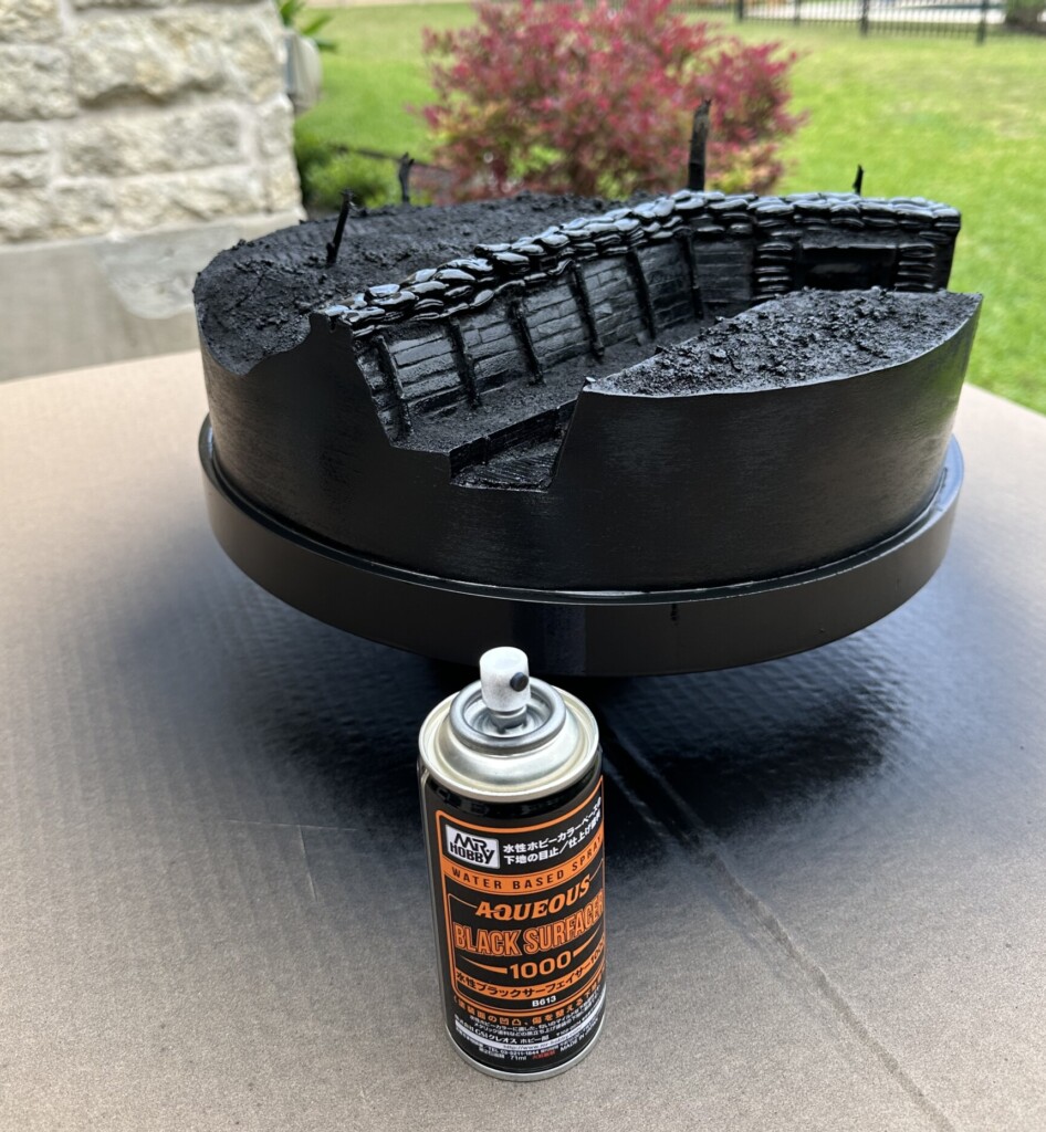 In a recent Nightshift video (can you tell I am a big fan?) about his WWI trench diorama, I learned that he base coated the entire base in black. A common technique for him that helps the colors be deeper, more muted. I wanted to do the same to get the same effect. I don’t know that I’ll do this again… but more on that below. In the meantime, I used the Mr. Hobby Aqueous Black Surfacer 1000 in the spray can. It sprayed well and didn’t eat at the foam since it’s water based. Highly recommended as a paint, if not as a technique. (Nightshift has since stopped doing this, from what I understand)