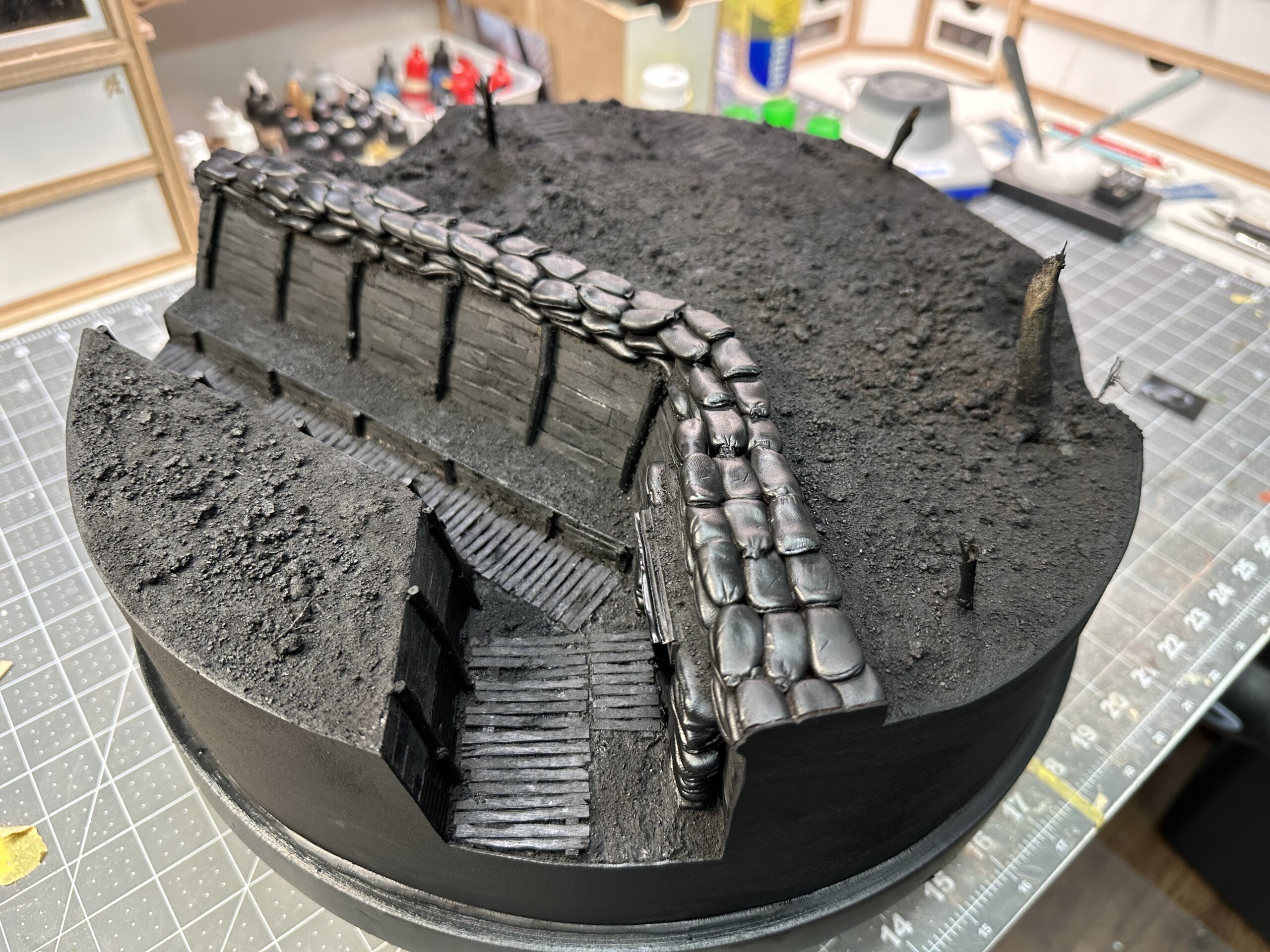 It was time to paint the sandbags for real. This was all done with a brush and a lot of stippling. I’m not totally satisfied with the look (trying to recreate canvas), but hey, it’s not horrible either. Looks better in person than the photo shows.