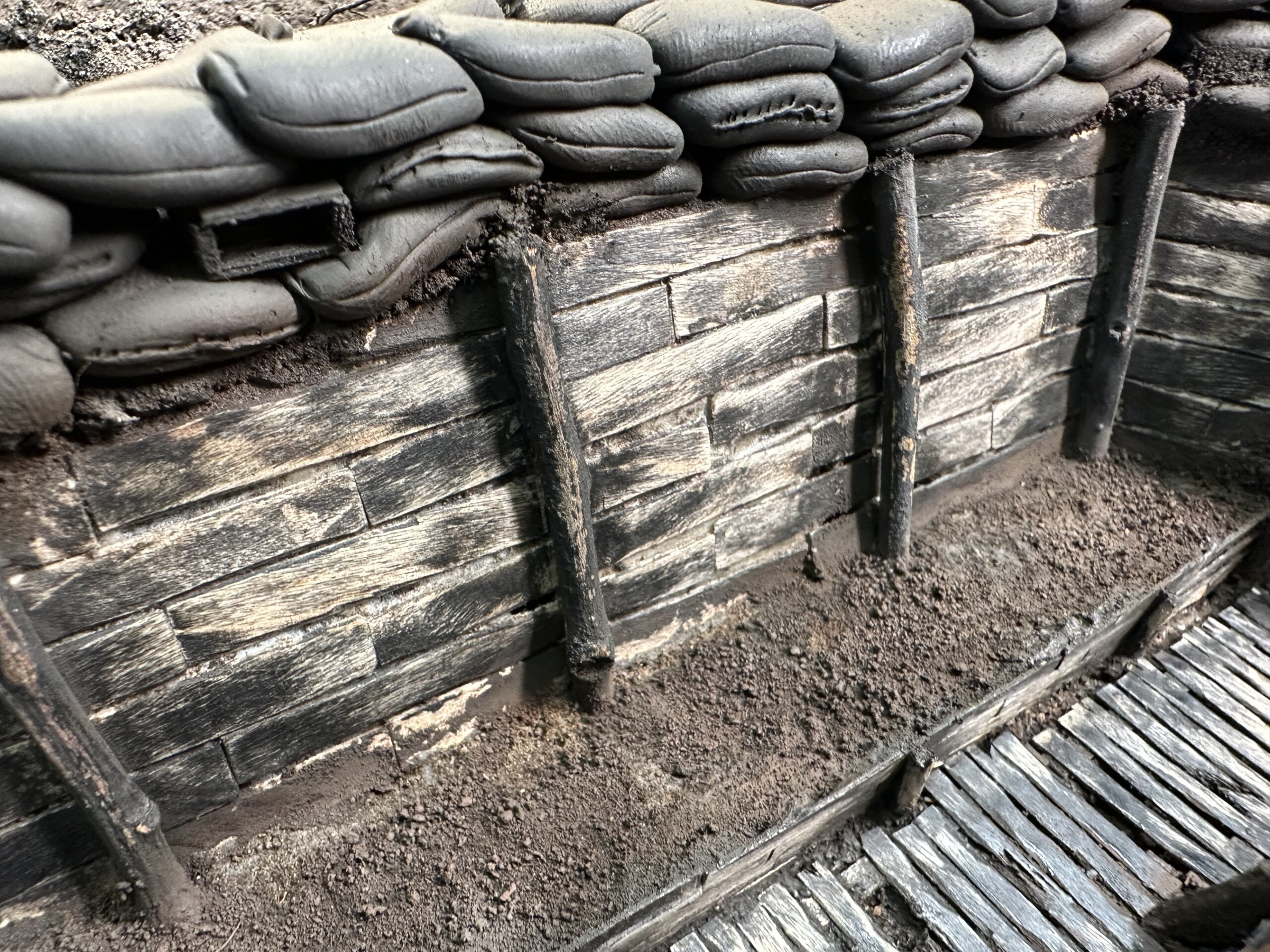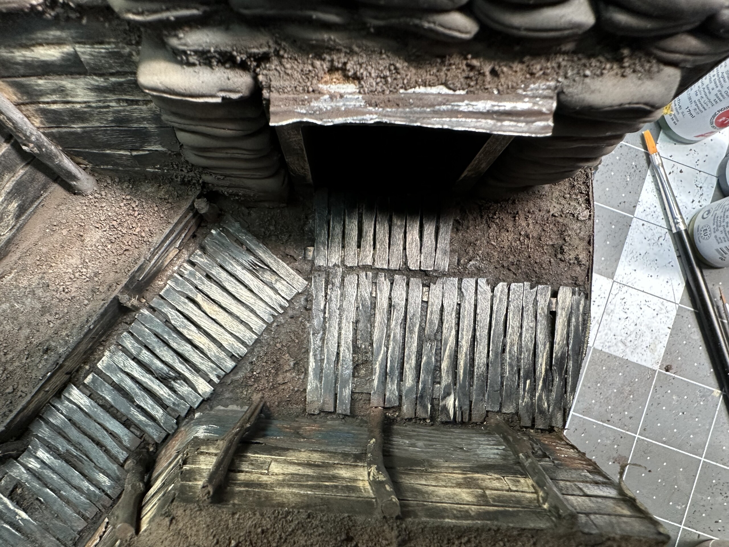 And funny story… when I started working on adding wood tones to the black primed real wood planks, I was equally unsatisfied. So first I tried to sand the black paint off. Then I tried to use the AK Paint Stripper. Then more sanding. Then sanding again with different tools. It removed much of the black primer but daaaayyyyummm was this stuff stuck on. Fortunately I was able to use this lingering black to help sell the “this trench is covered in grime” feel and layering on various wood tones turned out pretty good. Not perfect, but not terrible.