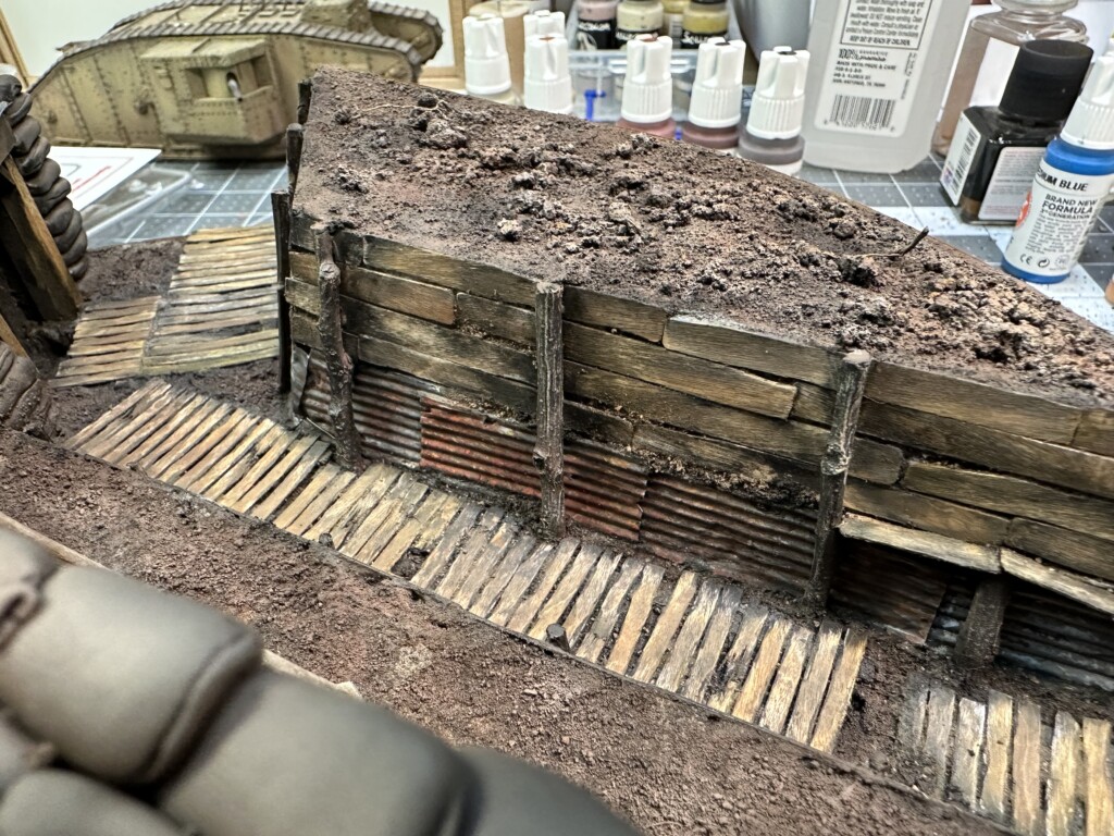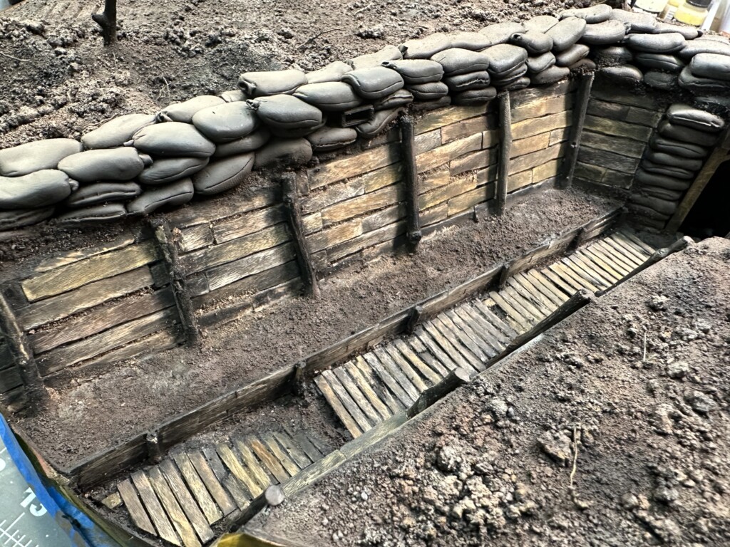 Next up was the dirt/mud that needed to be put into the trench floor. I laid down quite a bit and covered a good portion of the wooden walkways, as references showed. The mud here was the Mig Ammo muddy ground (or something like that). It was OK… not as awesome as the Smart Mud to work with, but also better for this application. When it was drying, I sprinkled medium and fine sifted dirt over the trench floor. Once everything was dry, I came back in with some sand paper and a rounded scalpel blade and re-exposed some of the wood in places. I also touched up some paint to help highlight the wood.