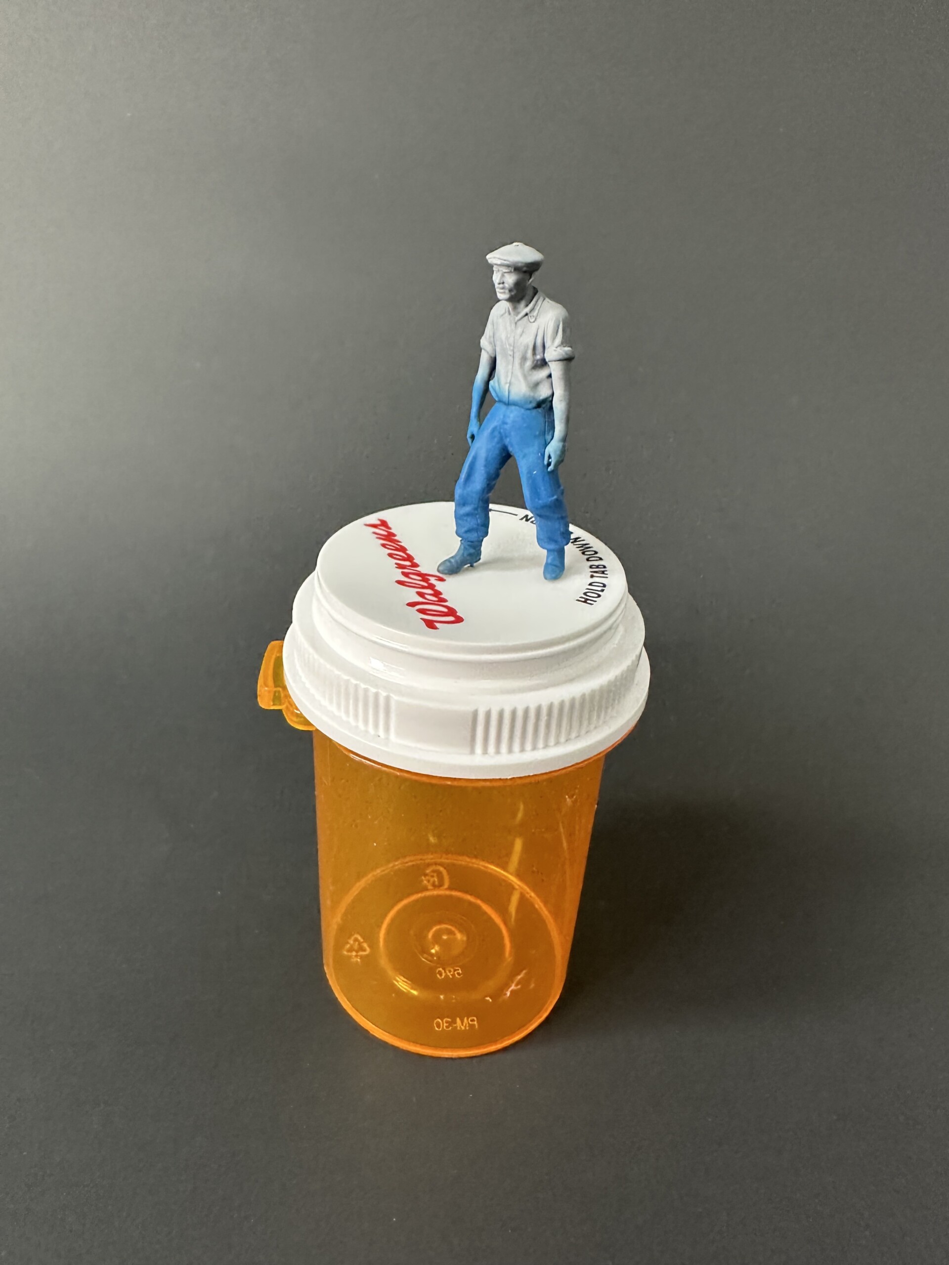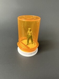 I drilled a small hole in the lid and stick the pin from the figure’s foot through the hole. A glob of super glue locked it in place. I’m going to continue trying other things (hot glue for one) since the super glue required accelerator to stick… and even then it’s really not sticking to the lid as much as creating a mechanical “lock” effect between the dried glue glob on one side of the lid and the figure’s foot on the other side.
